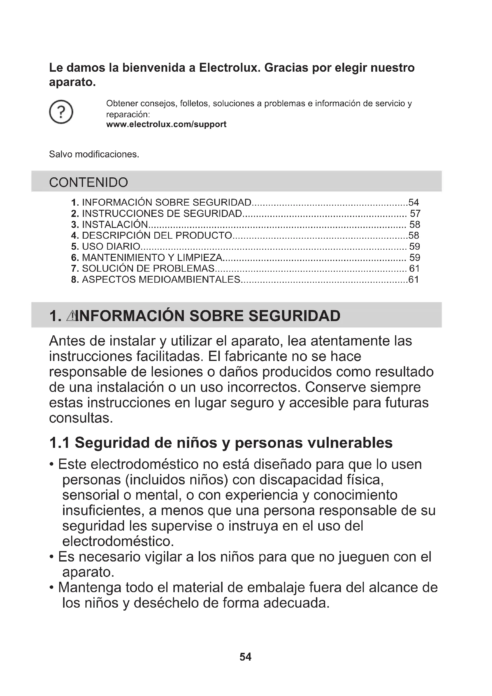 - Mantenga todo el material de embalaje fuera del alcance de los niños y deséchelo de forma adecuada. 54• Mantenga a los niños y mascotas alejados del aparato cuando esté funcionando.