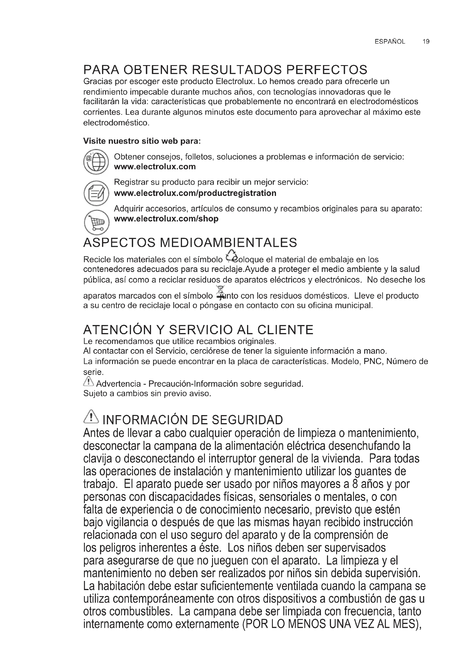Gracias por escoger este producto Electrolux Lo hemos creado para ofrecerle un rendimiento impecable durante muchos años, con tecnologías innovadoras que le facilitarán la vida: características que probablemente no encontrará en electrodomésticos corrientes Lea durante algunos minutos este documento para aprovechar al máximo este electrodoméstico Visite nuestro sitio web para: Obtener consejos, folletos, soluciones a problemas e información de servicio: www.electrolux.com Registrar su producto para recibir un mejor servicio: www.electrolux.com/productregistration Adquirir accesorios, artículos de consumo y recambios originales para su aparato: www.electrolux.com/shop ASPECTOS MEDIOAMBIENTALES Recicle los materiales con el símbolo Coloque el material de embalaje en los contenedores adecuados para su reciclajeAyude a proteger el medio ambiente y la salud pública, así como a reciclar residuos de aparatos eléctricos y electrónicos No deseche los aparatos marcados con el símbolo junto con los residuos domésticos Lleve el producto a su centro de reciclaje local o póngase en contacto con su ocina municipal.