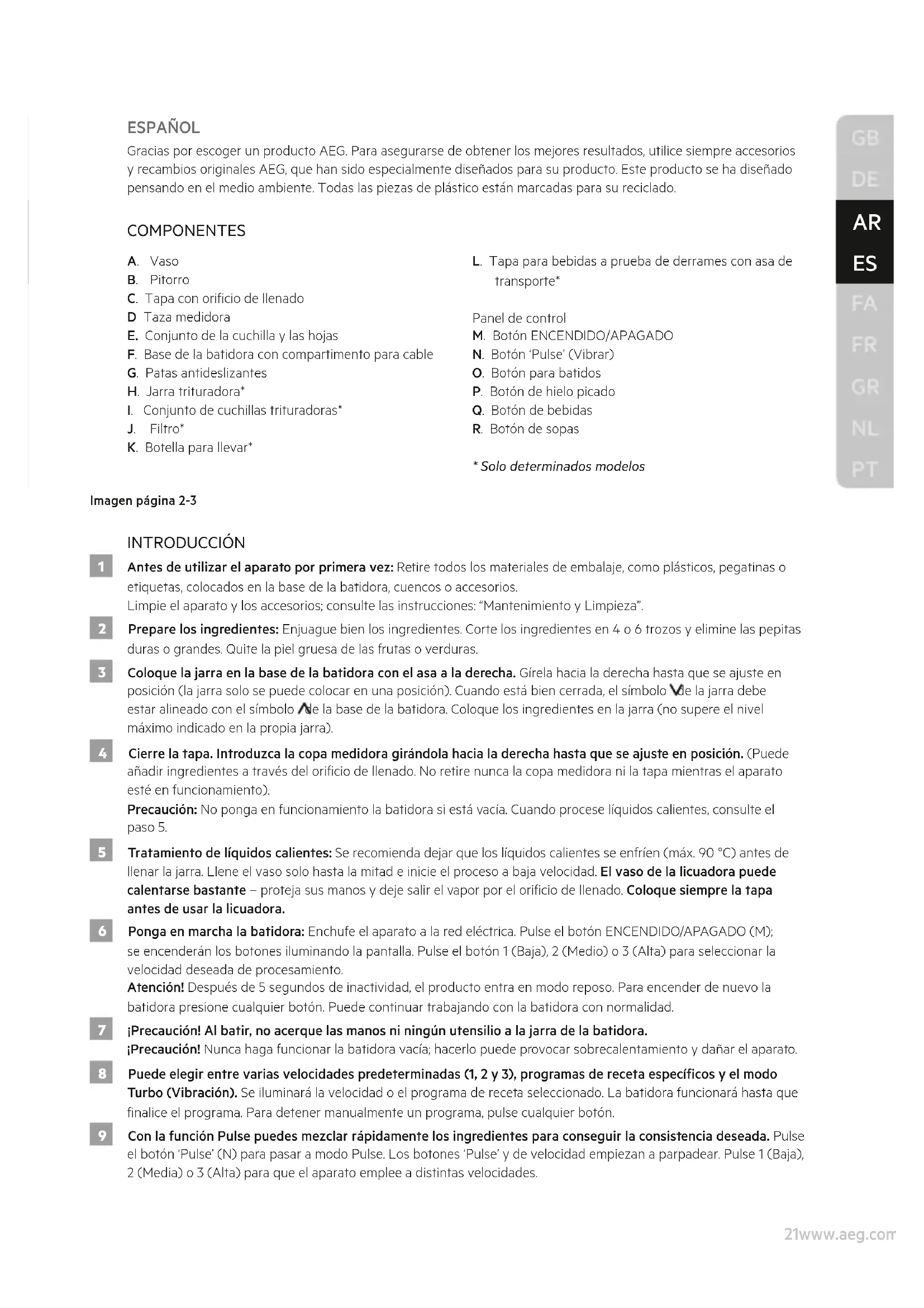 - Solo determinados modelos Imagen página 2-3 INTRODUCCIÓN 1 Antes de utilizar el aparato por primera vez: Retire todos los materiales de embalaje, como plásticos, pegatinas o etiquetas, colocados en la base de la batidora, cuencos o accesorios. Limpie el aparato y los accesorios; consulte las instrucciones: “Mantenimiento y Limpieza”. 2 Prepare los ingredientes: Enjuague bien los ingredientes. Corte los ingredientes en 4 o 6 trozos y elimine las pepitas duras o grandes. Quite la piel gruesa de las frutas o verduras. 3 Coloque la jarra en la base de la batidora con el asa a la derecha. Gírela hacia la derecha hasta que se ajuste en posición (la jarra solo se puede colocar en una posición). Cuando está bien cerrada, el símbolo de la jarra debe estar alineado con el símbolo de la base de la batidora. Coloque los ingredientes en la jarra (no supere el nivel máximo indicado en la propia jarra). 4 Cierre la tapa. Introduzca la copa medidora girándola hacia la derecha hasta que se ajuste en posición. (Puede añadir ingredientes a través del oricio de llenado. No retire nunca la copa medidora ni la tapa mientras el aparato esté en funcionamiento). Precaución: No ponga en funcionamiento la batidora si está vacía. Cuando procese líquidos calientes, consulte el paso 5. 5 Tratamiento de líquidos calientes: Se recomienda dejar que los líquidos calientes se enfríen (máx. 90 °C) antes de llenar la jarra. Llene el vaso solo hasta la mitad e inicie el proceso a baja velocidad. El vaso de la licuadora puede calentarse bastante – proteja sus manos y deje salir el vapor por el oricio de llenado. Coloque siempre la tapa antes de usar la licuadora. 6 Ponga en marcha la batidora: Enchufe el aparato a la red eléctrica. Pulse el botón ENCENDIDO/APAGADO (M); se encenderán los botones iluminando la pantalla. Pulse el botón 1 (Baja), 2 (Medio) o 3 (Alta) para seleccionar la velocidad deseada de procesamiento. Atención! Después de 5 segundos de inactividad, el producto entra en modo reposo. Para encender de nuevo la batidora presione cualquier botón. Puede continuar trabajando con la batidora con normalidad. 7 ¡Precaución! Al batir, no acerque las manos ni ningún utensilio a la jarra de la batidora. ¡Precaución! Nunca haga funcionar la batidora vacía; hacerlo puede provocar sobrecalentamiento y dañar el aparato. 8 Puede elegir entre varias velocidades predeterminadas (1, 2 y 3), programas de receta especícos y el modo Turbo (Vibración). Se iluminará la velocidad o el programa de receta seleccionado. La batidora funcionará hasta que nalice el programa. Para detener manualmente un programa, pulse cualquier botón. 9 Con la función Pulse puedes mezclar rápidamente los ingredientes para conseguir la consistencia deseada. Pulse el botón ‘Pulse’ (N) para pasar a modo Pulse. Los botones ‘Pulse’ y de velocidad empiezan a parpadear. Pulse 1 (Baja), 2 (Media) o 3 (Alta) para que el aparato emplee a distintas velocidades.22 www.aeg.com 10 El aparato viene con diversos programas de receta. Puede elegir entre una serie de recetas: hielo picado (P), bebidas* (Q), batidos (O) y sopas (R) (*dependiendo del modelo). La batidora se parará automáticamente cuando nalice el programa. Atención! Después de 5 segundos de inactividad, el producto entra en modo reposo. Para encender de nuevo la batidora presione cualquier botón. Puede continuar trabajando con la batidora con normalidad. USO DE LA TRITURADORA* (* SOLO EN DETERMINADOS MODELOS) 11 Introduzca los ingredientes en la jarra troceadora (H). Apriete el conjunto de cuchilla multipicadora (I) en el extremo abierto de la botella girándolo hacia la izquierda. Coloque la jarra trituradora en posición invertida. Presione la jarra trituradora hacia abajo en la base de la batidora (F) y gírela a la derecha para bloquearla. Nota: Cuando se bloquea, el símbolo del conjunto de la cuchilla del molinillo debe quedar alineado con el símbolo de la base de la batidora. ¡Precaución! Las cuchillas están muy aladas! USO DEL FILTRO* (* SOLO EN DETERMINADOS MODELOS) 12 Para hacer zumo: Introduzca el ltro (J) en la jarra. Coloque el ltro en la jarra con la parte ancha hacia arriba. Ponga en línea la arista interior de la jarra de la batidora con el corte de la parte inferior del ltro para que este ajuste correctamente. Ponga frutas en el ltro (no use la batidora para triturar semillas grandes como las de ciruela o agua- cate). Apriete la tapa con la copa medidora e inicie el exprimido.