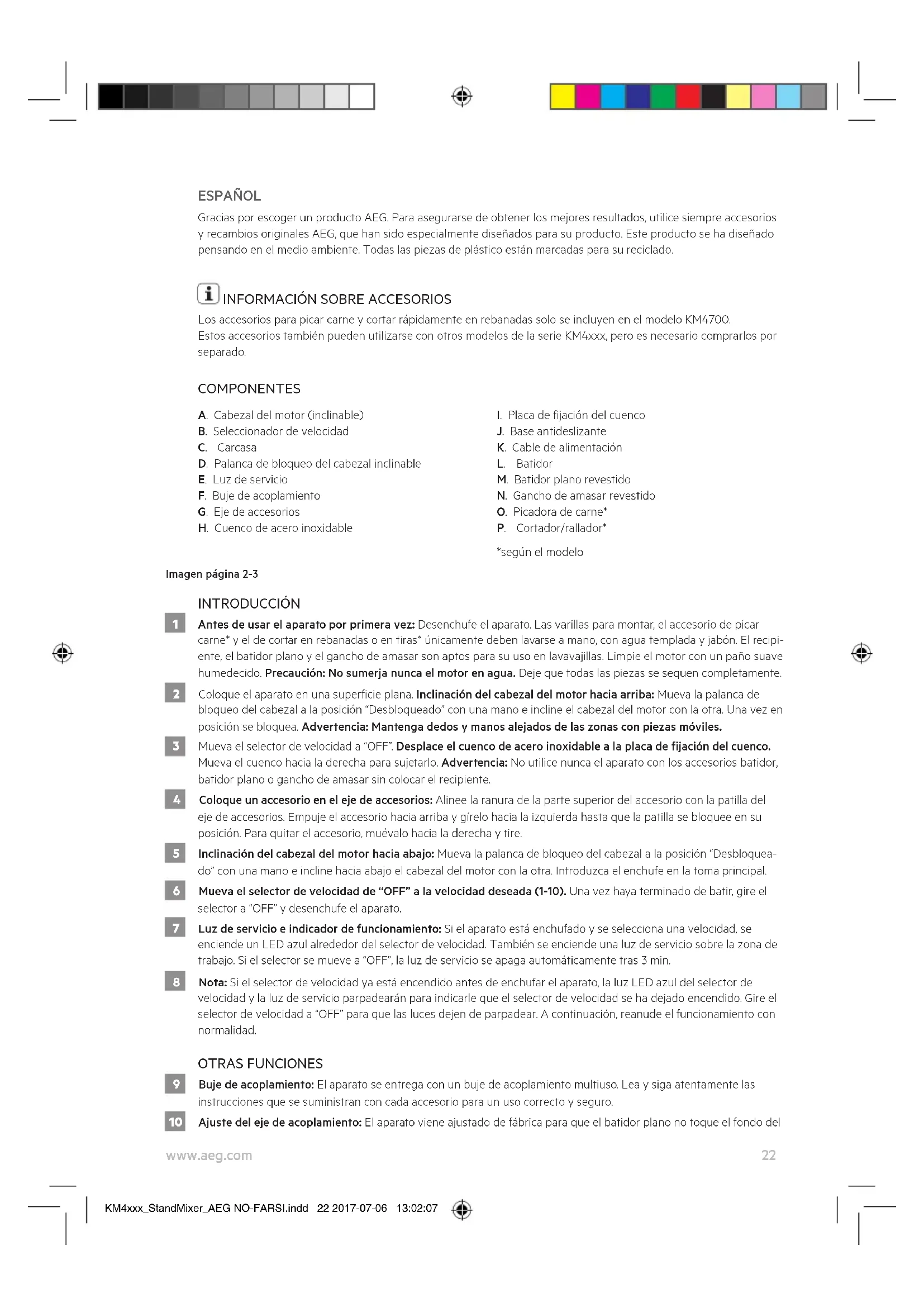 AEG KM4xxx_StandMixer_AEG NO-FARSI.indd 21 2017-07-06 13:02:0722 www.aeg.com ESPAÑOL Gracias por escoger un producto AEG. Para asegurarse de obtener los mejores resultados, utilice siempre accesorios y recambios originales AEG, que han sido especialmente diseñados para su producto. Este producto se ha diseñado pensando en el medio ambiente. Todas las piezas de plástico están marcadas para su reciclado.