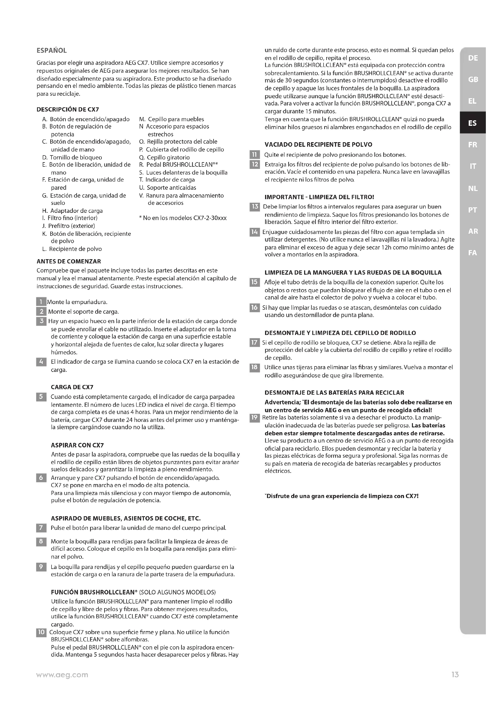 FAESPAŃOL Gracias por elegir una aspiradora AEG CX7. Utilice siempre accesorios y repuestos originales de AEG para asegurar los mejores resultados. Se han diseńado especialmente para su aspiradora. Este producto se ha diseńado pensando en el medio ambiente. Todas las piezas de plástico tienen marcas para su reciclaje.
