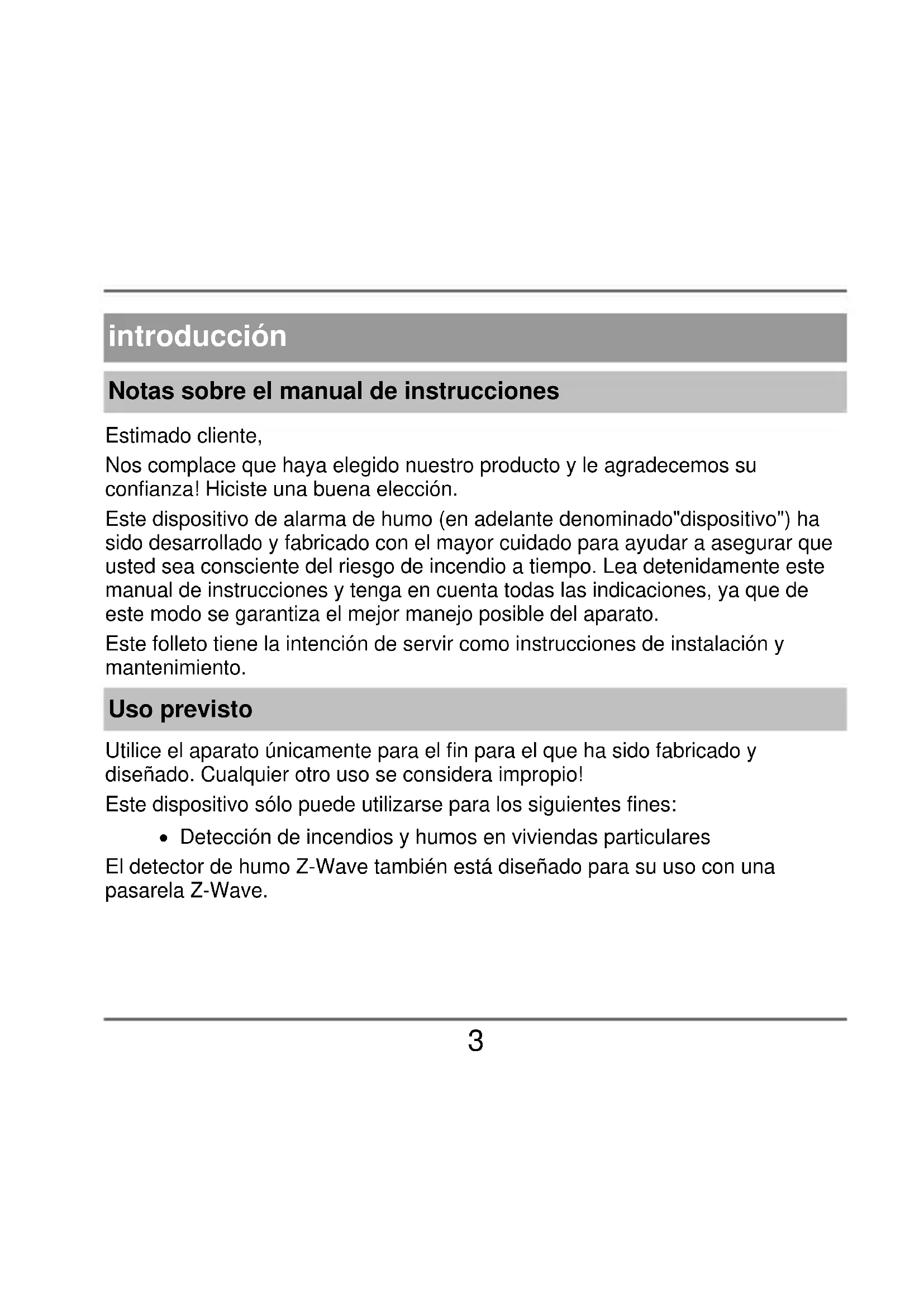 - declaración de rendimiento introducción Notas sobre el manual de instrucciones Estimado cliente, Nos complace que haya elegido nuestro producto y le agradecemos su confianza! Hiciste una buena elección. Este dispositivo de alarma de humo (en adelante denominado"dispositivo") ha sido desarrollado y fabricado con el mayor cuidado para ayudar a asegurar que usted sea consciente del riesgo de incendio a tiempo. Lea detenidamente este manual de instrucciones y tenga en cuenta todas las indicaciones, ya que de este modo se garantiza el mejor manejo posible del aparato. Este folleto tiene la intención de servir como instrucciones de instalación y mantenimiento. Uso previsto Utilice el aparato únicamente para el fin para el que ha sido fabricado y diseñado. Cualquier otro uso se considera impropio! Este dispositivo sólo puede utilizarse para los siguientes fines: Detección de incendios y humos en viviendas particulares El detector de humo Z-Wave también está diseñado para su uso con una pasarela Z-Wave.5 Limitación de responsabilidad Sus derechos se limitan a la reparación o sustitución de este producto tal y como ha sido entregado. ABUS Security Center no asume ninguna responsabilidad por ningún daño especial, incidental o consecuente, incluyendo pero no limitado a la pérdida de ingresos, pérdida de ganancias, restricciones en el uso del software, pérdida o recuperación de datos, costos de reemplazo de equipos, tiempo de inactividad, daños a la propiedad y reclamaciones de terceros, como resultado y en conexión con el uso del software.a. garantía, contractual, legal o reclamaciones por daños y perjuicios a pesar de otras disposiciones de garantía limitada o implícita, o en el caso de que la garantía limitada no se aplique, el alcance de la responsabilidad de ABUS Security Center se limita al precio de compra del producto. El contenido de este manual está sujeto a cambios sin previo aviso. ABUS Security-Center GmbH & Co KG, 10/20185 avisos de seguridad explicación de símbolos Los siguientes símbolos se utilizan en el manual o en el dispositivo: ídolo palabra de advertenci p. 263