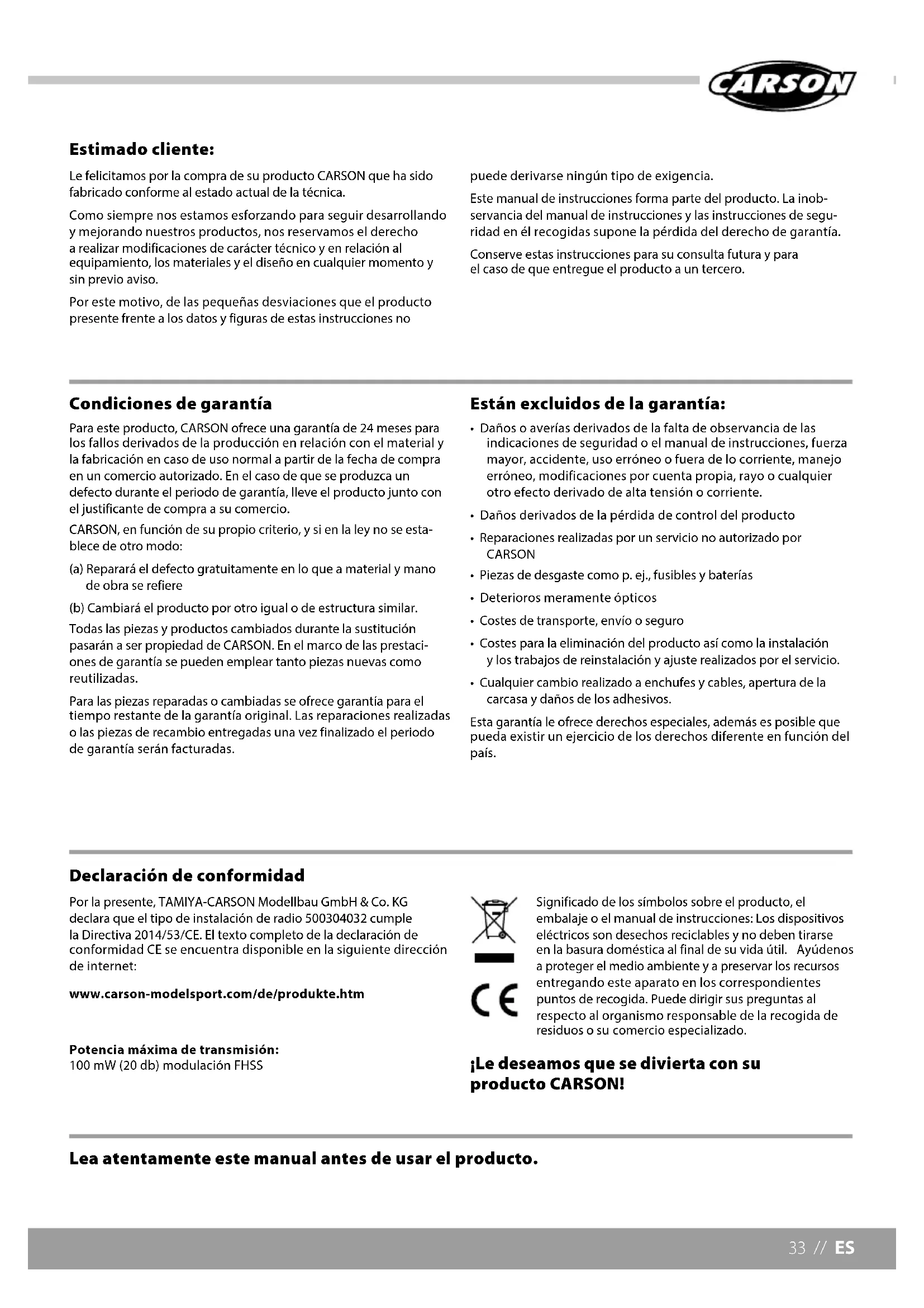 - Non provare mai a caricare batterie a secco (solo gli accumula- tori possono essere ricaricati). Istruzioni di sicurezza e uso conforme Questo prodotto, progettato esclusivamente a scopo di svago, può essere impiegato unicamente in spazi appositamente previsti. L‘uso di questo modello per il trasporto di persone o animali è vietato. Per evitare errori di utilizzo è assolutamente necessario leggere le istruzioni d‘uso prima di impiegare il prodotto! Questi modelli possono essere utilizzati solo se la carrozzeria è opportunamente applicata. Prestare particolare attenzione nel rimuovere la carrozzeria, poiché alcune parti raggiungono temperature molto elevate durante la marcia. Dato che alcuni modelli possono raggiungere livelli di rumore particolarmente elevati, si raccomanda di non tenerli costantemente accesi nelle immediate vicinanze delle persone. Prima di ciascuna marcia accertarsi che il serbatoio sia ben chiuso e che l‘accumulatore sia montato correttamente. Per evitare che il modello viaggi in presenza di anomalie nel sistema di comando e che quindi possa procedere in modo incontrollato, accertarsi che le batterie del trasmettitore e del modello siano in buone condizioni. Prima e dopo ciascun utilizzo verificare sempre che il modello sia montato correttamente; se necessario, stringere dadi e viti.33 // ES Estimado cliente: Le felicitamos por la compra de su producto CARSON que ha sido fabricado conforme al estado actual de la técnica. Como siempre nos estamos esforzando para seguir desarrollando y mejorando nuestros productos, nos reservamos el derecho a realizar modificaciones de carácter técnico y en relación al equipamiento, los materiales y el diseño en cualquier momento y sin previo aviso. Por este motivo, de las pequeñas desviaciones que el producto presente frente a los datos y figuras de estas instrucciones no puede derivarse ningún tipo de exigencia. Este manual de instrucciones forma parte del producto. La inob- servancia del manual de instrucciones y las instrucciones de segu- ridad en él recogidas supone la pérdida del derecho de garantía. Conserve estas instrucciones para su consulta futura y para el caso de que entregue el producto a un tercero. Condiciones de garantía Para este producto, CARSON ofrece una garantía de 24 meses para los fallos derivados de la producción en relación con el material y la fabricación en caso de uso normal a partir de la fecha de compra en un comercio autorizado. En el caso de que se produzca un defecto durante el periodo de garantía, lleve el producto junto con el justificante de compra a su comercio. CARSON, en función de su propio criterio, y si en la ley no se esta- blece de otro modo: (a) Reparará el defecto gratuitamente en lo que a material y mano de obra se refiere (b) Cambiará el producto por otro igual o de estructura similar. Todas las piezas y productos cambiados durante la sustitución pasarán a ser propiedad de CARSON. En el marco de las prestaci- ones de garantía se pueden emplear tanto piezas nuevas como reutilizadas. Para las piezas reparadas o cambiadas se ofrece garantía para el tiempo restante de la garantía original. Las reparaciones realizadas o las piezas de recambio entregadas una vez finalizado el periodo de garantía serán facturadas. Están excluidos de la garantía: