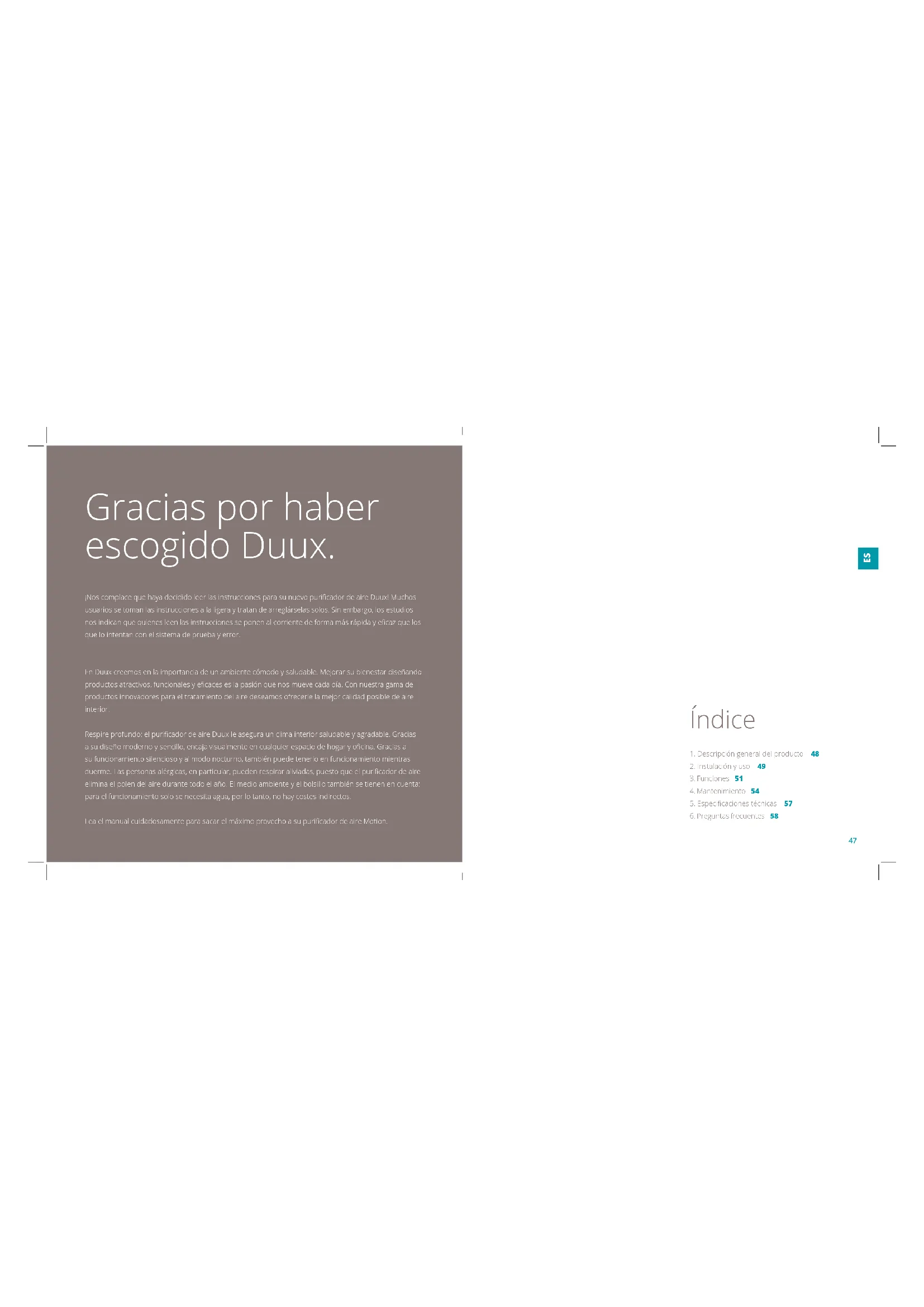 Les notes4746 Gracias por haber escogido Duux. ¡Nos complace que haya decidido leer las instrucciones para su nuevo puricador de aire Duux! Muchos usuarios se toman las instrucciones a la ligera y tratan de arreglárselas solos. Sin embargo, los estudios nos indican que quienes leen las instrucciones se ponen al corriente de forma más rápida y ecaz que los que lo intentan con el sistema de prueba y error. En Duux creemos en la importancia de un ambiente cómodo y saludable. Mejorar su bienestar diseñando productos atractivos, funcionales y ecaces es la pasión que nos mueve cada día. Con nuestra gama de productos innovadores para el tratamiento del aire deseamos ofrecerle la mejor calidad posible de aire interior. Respire profundo: el puricador de aire Duux le asegura un clima interior saludable y agradable. Gracias a su diseño moderno y sencillo, encaja visualmente en cualquier espacio de hogar y ocina. Gracias a su funcionamiento silencioso y al modo nocturno, también puede tenerlo en funcionamiento mientras duerme. Las personas alérgicas, en particular, pueden respirar aliviadas, puesto que el puricador de aire elimina el polen del aire durante todo el año. El medio ambiente y el bolsillo también se tienen en cuenta: para el funcionamiento solo se necesita agua, por lo tanto, no hay costes indirectos. Lea el manual cuidadosamente para sacar el máximo provecho a su puricador de aire Motion.