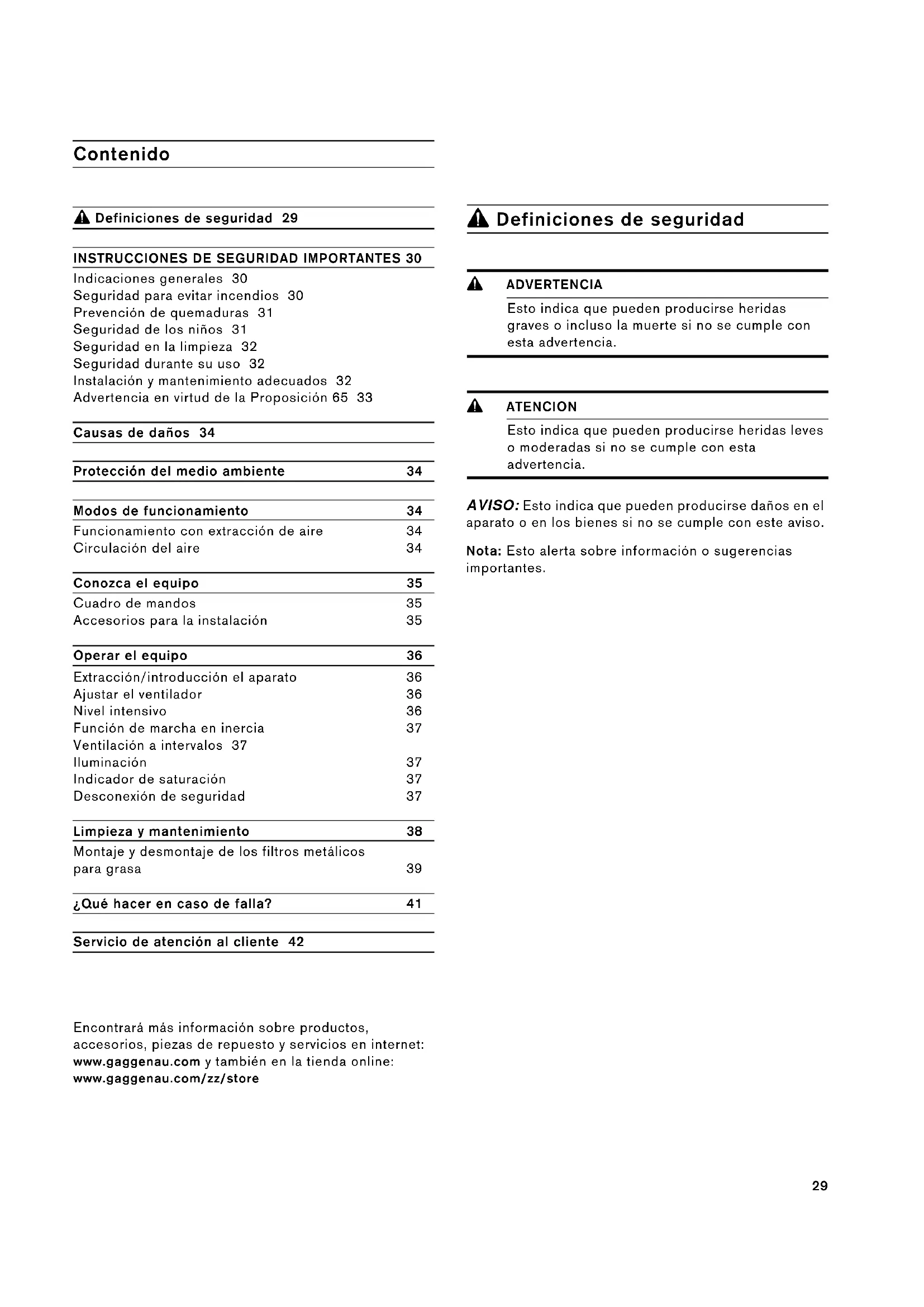 Indicaciones generales 30 Seguridad para evitar incendios 30 Prevención de quemaduras 31 Seguridad de los niños 31 Seguridad en la limpieza 32 Seguridad durante su uso 32 Instalación y mantenimiento adecuados 32 Advertencia en virtud de la Proposición 65 33 Causas de daños 34 Protección del medio ambiente 34 Modos de funcionamiento 34 Funcionamiento con extracción de aire 34 Circulación del aire 34 Conozca el equipo 35 Cuadro de mandos 35 Accesorios para la instalación 35 Operar el equipo 36 Extracción/introducción el aparato 36 Ajustar el ventilador 36 Nivel intensivo 36 Función de marcha en inercia 37 Ventilación a intervalos 37 Iluminación 37 Indicador de saturación 37 Desconexión de seguridad 37 Limpieza y mantenimiento 38 Montaje y desmontaje de los filtros metálicos para grasa 39 ¿Qué hacer en caso de falla? 41 Servicio de atención al cliente 42 Encontrará más información sobre productos, accesorios, piezas de repuesto y servicios en internet: www.gaggenau.com y también en la tienda online: www.gaggenau.com/zz/store 9 Definiciones de seguridad Definiciones de seguri dad 9 ADVERTENCIA Esto indica que pueden producirse heridas graves o incluso la muerte si no se cumple con esta advertencia. 9 ATENCION Esto indica que pueden producirse heridas leves o moderadas si no se cumple con esta advertencia. AVISO: Esto indica que pueden producirse daños en el aparato o en los bienes si no se cumple con este aviso. Nota: Esto alerta sobre información o sugerencias importantes.9 INSTRUCCIONES DE SEGURIDAD IMPORTANTES
