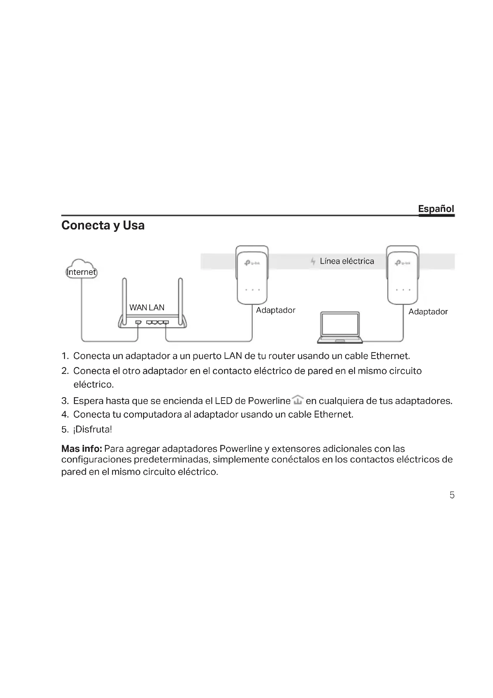 Mas info: Para agregar adaptadores Powerline y extensores adicionales con las conguraciones predeterminadas, simplemente conéctalos en los contactos eléctricos de pared en el mismo circuito eléctrico. Internet WAN LAN Adaptador Adaptador Línea eléctricaEspañol
