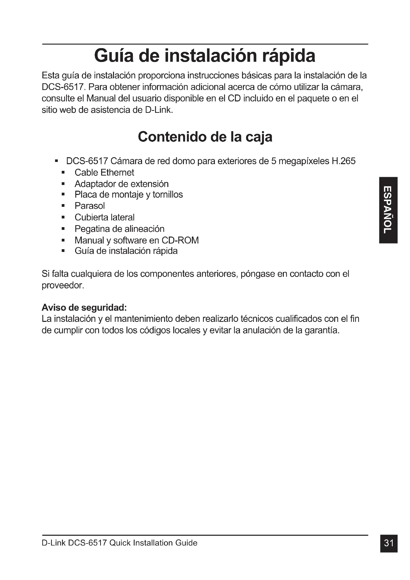 ESPAÑOL Guía de instalación rápida Esta guía de instalación proporciona instrucciones básicas para la instalación de la DCS-6517. Para obtener información adicional acerca de cómo utilizar la cámara, consulte el Manual del usuario disponible en el CD incluido en el paquete o en el sitio web de asistencia de D-Link. Contenido de la caja DCS-6517 Cámara de red domo para exteriores de 5 megapíxeles H.265 Cable Ethernet Adaptador de extensión Placa de montaje y tornillos Parasol Cubierta lateral Pegatina de alineación Manual y software en CD-ROM Guía de instalación rápida Si falta cualquiera de los componentes anteriores, póngase en contacto con el proveedor. Aviso de seguridad: La instalación y el mantenimiento deben realizarlo técnicos cualificados con el fin de cumplir con todos los códigos locales y evitar la anulación de la garantía.D-Link DCS-6517 Quick Installation Guide