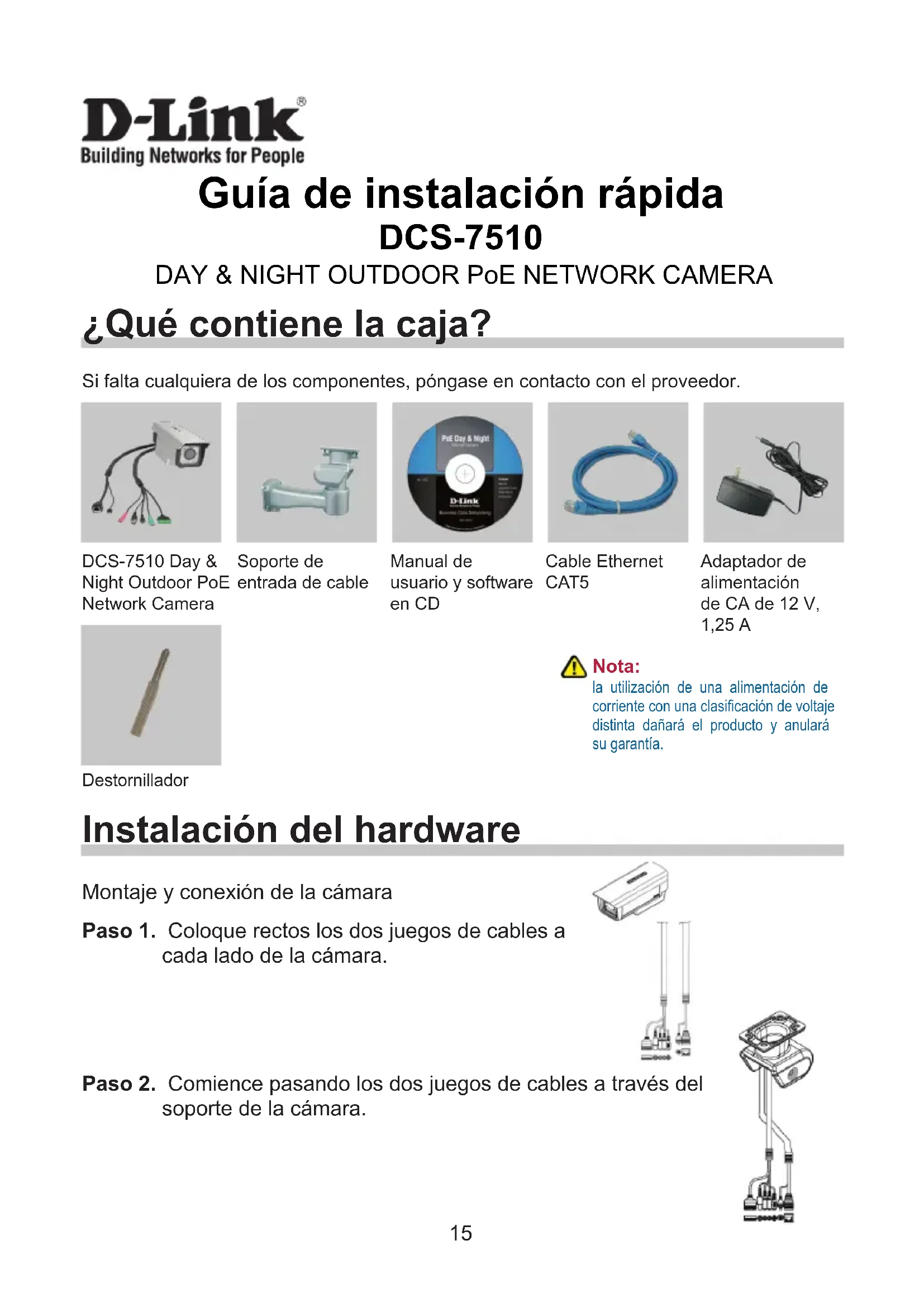 Guía de instalación rápida DCS-7510 DCS-7510 Day & Night Outdoor PoE Network CameraSoporte de entrada de cableAdaptador de alimentación de CA de 12 V, 1,25 ASi falta cualquiera de los componentes, póngase en contacto con el proveedor. DAY & NIGHT OUTDOOR PoE NETWORK CAMERA DestornilladorManual de usuario y software en CDCable Ethernet CAT5 Montaje y conexión de la cámara Paso 1. Coloque rectos los dos juegos de cables a cada lado de la cámara. Paso 2. Comience pasando los dos juegos de cables a través del soporte de la cámara. ¿Qué contiene la caja? Instalación del hardware Nota:la utilización de una alimentación de corriente con una clasicación de voltaje distinta dañará el producto y anulará su garantía.16