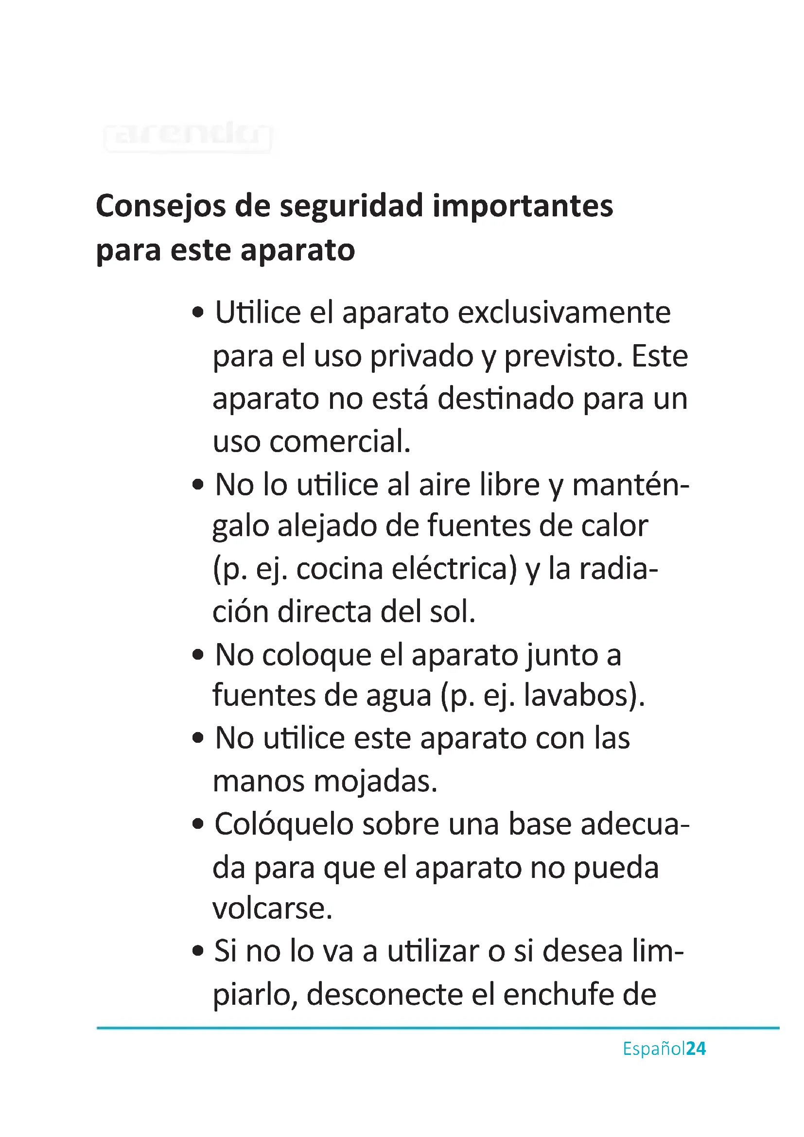 - Ulice el aparato exclusivamente para el uso privado y previsto. Este aparato no está desnado para un uso comercial.
