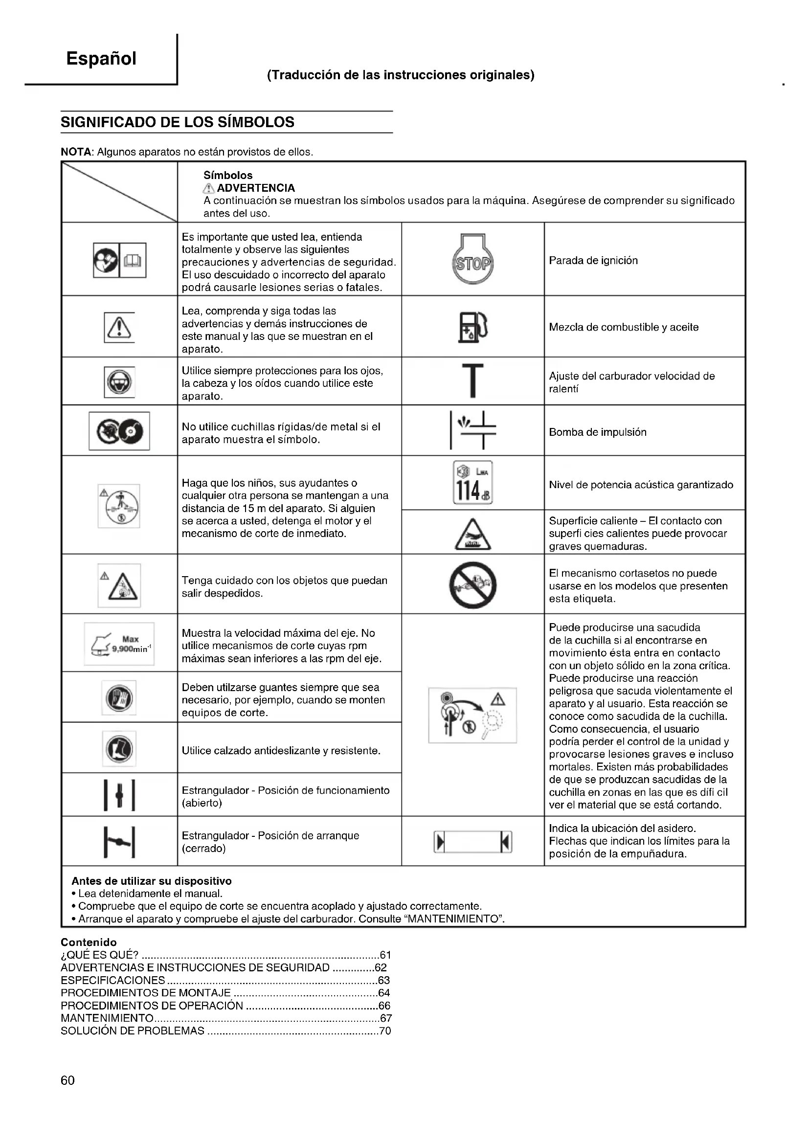 NOTA: Algunos aparatos no están provistos de ellos. Símbolos ADVERTENCIA A continuación se muestran los símbolos usados para la máquina. Asegúrese de comprender su signifi cado antes del uso. Es importante que usted lea, entienda totalmente y observe las siguientes precauciones y advertencias de seguridad. El uso descuidado o incorrecto del aparato podrá causarle lesiones serias o fatales. Parada de ignición Lea, comprenda y siga todas las advertencias y demás instrucciones de este manual y las que se muestran en el aparato. Mezcla de combustible y aceite Utilice siempre protecciones para los ojos, la cabeza y los oídos cuando utilice este aparato. Ajuste del carburador velocidad de ralentí No utilice cuchillas rígidas/de metal si el aparato muestra el símbolo. Bomba de impulsión Haga que los niños, sus ayudantes o cualquier otra persona se mantengan a una distancia de 15 m del aparato. Si alguien se acerca a usted, detenga el motor y el mecanismo de corte de inmediato.