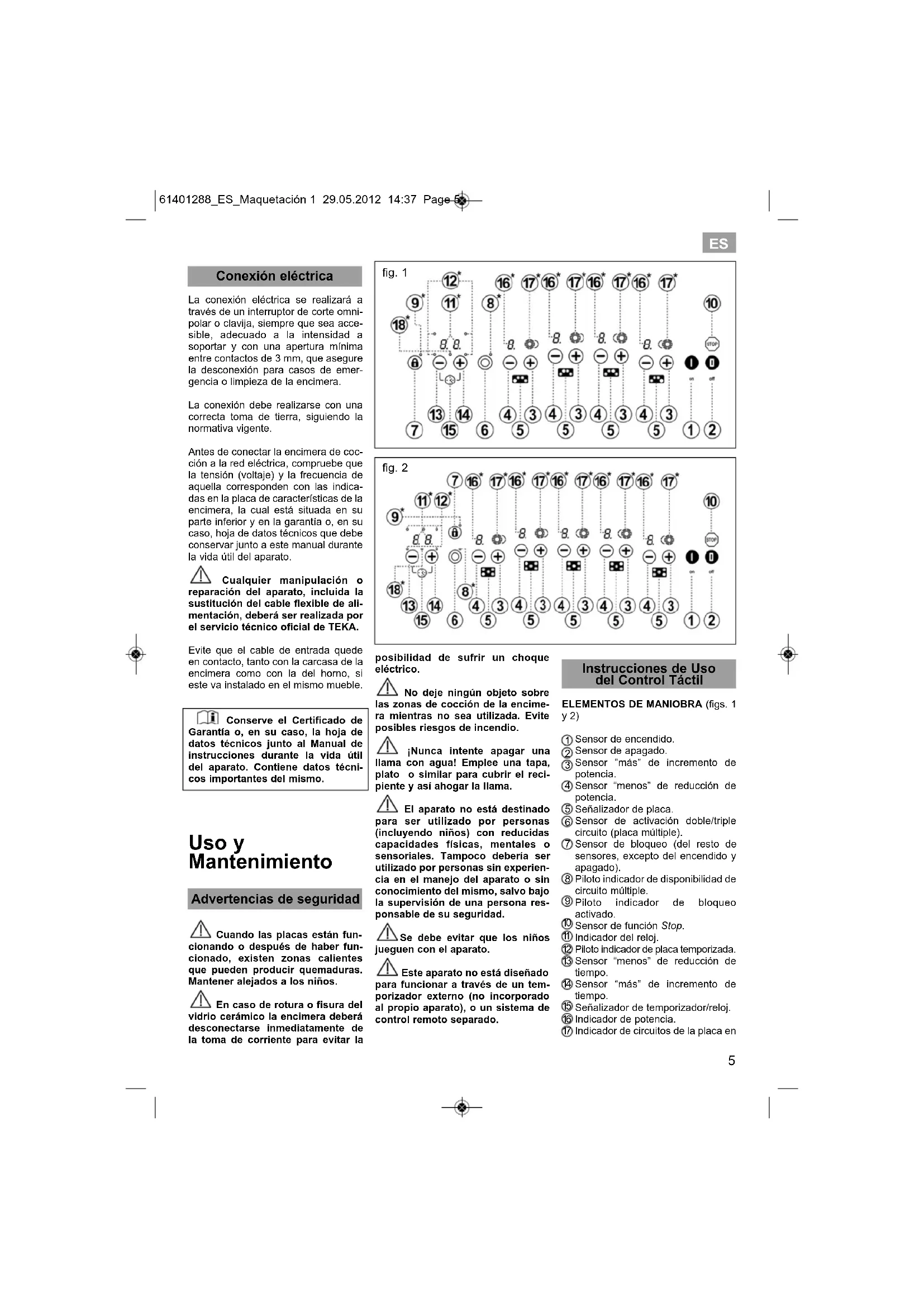 61401288_ES_Maquetación 1 29.05.2012 14:37 Page 23 Presentación / Apresentação / Presentation / Präsentation / Présentation / Παρουσίαση / Представяне / / Prezentacja / Bemutatás / Provedení / Predstavenie / Prezentare / Внешний вид / Зовнішній вигляд / 61401288_ES_Maquetación 1 29.05.2012 14:37 Page 34 Instalación / Instalação / Installation / Montage / Installation / Εγκατάσταση / Монтаж / Kurulum / Instalacja / Beszerelés / Instalace / Inštalácia / Instalare / Установка / Установка / Distancias mínimas / Distâncias mínimas / Minimum distances / Mindestabstände / Distances minimales / Ελάχιστες αποστάσεις / Минимални разстояния / Minimum mesafeler / Minimalne odległości / Minimális távolságok / Minimální vzdá- lenosti / Minimálne vzdialenosti / Distanţe minime / Минимальные расстояния / мінімальні відстані / Horno Teka / Forno TEKA / TEKA Oven / TEKA-Herd / Four TEKA / Φούρνος TEKA / Фурна TEKA / TEKA / Piekarnik TEKA / TEKA sütő / Trouba TEKA / Rúra na pečenie TEKA / TEKA Cuptor / Духовка TEKA / Unidades en mm / Unidades em mm / Units in mm / Einheiten in mm / Unités en mm / Μονάδες σε mm / Елементите в мм / mm cinsiden birimler / Jednostki w mm / Egységek mm-ben / Jednotky v mm / Jednotky v mm / Unităţi în mm / Размеры в мм / розміри в мм / 61401288_ES_Maquetación 1 29.05.2012 14:37 Page 45 Conexión eléctrica La conexión eléctrica se realizará a través de un interruptor de corte omni- polar o clavija, siempre que sea acce- sible, adecuado a la intensidad a soportar y con una apertura mínima entre contactos de 3 mm, que asegure la desconexión para casos de emer- gencia o limpieza de la encimera. La conexión debe realizarse con una correcta toma de tierra, siguiendo la normativa vigente. Antes de conectar la encimera de coc- ción a la red eléctrica, compruebe que la tensión (voltaje) y la frecuencia de aquella corresponden con las indica- das en la placa de características de la encimera, la cual está situada en su parte inferior y en la garantía o, en su caso, hoja de datos técnicos que debe conservar junto a este manual durante la vida útil del aparato. Cualquier manipulación o reparación del aparato, incluida la sustitución del cable flexible de ali- mentación, deberá ser realizada por el servicio técnico oficial de TEKA. Evite que el cable de entrada quede en contacto, tanto con la carcasa de la encimera como con la del horno, si este va instalado en el mismo mueble. Conserve el Certificado de Garantía o, en su caso, la hoja de datos técnicos junto al Manual de instrucciones durante la vida útil del aparato. Contiene datos técni- cos importantes del mismo. Uso y Mantenimiento Advertencias de seguridad Cuando las placas están fun- cionando o después de haber fun- cionado, existen zonas calientes que pueden producir quemaduras. Mantener alejados a los niños. En caso de rotura o fisura del vidrio cerámico la encimera deberá desconectarse inmediatamente de la toma de corriente para evitar la posibilidad de sufrir un choque eléctrico. No deje ningún objeto sobre las zonas de cocción de la encime- ra mientras no sea utilizada. Evite posibles riesgos de incendio. ¡Nunca intente apagar una llama con agua! Emplee una tapa, plato o similar para cubrir el reci- piente y así ahogar la llama. El aparato no está destinado para ser utilizado por personas (incluyendo niños) con reducidas capacidades físicas, mentales o sensoriales. Tampoco debería ser utilizado por personas sin experien- cia en el manejo del aparato o sin conocimiento del mismo, salvo bajo la supervisión de una persona res- ponsable de su seguridad. Se debe evitar que los niños jueguen con el aparato. Este aparato no está diseñado para funcionar a través de un tem- porizador externo (no incorporado al propio aparato), o un sistema de control remoto separado. Instrucciones de Uso del Control Táctil ELEMENTOS DE MANIOBRA (figs. 1 y 2) Sensor de encendido. Sensor de apagado. Sensor “más” de incremento de potencia. Sensor “menos” de reducción de potencia. Señalizador de placa. Sensor de activación doble/triple circuito (placa múltiple). Sensor de bloqueo (del resto de sensores, excepto del encendido y apagado). Piloto indicador de disponibilidad de circuito múltiple. Piloto indicador de bloqueo activado. Sensor de función Stop. Indicador del reloj. Piloto indicador de placa temporizada. Sensor “menos” de reducción de tiempo. Sensor “más” de incremento de tiempo. Señalizador de temporizador/reloj. Indicador de potencia. Indicador de circuitos de la placa en