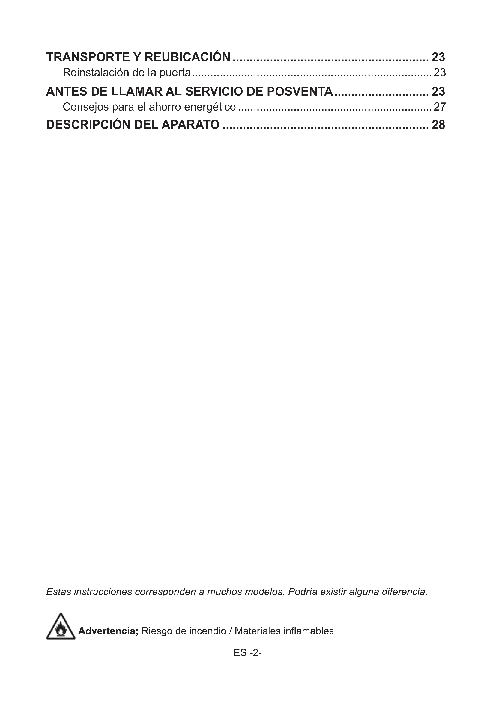 Descongelación .............................................................................................. 22ES -2- Estas instrucciones corresponden a muchos modelos. Podría existir alguna diferencia. Advertencia; Riesgo de incendio / Materiales inflamables