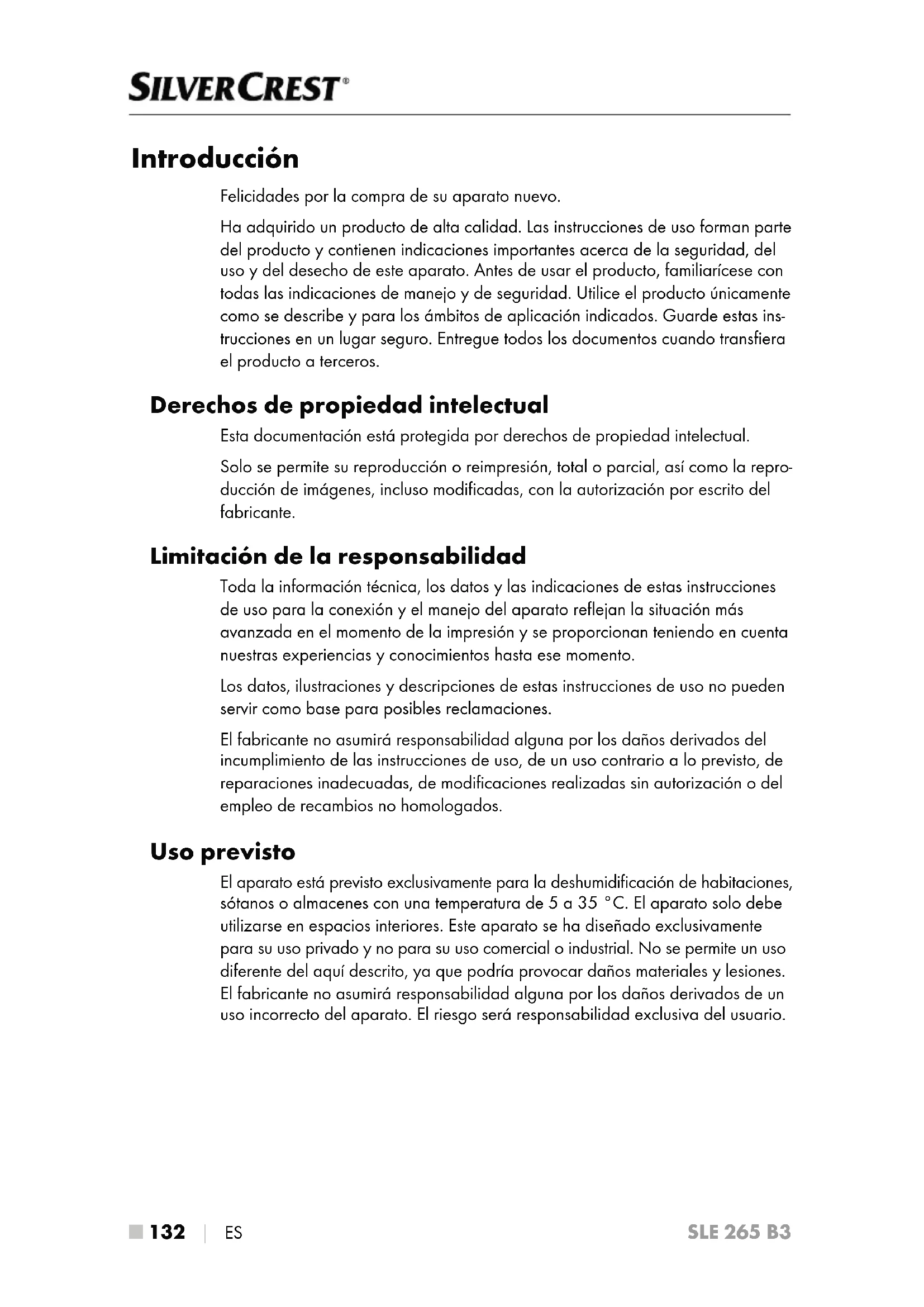 - Importador ■ 132 │ ES SLE 265 B3 Introducción Felicidades por la compra de su aparato nuevo. Ha adquirido un producto de alta calidad. Las instrucciones de uso forman parte del producto y contienen indicaciones importantes acerca de la seguridad, del uso y del desecho de este aparato. Antes de usar el producto, familiarícese con todas las indicaciones de manejo y de seguridad. Utilice el producto únicamente como se describe y para los ámbitos de aplicación indicados. Guarde estas ins- trucciones en un lugar seguro. Entregue todos los documentos cuando transfiera el producto a terceros. Derechos de propiedad intelectual Esta documentación está protegida por derechos de propiedad intelectual. Solo se permite su reproducción o reimpresión, total o parcial, así como la repro- ducción de imágenes, incluso modificadas, con la autorización por escrito del fabricante. Limitación de la responsabilidad Toda la información técnica, los datos y las indicaciones de estas instrucciones de uso para la conexión y el manejo del aparato reflejan la situación más avanzada en el momento de la impresión y se proporcionan teniendo en cuenta nuestras experiencias y conocimientos hasta ese momento. Los datos, ilustraciones y descripciones de estas instrucciones de uso no pueden servir como base para posibles reclamaciones. El fabricante no asumirá responsabilidad alguna por los daños derivados del incumplimiento de las instrucciones de uso, de un uso contrario a lo previsto, de reparaciones inadecuadas, de modificaciones realizadas sin autorización o del empleo de recambios no homologados. Uso previsto El aparato está previsto exclusivamente para la deshumidificación de habitaciones, sótanos o almacenes con una temperatura de 5 a 35°C. El aparato solo debe utilizarse en espacios interiores. Este aparato se ha diseñado exclusivamente para su uso privado y no para su uso comercial o industrial. No se permite un uso diferente del aquí descrito, ya que podría provocar daños materiales y lesiones. El fabricante no asumirá responsabilidad alguna por los daños derivados de un uso incorrecto del aparato. El riesgo será responsabilidad exclusiva del usuario.ES │ 133 ■ SLE 265 B3 Indicaciones de advertencia utilizadas En estas instrucciones de uso se utilizan las siguientes indicaciones de advertencia: PELIGRO Una advertencia de este nivel de peligro indica una situación de peligro inminente. Si no se evita la situación de peligro, pueden producirse lesiones graves o incluso la muerte. ► Deben cumplirse las instrucciones de esta advertencia para evitar un peligro de lesiones graves o incluso mortales. ADVERTENCIA Una advertencia de este nivel de peligro indica una posible situación de peligro. Si no se evita la situación de peligro, pueden producirse lesiones. ► Deben cumplirse las instrucciones de esta advertencia para evitar lesiones personales. ATENCIÓN Una advertencia de este nivel de peligro indica un posible daño material. Si no se evita la situación, pueden producirse daños materiales. ► Deben cumplirse las instrucciones de esta advertencia para evitar daños materiales. INDICACIÓN ► La indicación proporciona información adicional que facilita el manejo del aparato.■ 134 │ ES SLE 265 B3 Seguridad En este capítulo obtendrá indicaciones de seguridad importantes para el manejo del aparato. Un uso inadecuado puede causar lesiones personales y daños materiales. Peligro debido a la corriente eléctrica PELIGRO ¡Peligro de muerte por descarga eléctrica! ¡Peligro de muerte por el contacto con cables o componentes sometidos a la tensión eléctrica! Observe las siguientes indicaciones de seguridad para evitar los peligros causados por la corriente eléctrica: ► No utilice el aparato si el cable de conexión o el enchufe están dañados. ► Si se tocan las conexiones sometidas a tensión y se modifica la estructura mecánica y eléctrica, existe peligro de descarga eléctrica. Peligro de descarga eléctrica por la humedad PELIGRO ► No sumerja el aparato en agua ni lo coloque en charcos de agua o pozas. ► El aparato no debe utilizarse nunca en la proximidad de bañeras, duchas, lavabos llenos de agua o recipientes similares. ► No sumerja el aparato, el cable de conexión ni el enchufe en agua ni en otros líquidos. ► Proteja el aparato contra el goteo y las salpicaduras de agua. ► Si penetrara líquido en el aparato (a excepción del de- pósito de agua), desconecte inmediatamente el enchufe de la red eléctrica. Encomiende la inspección del apara- to antes de volver a ponerlo en funcionamiento. ► No maneje el aparato con las manos húmedas. ► Si el aparato se cae al agua, desconecte inmediatamente el enchufe de la red eléctrica. Solo después podrá retirarse el aparato.ES │ 135 ■ SLE 265 B3 Peligro de explosión PELIGRO ► No utilice el aparato en un entorno potencialmente explosivo en el que haya líquidos, gases o polvos infla- mables. Los aparatos eléctricos generan chispas que pueden incendiar el polvo o los vapores. Peligro de enfermedades PELIGRO ► El agua acumulada no es potable ni apta para el riego. Existe un riesgo para la salud. ¡ADVERTENCIA DE DAÑOS MATERIALES! ► No utilice el aparato en piscinas, baños o estancias similares. ► Este aparato no es apto para el secado de material de aislamiento. Si el material de aislamiento se moja tras rom- perse una tubería, consulte a un técnico especializado. ► No someta nunca el aparato a temperaturas de 0°C o inferiores. El agua residual de los conductos podría congelarse y dañar el aparato. ► No utilice el aparato en entornos polvorientos o con contenido de cloro.■ 136 │ ES SLE 265 B3 Indicaciones básicas de seguridad Para manejar con seguridad el aparato, deben tenerse en cuenta las siguientes indicaciones de seguridad: ■ Antes de usar el aparato, compruebe si hay daños externos visibles. No ponga en funcionamiento un aparato dañado o que se haya c