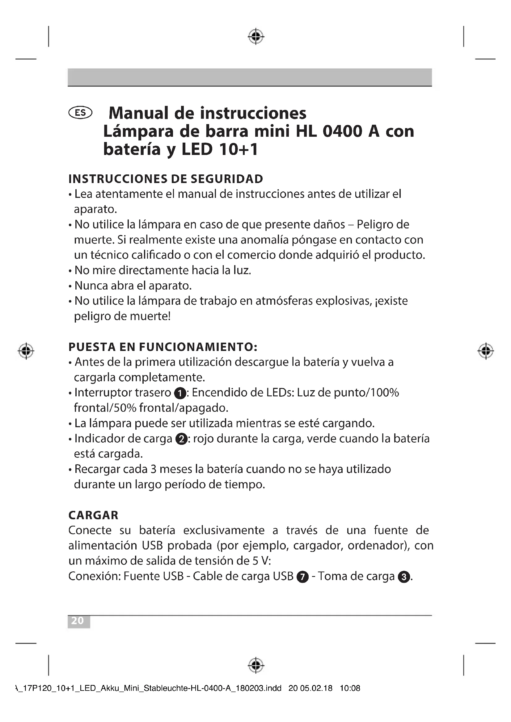 - Recargar cada 3 meses la batería cuando no se haya utilizado durante un largo período de tiempo. CARGAR Conecte su batería exclusivamente a través de una fuente de alimentación USB probada (por ejemplo, cargador, ordenador), con un máximo de salida de tensión de 5 V: Conexión: Fuente USB - Cable de carga USB 7 - Toma de carga 3. BA_17P120_10+1_LED_Akku_Mini_Stableuchte-HL-0400-A_180203.indd 20 05.02.18 10:0821