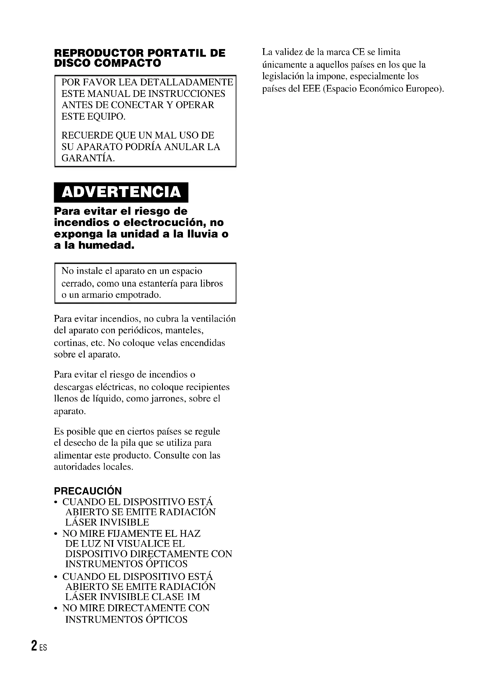 GARANTÍA. ADVERTENCIA Para evitar el riesgo de incendios o electrocución, no exponga la unidad a la lluvia o a la humedad. No instale el aparato en un espacio cerrado, como una estantería para libros o un armario empotrado. Para evitar incendios, no cubra la ventilación del aparato con periódicos, manteles, cortinas, etc. No coloque velas encendidas sobre el aparato. Para evitar el riesgo de incendios o descargas eléctricas, no coloque recipientes llenos de líquido, como jarrones, sobre el aparato. Es posible que en ciertos países se regule el desecho de la pila que se utiliza para alimentar este producto. Consulte con las autoridades locales. PRECAUCIÓN