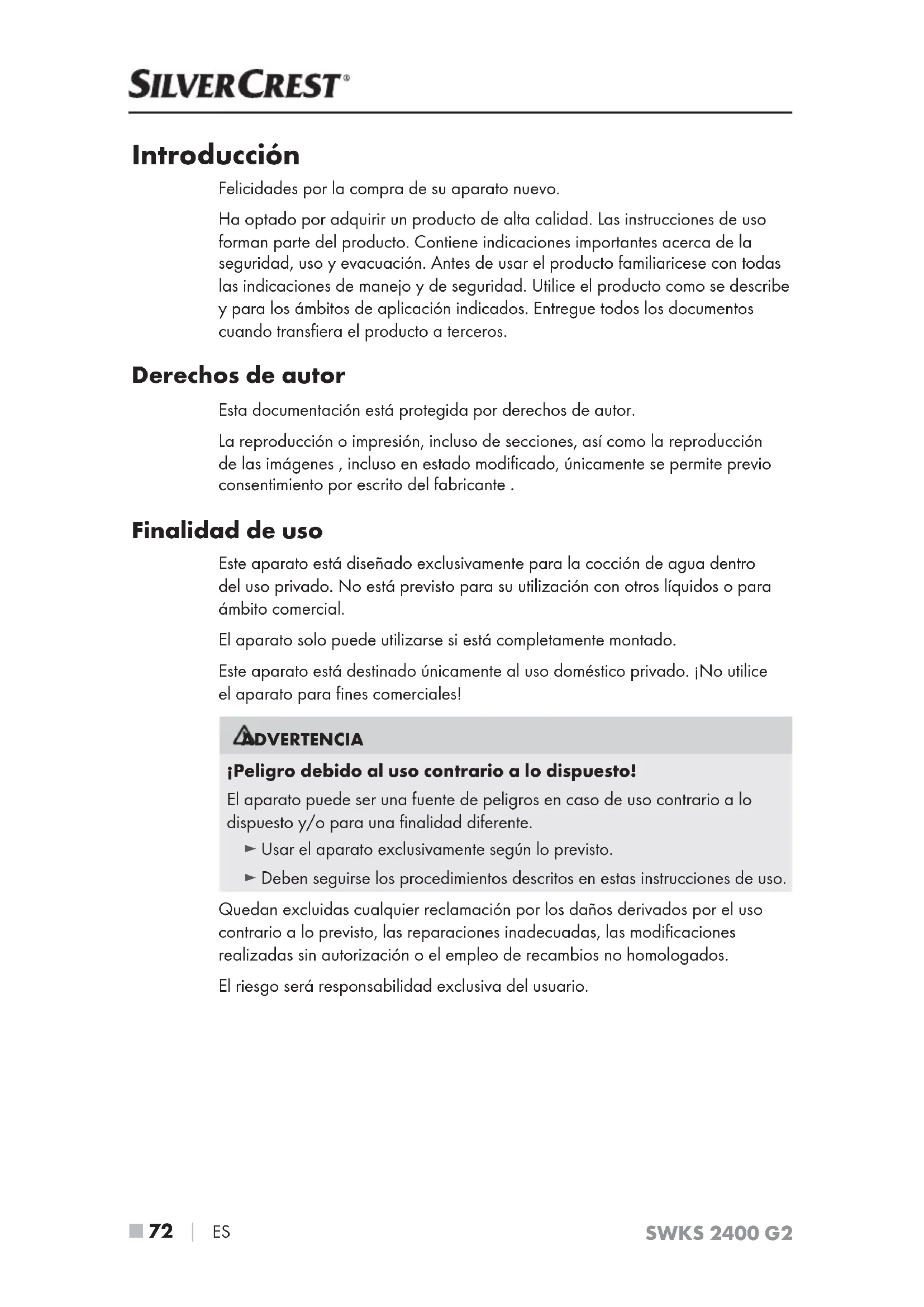 ES SWKS 2400 G2 Introducción Felicidades por la compra de su aparato nuevo. Ha optado por adquirir un producto de alta calidad. Las instrucciones de uso forman parte del producto. Contiene indicaciones importantes acerca de la seguridad, uso y evacuación. Antes de usar el producto familiaricese con todas las indicaciones de manejo y de seguridad. Utilice el producto como se describe y para los ámbitos de aplicación indicados. Entregue todos los documentos cuando transfiera el producto a terceros. Derechos de autor Esta documentación está protegida por derechos de autor. La reproducción o impresión, incluso de secciones, así como la reproducción de las imágenes , incluso en estado modificado, únicamente se permite previo consentimiento por escrito del fabricante . Finalidad de uso Este aparato está diseñado exclusivamente para la cocción de agua dentro del uso privado. No está previsto para su utilización con otros líquidos o para ámbito comercial. El aparato solo puede utilizarse si está completamente montado. Este aparato está destinado únicamente al uso doméstico privado. ¡No utilice el aparato para fines comerciales! ADVERTENCIA ¡Peligro debido al uso contrario a lo dispuesto! El aparato puede ser una fuente de peligros en caso de uso contrario a lo dispuesto y/o para una finalidad diferente. ► Usar el aparato exclusivamente según lo previsto. ► Deben seguirse los procedimientos descritos en estas instrucciones de uso. Quedan excluidas cualquier reclamación por los daños derivados por el uso contrario a lo previsto, las reparaciones inadecuadas, las modificaciones realizadas sin autorización o el empleo de recambios no homologados. El riesgo será responsabilidad exclusiva del usuario.ES