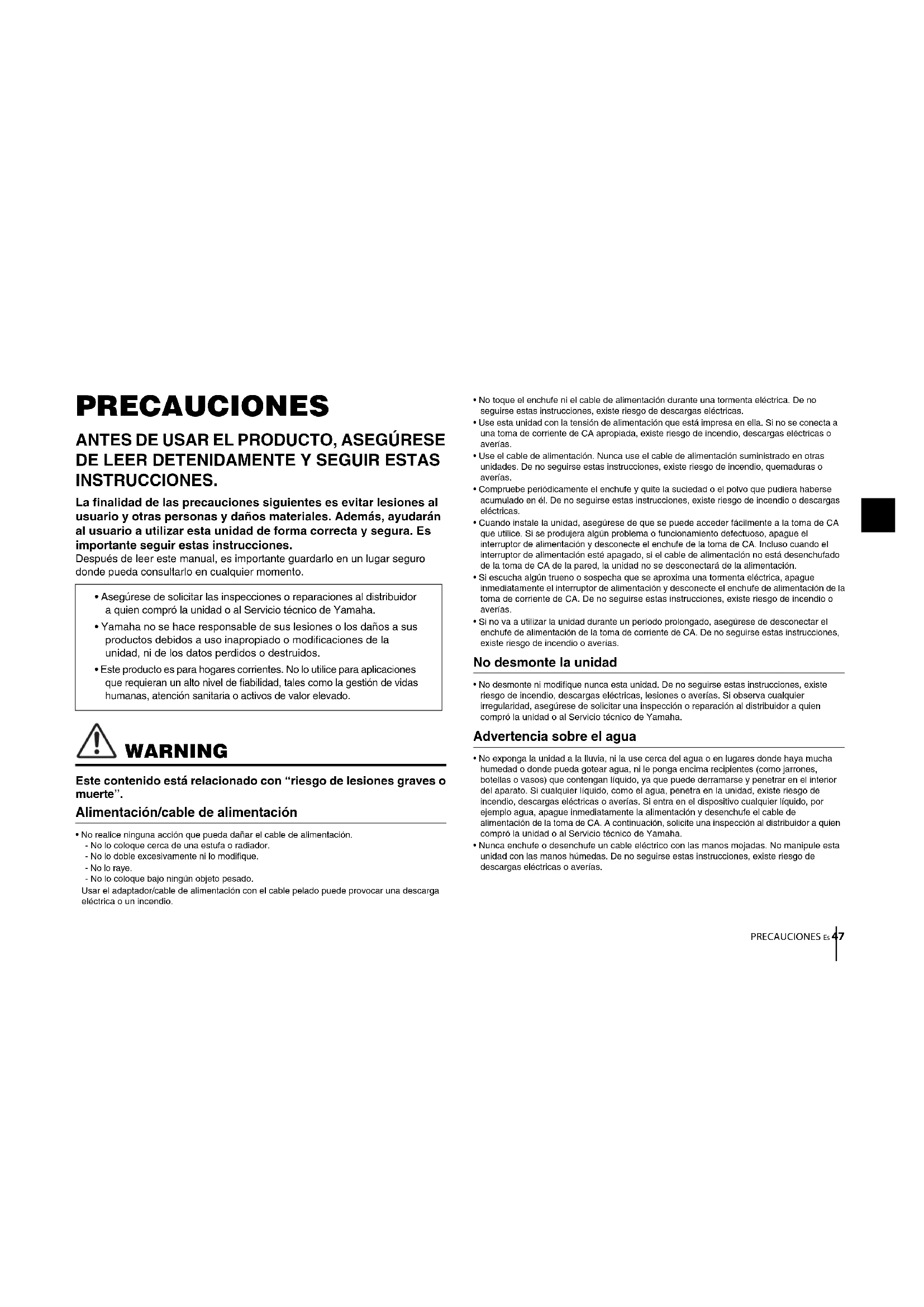 - No desmonte ni modifique nunca esta unidad. De no seguirse estas instrucciones, existe riesgo de incendio, descargas eléctricas, lesiones o averías. Si observa cualquier irregularidad, asegúrese de solicitar una inspección o reparación al distribuidor a quien compró la unidad o al Servicio técnico de Yamaha. Advertencia sobre el agua