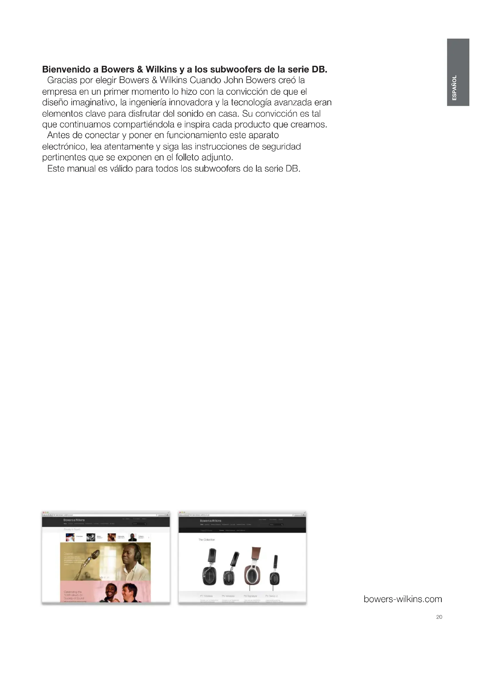 - Para seleccionar la entrada alternativa seleccione la pestaña alternativa en la página de conguración de entrada. Para conectar el subwoofer a modo standby pulse el botón standby del panel delantero. El indicador del botón se encenderá en rojo. Recuerde que el subwoofer de la serie DB tiene niveles de volumen con un potencial para causar molestias. En caso de duda reduzca el volumen. Nota: Si un subwoofer DB estuviese sobrecargado el indicador standby parpadeará en rojo. El rendimiento del subwoofer puede cambiar sutilmente durante el periodo de escucha inicial. Si se ha guardado en un entorno frío, los compuestos de amortiguación y los materiales de suspensión de las unidades de accionamiento tardarán algún tiempo en recuperar sus propiedades mecánicas correctas. La suspensión de la unidad de accionamiento se aojará también durante las primeras horas de uso. El tiempo necesario para que el altavoz consiga el rendimiento adecuado variará dependiendo de las condiciones de almacenamiento previas y de cómo se va a utilizar. A modo de orientación le aconsejamos que espere hasta una semana para que los efectos de la temperatura se estabilicen, y 15 horas de uso normal para que las piezas mecánicas logren sus características de diseño adecuadas. 6 Restablecimiento predeterminado Para que el subwoofer vuelva a los ajustes predeterminados, pulse y mantenga pulsado el botón standby del panel delantero durante 5 segundos. Cuando se haya completado el restablecimiento predeterminado el subwoofer se apagará. Pulse el botón standby o inicie la aplicación para encenderlo. 7 Limpieza Limpie las supercies con un paño limpio sin pelusa. Si desea utilizar un producto de limpieza, aplíquelo al paño de limpieza, no directamente al subwoofer. Haga primero la prueba en una zona pequeña, ya que algunos productos de limpieza pueden dañar determinadas supercies. Evite el uso de productos abrasivos, o que contengan ácidos, álcali o productos antibacterianos. 8 Soporte Si necesita más ayuda o asesoramiento en relación con los subwoofers de la serie DB visite por favor el sitio aquí. Página de inicio Página de conguración de entrada26 PORTUGUÊS bowers-wilkins.com Bem-vindo à Bowers & Wilkins e à Série DB de subwoofers. Obrigado por ter optado pela Bowers & Wilkins. Quando John Bowers fundou a nossa empresa, acreditava que um design criativo, uma engenharia inovadora e uma tecnologia avançada eram chaves que poderiam abrir as portas para se desfrutar do áudio em casa. Asua crença é algo que continuamos a partilhar e que inspira todos os produtos que concebemos. Antes de ligar e começar a utilizar este equipamento elétrico, leia atentamente e respeite as Instruções de Segurança Importantes do folheto informativo que acompanha o produto. Este manual abrange todos os subwoofers da Série DB. PORTUGUÊS Índice PORTUGUÊS 1