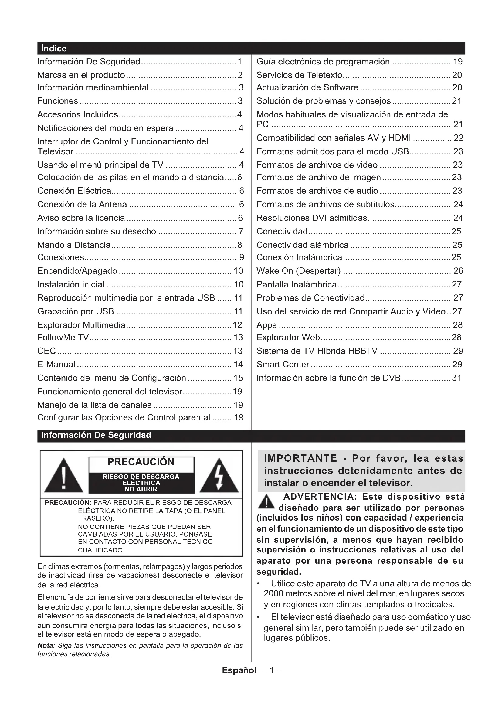 CUALIFICADO. Nota: Siga las instrucciones en pantalla para la operación de las funciones relacionadas. En climas extremos (tormentas, relámpagos) y largos periodos de inactividad (irse de vacaciones) desconecte el televisor de la red eléctrica. El enchufe de corriente sirve para desconectar el televisor de la electricidad y, por lo tanto, siempre debe estar accesible. Si el televisor no se desconecta de la red eléctrica, el dispositivo aún consumirá energía para todas las situaciones, incluso si el televisor está en modo de espera o apagado. IMPORTANTE - Por favor, lea estas instrucciones detenidamente antes de instalar o encender el televisor. ADVERTENCIA: Este dispositivo está diseñado para ser utilizado por personas (incluidos los niños) con capacidad / experiencia en el funcionamiento de un dispositivo de este tipo sin supervisión, a menos que hayan recibido supervisión o instrucciones relativas al uso del aparato por una persona responsable de su seguridad.