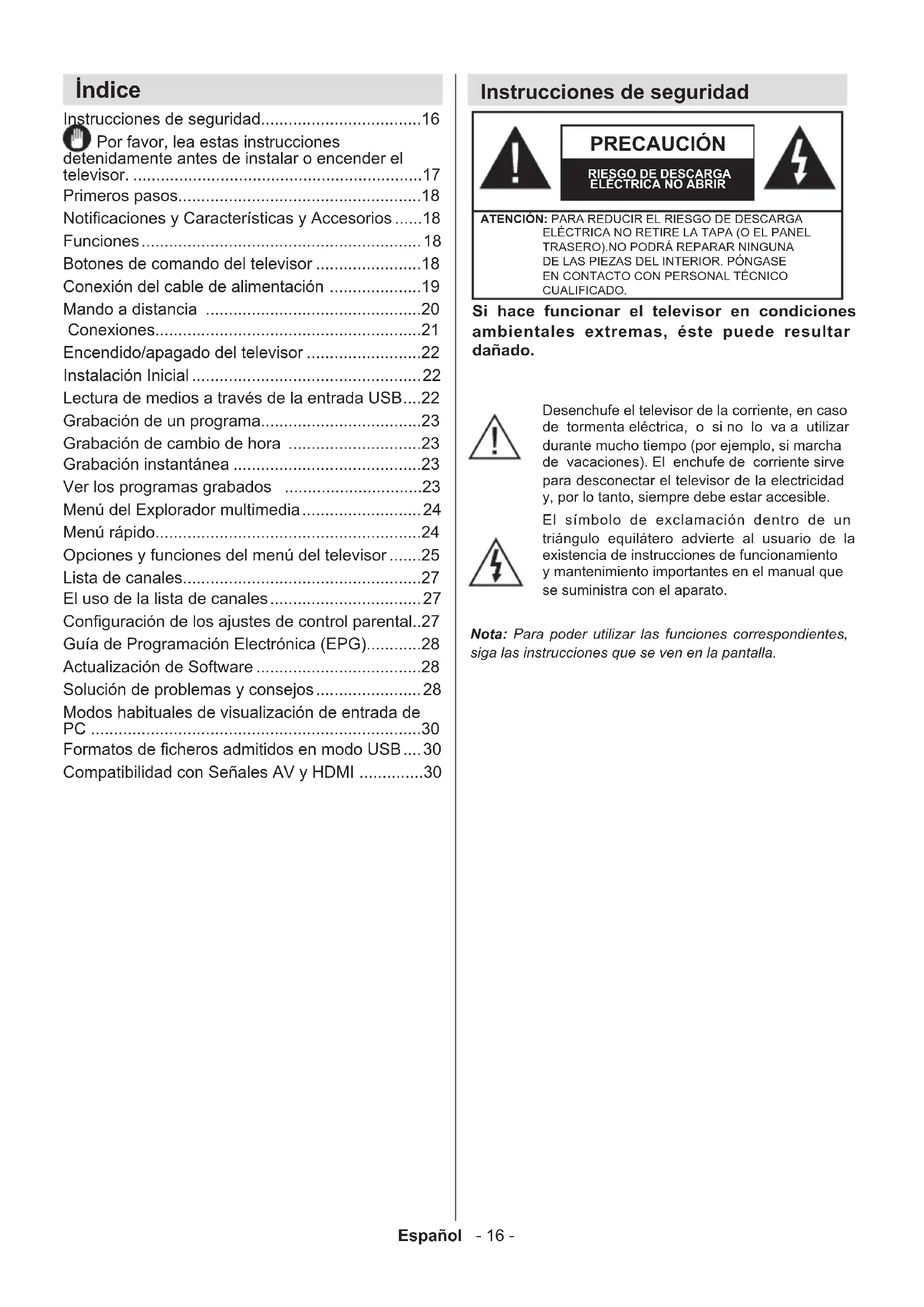 - Compatibilidad con Señales AV y HDMI Instrucciones de seguridad Si hace funcionar el televisor en condiciones ambientales extremas, éste puede resultar dañado. PRECAUCIÓN RIESGO DE DESCARGA ELÉCTRICA NO ABRIRATENCIÓN: PARA REDUCIR EL RIESGO DE DESCARGA ELÉCTRICA NO RETIRE LA TAPA (O EL PANEL TRASERO).NO PODRÁ REPARAR NINGUNA DE LAS PIEZAS DEL INTERIOR. PÓNGASE EN CONTACTO CON PERSONAL TÉCNICO CUALIFICADO.Nota: Para poder utilizar las funciones correspondientes, siga las instrucciones que se ven en la pantalla.Desenchufe el televisor de la corriente, en caso de tormenta eléctrica, o si no lo va a utilizar durante mucho tiempo (por ejemplo, si marcha de vacaciones). El enchufe de corriente sirve para desconectar el televisor de la electricidad y, por lo tanto, siempre debe estar accesible.El símbolo de exclamación dentro de un triángulo equilátero advierte al usuario de la existencia de instrucciones de funcionamiento y mantenimiento importantes en el manual que se suministra con el aparato.Español - 17 - p. 30