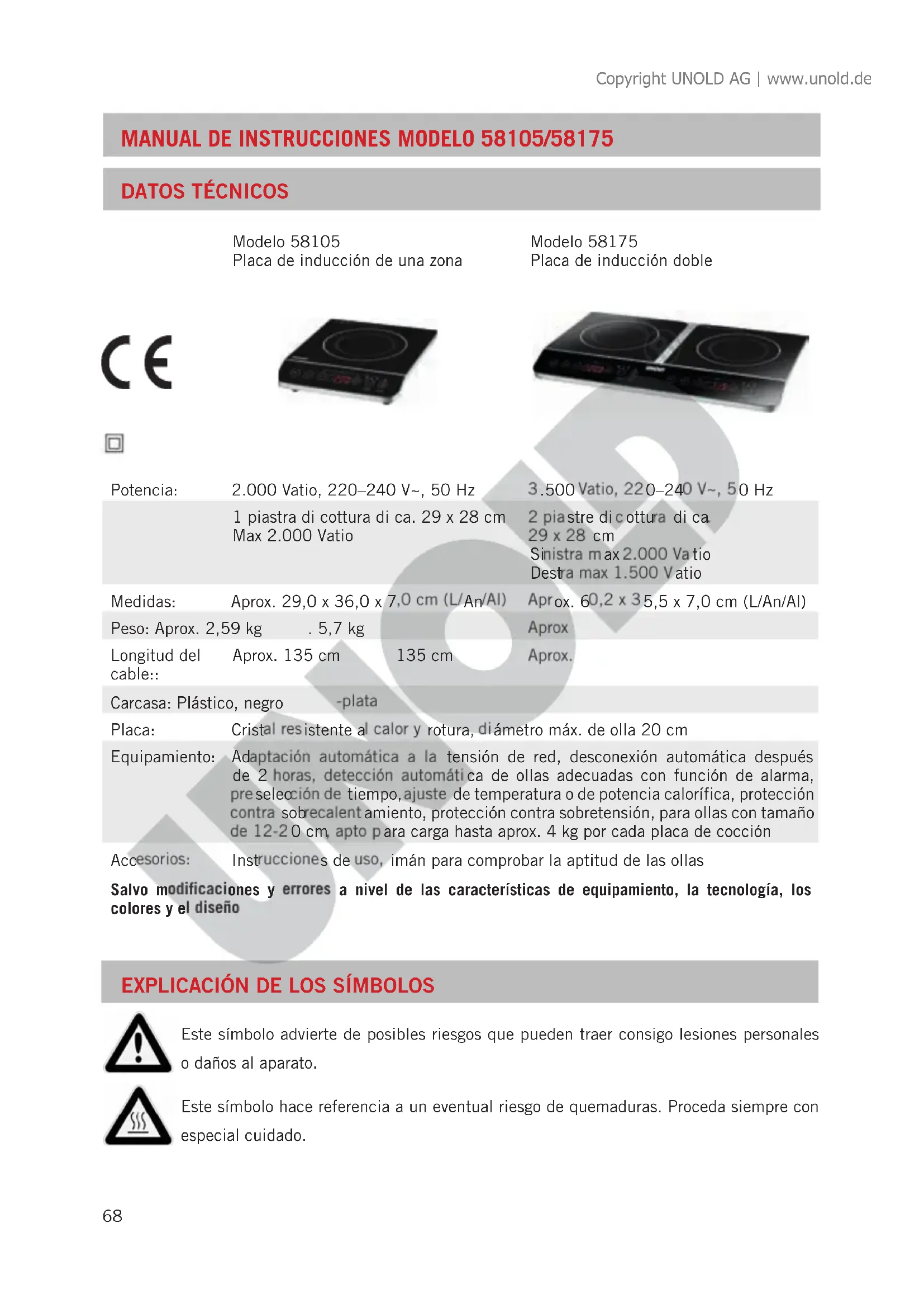 DISPOSICIÓN/PROTECCIÓN DEL MEDIO AMBIENTE Nuestros aparatos se fabrican con un alto nivel de calidad por un largo período de uso. El mantenimiento regular y las reparaciones de tipo técnico a través de nuestro servicio al cliente pueden prolongar la du- ración del aparato. Cuando un aparato está defectuoso y ya no puede repararse, por favor considere en la disposición final los siguientes puntos: Este producto no puede ser eliminado junto a la basura domiciliaria. Usted debe entregar este producto a un lugar oficial para el reciclaje de aparatos eléctricos o electrónicos. Mediante la clasificación por separado y el reciclaje de productos residuales, Usted contribuye a proteger los recursos naturales y asegura que el producto sea eliminado de forma salubre y acorde con el medio ambiente. La garantía para nuestros equipos es de 24 meses, y de 12 meses en el caso de uso comercial, a partir de la fecha de compra, cubriendo los daños que con un uso acorde a lo prescrito pueden atribuirse fehacientemente a defectos de fabri- cación. Dentro del período de garantía, solucionamos errores de material y de fabricación a consideración nuestra mediante reparación o cambio. Nuestros servicios de garantía son válidos únicamente para los aparatos que han sido vendidos en Alemania y Austria. Para todos los demás casos diríjase por favor al importador correspondiente. Aquellos aparatos que se presentan para eliminar errores, por favor enviarlos junto a una copia del comprobante de compra extendido a máquina, del cual debe desprenderse la fecha de compra, así como una breve descripción de las deficiencias, apropiadamente embalado y con los sellos correspondientes a nuestro servicio al cliente. En caso de garantía, los gastos de envío serán restituidos al cliente solamente en Alemania y Austria. Aquellos daños causados por desgaste están excluidos de la garantía, así como manipulación incorrecta, e incumplimiento de las condiciones de mantenimiento y cuidado. El derecho a garantía expira si las reparaciones o mantenimiento son realizadas por terceros. Todo reclamo del consumidor final ante el vendedor, comerciante no se ve afectado por esta garantía. Copyright UNOLD AG | www.unold.de79 Model 58105 Jednoduchá indukční varná deska Model 58175 Dvojitá indukční varná deska Výkon: 2.000 Watt, 220–240 V~, 50 Hz 3.500 Watt, 220–240 V~, 50 Hz 1 velikost desek cca. 29 x 28 cm Max 2.000 Watt 2 velikost desek ca. 29 x 28 cm Vlevo max 2.000 Watt Právo max 1.500 Watt Rozměry D/Š/V: 29,0 x 36,0 x 7,0 cm Cca. 60,2 x 35,5 x 7,0 cm Hmotnost: Cca 2,59 kg Cca 5,17 kg Délka kabelu: Cca 135 cm Cca 135 cm Těleso: Plast, černo-stříbrný Deska: Tepelně odolné, nerozbitné sklo, max. průměr hrnce 20 cm Vybavení: Automatické přizpůsobení síťovému napětí, automatické vypnutí po 2 hodinách, automatická detekce vhodných hrnců s alarmem, předvolba času, nastavení teploty nebo topného výkonu, ochrana proti přehřátí, přepěťová ochrana, pro hrnce o velikosti 12-20 cm, zatížitelnost každé varné desky až 4 kg Příslušenství: Návod k obsluze, magnet pro kontrolu vhodnosti hrnce Je vyhrazeno právo na omyly a změny vybavení, techniky, barev a designu