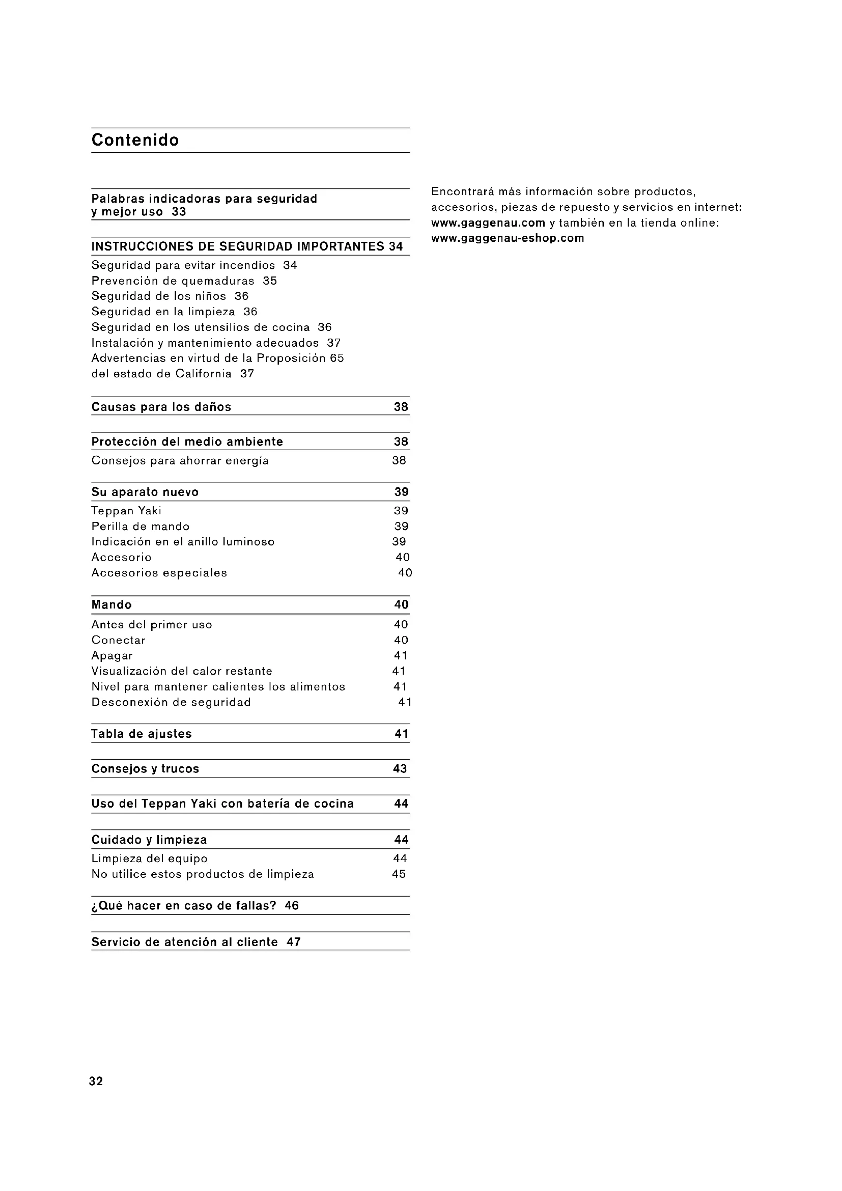 Seguridad para evitar incendios 34 Prevención de quemaduras 35 Seguridad de los niños 36 Seguridad en la limpieza 36 Seguridad en los utensilios de cocina 36 Instalación y mantenimiento adecuados 37 Advertencias en virtud de la Proposición 65 del estado de California 37 Causas para los daños 38 Protección del medio ambiente 38 Consejos para ahorrar energía 38 Su aparato nuevo 39 Teppan Yaki 39 Perilla de mando 39 Indicación en el anillo luminoso 39 Accesorio 40 Accesorios especiales 40 Mando 40 Antes del primer uso 40 Conectar 40 Apagar 41 Visualización del calor restante 41 Nivel para mantener calientes los alimentos 41 Desconexión de seguridad 41 Tabla de ajustes 41 Consejos y trucos 43 Uso del Teppan Yaki con batería de cocina 44 Cuidado y limpieza 44 Limpieza del equipo 44 No utilice estos productos de limpieza 45 ¿Qué hacer en caso de fallas? 46 Servicio de atención al cliente 47 Encontrará más información sobre productos, accesorios, piezas de repuesto y servicios en internet: www.gaggenau.com y también en la tienda online: www.gaggenau-eshop.com33 Palabras indicadoras para seguridad y mejor uso 9 AVISO Esto indica que se pueden producir lesiones graves o la muerte si no se cumple con esta advertencia. 9 ATENCION Esto indica que pueden producirse lesiones leves o moderadas si no se cumple con esta advertencia. AVISO: esto indica que puede producirse un daño al electrodoméstico o a la propiedad como resultado de la falta de cumplimiento de este aviso. Nota: Esto lo alerta sobre información y/o consejos importantes.34