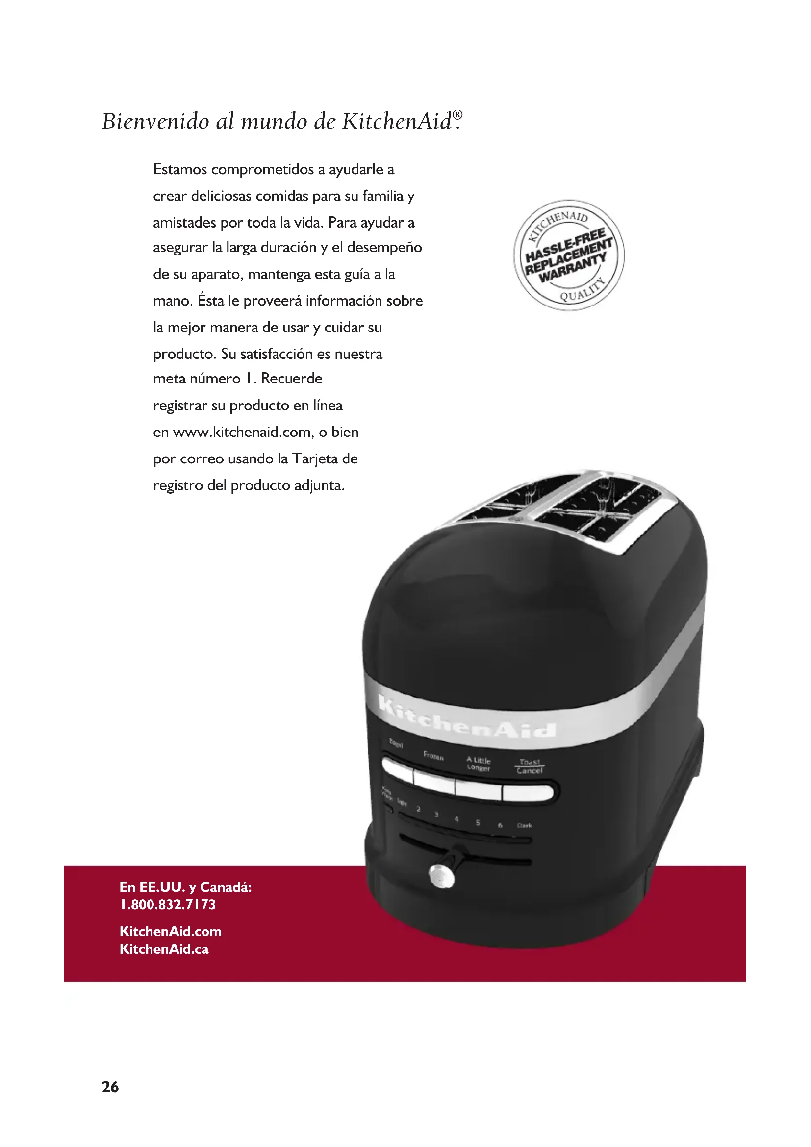 Estamos comprometidos a ayudarle a crear deliciosas comidas para su familia y amistades por toda la vida. Para ayudar a asegurar la larga duración y el desempeño de su aparato, mantenga esta guía a la mano. Ésta le proveerá información sobre la mejor manera de usar y cuidar su producto. Su satisfacción es nuestra meta número 1. Recuerde registrar su producto en línea en www.kitchenaid.com, o bien por correo usando la Tarjeta de registro del producto adjunta. W10510972A.indd 26 1/8/13 11:01 AM27 Español Índice