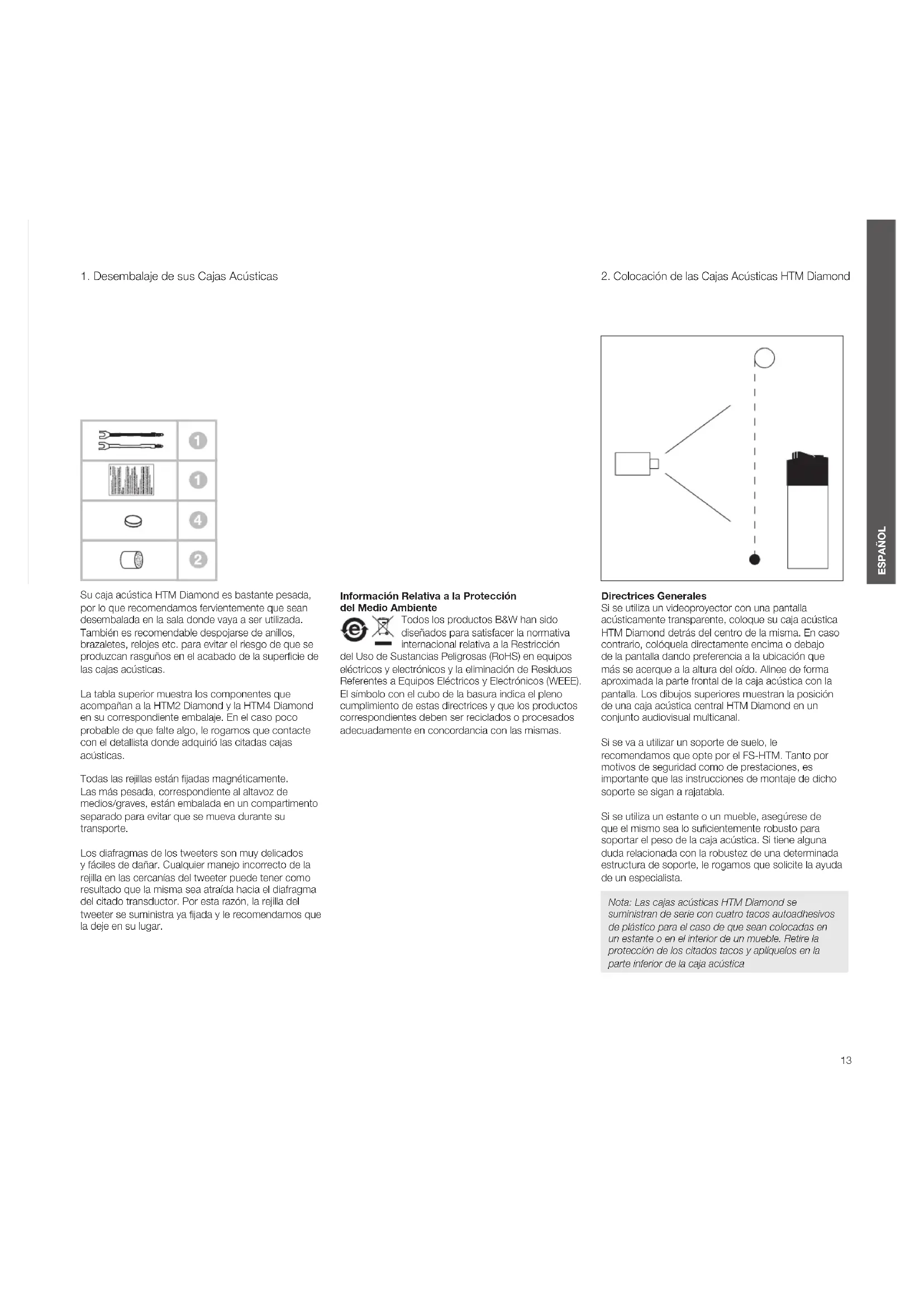Su caja acústica HTM Diamond es bastante pesada, por lo que recomendamos fervientemente que sean desembalada en la sala donde vaya a ser utilizada. También es recomendable despojarse de anillos, brazaletes, relojes etc. para evitar el riesgo de que se produzcan rasguños en el acabado de la supercie de las cajas acústicas. La tabla superior muestra los componentes que acompañan a la HTM2 Diamond y la HTM4 Diamond en su correspondiente embalaje. En el caso poco probable de que falte algo, le rogamos que contacte con el detallista donde adquirió las citadas cajas acústicas. Todas las rejillas están jadas magnéticamente. Las más pesada, correspondiente al altavoz de medios/graves, están embalada en un compartimento separado para evitar que se mueva durante su transporte. Los diafragmas de los tweeters son muy delicados y fáciles de dañar. Cualquier manejo incorrecto de la rejilla en las cercanías del tweeter puede tener como resultado que la misma sea atraída hacia el diafragma del citado transductor. Por esta razón, la rejilla del tweeter se suministra ya jada y le recomendamos que la deje en su lugar. Información Relativa a la Protección del Medio Ambiente Todos los productos B&W han sido diseñados para satisfacer la normativa internacional relativa a la Restricción del Uso de Sustancias Peligrosas (RoHS) en equipos eléctricos y electrónicos y la eliminación de Residuos Referentes a Equipos Eléctricos y Electrónicos (WEEE). El símbolo con el cubo de la basura indica el pleno cumplimiento de estas directrices y que los productos correspondientes deben ser reciclados o procesados adecuadamente en concordancia con las mismas. Directrices Generales Si se utiliza un videoproyector con una pantalla acústicamente transparente, coloque su caja acústica HTM Diamond detrás del centro de la misma. En caso contrario, colóquela directamente encima o debajo de la pantalla dando preferencia a la ubicación que más se acerque a la altura del oído. Alinee de forma aproximada la parte frontal de la caja acústica con la pantalla. Los dibujos superiores muestran la posición de una caja acústica central HTM Diamond en un conjunto audiovisual multicanal. Si se va a utilizar un soporte de suelo, le recomendamos que opte por el FS-HTM. Tanto por motivos de seguridad como de prestaciones, es importante que las instrucciones de montaje de dicho soporte se sigan a rajatabla. Si se utiliza un estante o un mueble, asegúrese de que el mismo sea lo sucientemente robusto para soportar el peso de la caja acústica. Si tiene alguna duda relacionada con la robustez de una determinada estructura de soporte, le rogamos que solicite la ayuda de un especialista. Nota: Las cajas acústicas HTM Diamond se suministran de serie con cuatro tacos autoadhesivos de plástico para el caso de que sean colocadas en un estante o en el interior de un mueble. Retire la protección de los citados tacos y aplíquelos en la parte inferior de la caja acústica14 ESPAÑOL