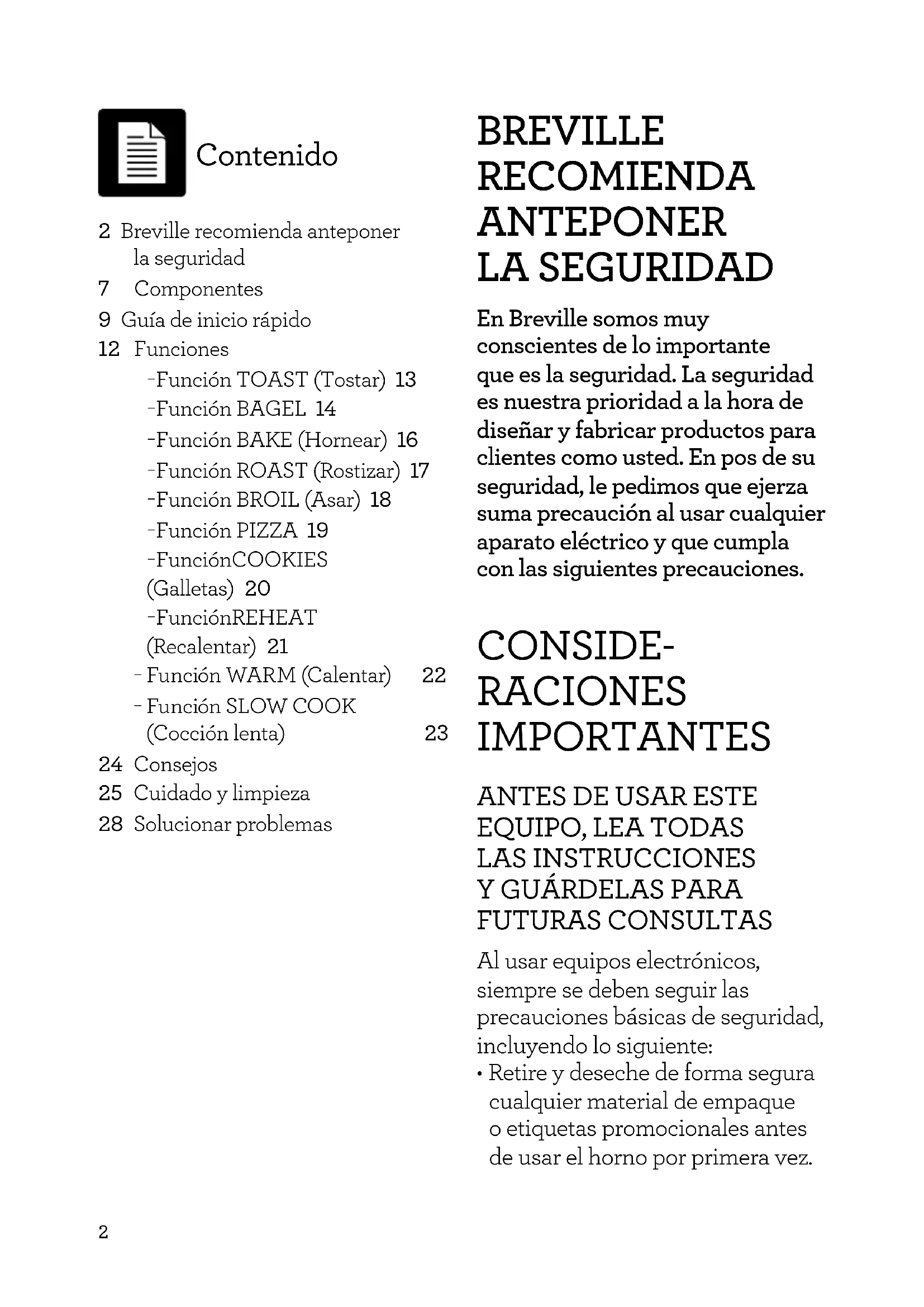 - Retire y deseche de forma segura cualquier material de empaque o etiquetas promocionales antes de usar el horno por primera vez. Contenido 2 Breville recomienda anteponer la seguridad 7 Componentes 9 Guía de inicio rápido 12 Funciones − Función TOAST (Tostar) 13 − Función BAGEL 14 − Función BAKE (Hornear) 16 − Función ROAST (Rostizar) 17 − Función BROIL (Asar) 18 − Función PIZZA 19 − Función COOKIES (Galletas) 20 − Función REHEAT (Recalentar) 21 − Función WARM (Calentar) 22 − Función SLOW COOK (Cocción lenta) 23 24 Consejos 25 Cuidado y limpieza 28 Solucionar problemas3