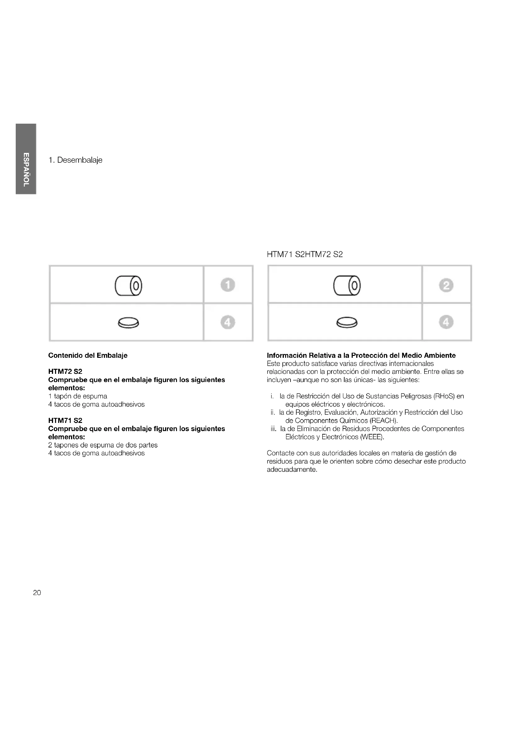 Contenido del Embalaje HTM72S2 Compruebe que en el embalaje guren los siguientes elementos: 1 tapón de espuma 4 tacos de goma autoadhesivos HTM71S2 Compruebe que en el embalaje guren los siguientes elementos: 2 tapones de espuma de dos partes 4 tacos de goma autoadhesivos Información Relativa a la Protección del Medio Ambiente Este producto satisface varias directivas internacionales relacionadas con la protección del medio ambiente. Entre ellas se incluyen –aunque no son las únicas- las siguientes: