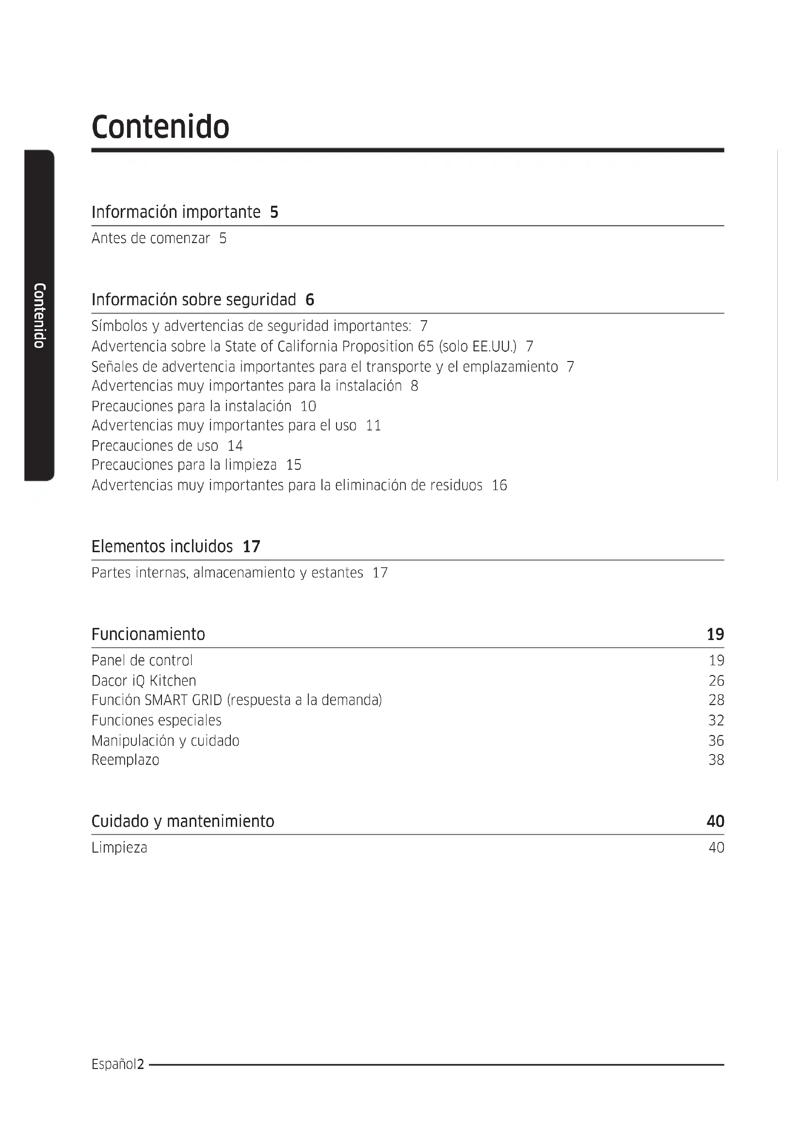 FDR_Dacor_BRF8000M_DA68-03574B-01_EN.indd 53 2017-03-31 12:53:42Memo FDR_Dacor_BRF8000M_DA68-03574B-01_EN.indd 54 2017-03-31 12:53:42Memo FDR_Dacor_BRF8000M_DA68-03574B-01_EN.indd 55 2017-03-31 12:53:42Dacor ∙ 14425 Clark Avenue, City of Industry, CA 91745 ∙ Phone: (800) 793-0093 ∙ Fax: (626) 403-3130 ∙ www.dacor.com DA68-03574B-01 FDR_Dacor_BRF8000M_DA68-03574B-01_EN.indd 56 2017-03-31 12:53:42Manual del usuario Refrigerador incorporado Heritage DRF36* FDR_Dacor_BRF8000M_DA68-03574B-01_MES.indd 1 2017-03-31 12:53:14Español2 Contenido Contenido Información importante 5 Antes de comenzar 5 Información sobre seguridad 6 Símbolos y advertencias de seguridad importantes: 7 Advertencia sobre la State of California Proposition 65 (solo EE.UU.) 7 Señales de advertencia importantes para el transporte y el emplazamiento 7 Advertencias muy importantes para la instalación 8 Precauciones para la instalación 10 Advertencias muy importantes para el uso 11 Precauciones de uso 14 Precauciones para la limpieza 15 Advertencias muy importantes para la eliminación de residuos 16 Elementos incluidos 17 Partes internas, almacenamiento y estantes 17 Funcionamiento 19 Panel de control 19 Dacor iQ Kitchen 26 Función SMART GRID (respuesta a la demanda) 28 Funciones especiales 32 Manipulación y cuidado 36 Reemplazo 38 Cuidado y mantenimiento 40 Limpieza 40 FDR_Dacor_BRF8000M_DA68-03574B-01_MES.indd 2 2017-03-31 12:53:14Español 3 Contenido Solución de problemas 41 General 41 ¿Se oyen ruidos anómalos procedentes del refrigerador? 45 Dacor iQ Kitchen 47 Smart Grid 48 Garantía y servicio 49 Atención al cliente 49 Garantía 49 Aviso regulatorio 53 Aviso de la FCC (Federal Communications Commission) 53 Aviso de la IC 54 FDR_Dacor_BRF8000M_DA68-03574B-01_MES.indd 3 2017-03-31 12:53:14Español4 Estimado cliente: Felicitaciones por haber adquirido este vanguardista producto Dacor®. Nuestra excepcional combinación de funciones, estilo y rendimiento nos convierten en The Life of the Kitchen™ y una excelente incorporación a su hogar. Para familiarizarse con los controles, las funciones y el completo potencial de su nuevo electrodoméstico Dacor, lea detenidamente este manual de uso y cuidado, comenzando por la sección Instrucciones importantes de seguridad. Todos los electrodomésticos Dacor se han diseñado y fabricado con la calidad y el orgullo que determina el marco de valores de nuestra empresa. Si se produjera algún problema con el producto, consulte en primer lugar la sección Solución de problemas de este manual. En ella encontrará sugerencias y soluciones útiles que puede seguir antes de llamar al servicio técnico. La valiosa opinión de los clientes nos ayuda a mejorar constantemente nuestros productos y servicios, y por ello le rogamos que contacte con nuestro Servicio de atención al cliente siempre que necesite asistencia con alguno de sus productos. Dacor Customer Service Team 14425 Clark Avenue City of Industry, CA 91745 Teléfono: (800) 793-0093 Fax: (626) 403-3130 Horario: De lunes a viernes de 6:00 a.m. a 5:00 p.m. Hora del Pacíco Sitio web: www.Dacor.com Gracias por elegir Dacor para su hogar. Somos una empresa formada por familias y para familias, y nuestra misión es servirlas. Estamos seguros de que su nuevo producto Dacor le ofrecerá un alto nivel de rendimiento y disfrute por muchos años. Atentamente, FDR_Dacor_BRF8000M_DA68-03574B-01_MES.indd 4 2017-03-31 12:53:14Español 5 Información importante Información importante Antes de comenzar Instalador