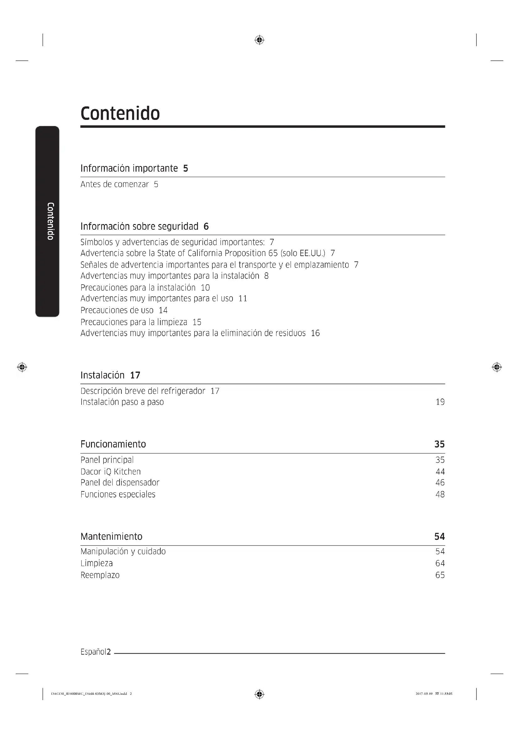 DACOR_RF8000MC_DA68-03563J-00_EN.indd 80 2017-03-09 11:32:41Memo Memo DACOR_RF8000MC_DA68-03563J-00_EN.indd 81 2017-03-09 11:32:41Memo DACOR_RF8000MC_DA68-03563J-00_EN.indd 82 2017-03-09 11:32:41Memo DACOR_RF8000MC_DA68-03563J-00_EN.indd 83 2017-03-09 11:32:41Dacor ∙ 14425 Clark Avenue, City of Industry, CA 91745 ∙ Phone: (800) 793-0093 ∙ Fax: (626) 403-3130 ∙ www.dacor.com DA68-03563J-00 DACOR_RF8000MC_DA68-03563J-00_EN.indd 84 2017-03-09 11:32:41Manual del usuario Refrigerador DRF36C* DACOR_RF8000MC_DA68-03563J-00_MES.indd 1 2017-03-09 11:33:05Español2 Contenido Contenido Información importante 5 Antes de comenzar 5 Información sobre seguridad 6 Símbolos y advertencias de seguridad importantes: 7 Advertencia sobre la State of California Proposition 65 (solo EE.UU.) 7 Señales de advertencia importantes para el transporte y el emplazamiento 7 Advertencias muy importantes para la instalación 8 Precauciones para la instalación 10 Advertencias muy importantes para el uso 11 Precauciones de uso 14 Precauciones para la limpieza 15 Advertencias muy importantes para la eliminación de residuos 16 Instalación 17 Descripción breve del refrigerador 17 Instalación paso a paso 19 Funcionamiento 35 Panel principal 35 Dacor iQ Kitchen 44 Panel del dispensador 46 Funciones especiales 48 Mantenimiento 54 Manipulación y cuidado 54 Limpieza 64 Reemplazo 65 DACOR_RF8000MC_DA68-03563J-00_MES.indd 2 2017-03-09 11:33:05Español 3 Contenido Solución de problemas 68 General 68 ¿Se oyen ruidos anómalos procedentes del refrigerador? 73 Dacor iQ Kitchen 75 Garantía y servicio 76 Atención al cliente 76 Garantía 76 Aviso regulatorio 80 Aviso de la FCC (Federal Communications Commission) 80 Aviso de la IC 81 DACOR_RF8000MC_DA68-03563J-00_MES.indd 3 2017-03-09 11:33:05Español4 Estimado cliente: Felicitaciones por haber adquirido este vanguardista producto Dacor®. Nuestra excepcional combinación de funciones, estilo y rendimiento nos convierten en The Life of the Kitchen™ y una excelente incorporación a su hogar. Para familiarizarse con los controles, las funciones y el completo potencial de su nuevo electrodoméstico Dacor, lea detenidamente este manual de uso y cuidado, comenzando por la sección Instrucciones importantes de seguridad. Todos los electrodomésticos Dacor se han diseñado y fabricado con la calidad y el orgullo que determina el marco de valores de nuestra empresa. Si se produjera algún problema con el producto, consulte en primer lugar la sección Solución de problemas de este manual. En ella encontrará sugerencias y soluciones útiles que puede seguir antes de llamar al servicio técnico. La valiosa opinión de los clientes nos ayuda a mejorar constantemente nuestros productos y servicios, y por ello le rogamos que contacte con nuestro Servicio de atención al cliente siempre que necesite asistencia con alguno de sus productos. Dacor Customer Service Team 14425 Clark Avenue City of Industry, CA 91745 Teléfono: (800) 793-0093 Fax: (626) 403-3130 Horario: De lunes a viernes de 6:00 a.m. a 5:00 p.m. Hora del Pacíco Sitio web: www.Dacor.com Gracias por elegir Dacor para su hogar. Somos una empresa formada por familias y para familias, y nuestra misión es servirlas. Estamos seguros de que su nuevo producto Dacor le ofrecerá un alto nivel de rendimiento y disfrute por muchos años. Atentamente, DACOR_RF8000MC_DA68-03563J-00_MES.indd 4 2017-03-09 11:33:05Español 5 Información importante Información importante Antes de comenzar Instalador