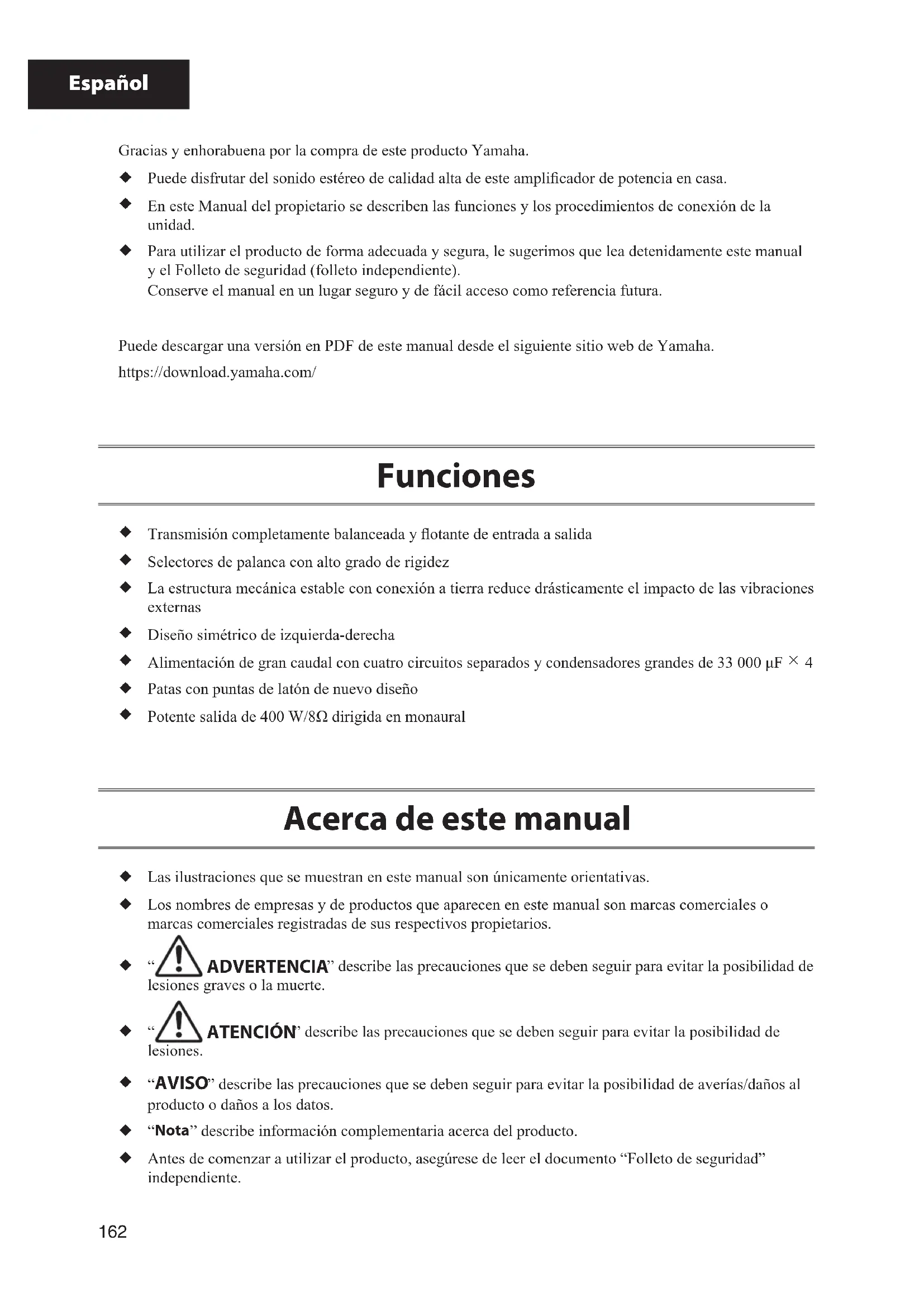 Para utilizar el producto de forma adecuada y segura, le sugerimos que lea detenidamente este manual y el Folleto de seguridad (folleto independiente). Conserve el manual en un lugar seguro y de fácil acceso como referencia futura. Puede descargar una versión en PDF de este manual desde el siguiente sitio web de Yamaha. https://download.yamaha.com/ Funciones