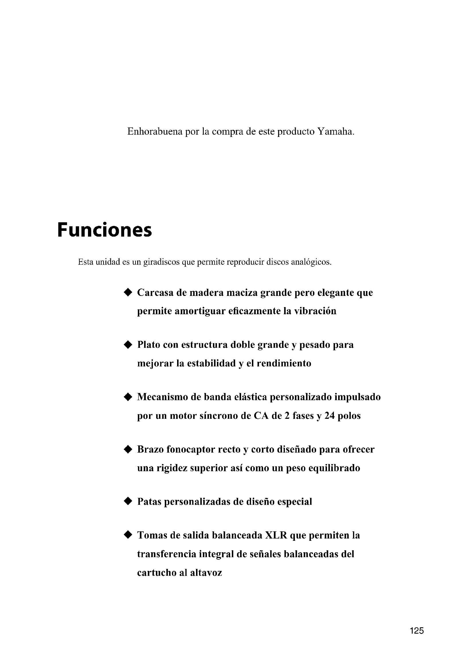 - Explicación de los símbolos grácos utilizados en este manual: Símbolo Descripción ADVERTENCIA Indica puntos que deben observarse para evitar el riesgo de muerte o lesiones graves. ATENCIÓN Indica puntos que deben observarse para evitar el riesgo de lesiones. AVISO Indica puntos que deben observarse para evitar dañar el producto o provocar una avería. Nota Indica información complementaria que puede resultarle útil.127 Contenido Funciones . . . . . . . . . .125 Antes de empezar . . . . . .126 Acerca de este manual . . . . . . . 126 Comprobación de los accesorios suministrados . . . . . . . . . . . . 128 Nombres de las partes . . . . . . . 130 Preparación . . . . . . . . .133 Ubicación . . . . . . . . . . . . . . 133 Montaje . . . . . . . . . . . . . . 134 Montaje de la unidad . . . . . . . . . . 134 Instalación de un cartucho . . . . . . 136 Conexiones . . . . . . . . . . . . . 137 Ajustes . . . . . . . . . . . . . . . 139 Ajuste de la presión de aguja . . . . . 139 Ajuste de la altura del brazo fonocaptor . . . . . . . . . . . . . . . . 140 Encendido de la unidad . . . . . . . 141 Reproducción de un disco . .142 Puesta en marcha del disco . . . . . 142 Pausa del disco . . . . . . . . . . . . . 143 Detención del disco . . . . . . . . . . 143 En caso necesario . . . . . . .144 Comprobación de la velocidad . . . 144 Cuidados . . . . . . . . . . . . . . 144 Sustitución de la correa . . . . . . . 145 Resolución de problemas . . . . . . 146 Apéndice . . . . . . . . . . .148 Especicaciones . . . . . . . . . . 148128 Comprobación de los accesorios suministrados Asegúrese de que todos los elementos están presentes. Nota