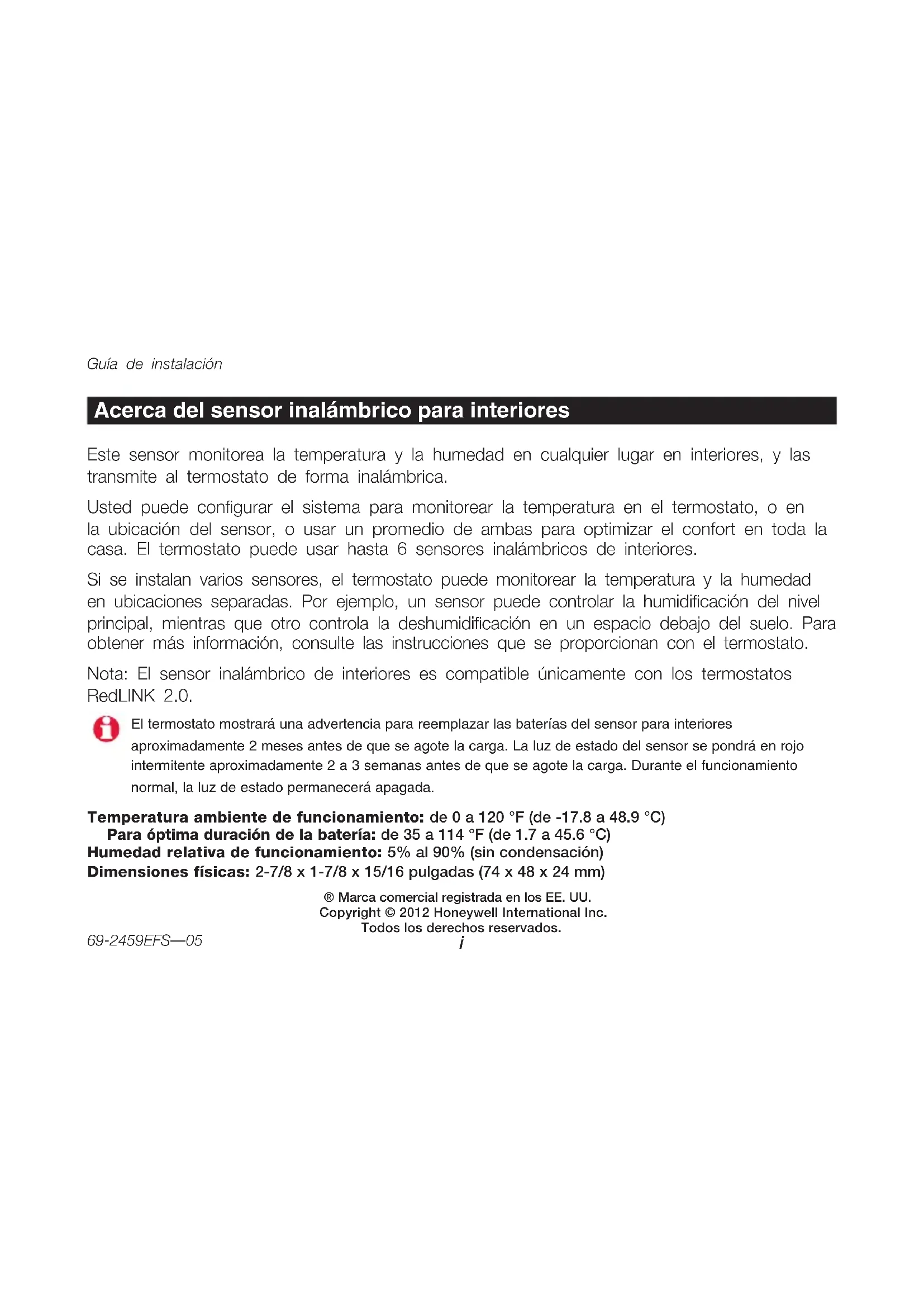 fonctionnement non souhaité.i 69-2459EFS—05 Guía de instalación ® Marca comercial registrada en los EE. UU. Copyright © 2012 Honeywell International Inc. Todos los derechos reservados. Acerca del sensor inalámbrico para interiores Este sensor monitorea la temperatura y la humedad en cualquier lugar en interiores, y las transmite al termostato de forma inalámbrica. Usted puede congurar el sistema para monitorear la temperatura en el termostato, o en la ubicación del sensor, o usar un promedio de ambas para optimizar el confort en toda la casa. El termostato puede usar hasta 6 sensores inalámbricos de interiores. Si se instalan varios sensores, el termostato puede monitorear la temperatura y la humedad en ubicaciones separadas. Por ejemplo, un sensor puede controlar la humidicación del nivel principal, mientras que otro controla la deshumidicación en un espacio debajo del suelo. Para obtener más información, consulte las instrucciones que se proporcionan con el termostato. Nota: El sensor inalámbrico de interiores es compatible únicamente con los termostatos RedLINK 2.0. El termostato mostrará una advertencia para reemplazar las baterías del sensor para interiores aproximadamente 2 meses antes de que se agote la carga. La luz de estado del sensor se pondrá en rojo intermitente aproximadamente 2 a 3 semanas antes de que se agote la carga. Durante el funcionamiento normal, la luz de estado permanecerá apagada. Temperatura ambiente de funcionamiento: de 0 a 120 °F (de -17.8 a 48.9 °C) Para óptima duración de la batería: de 35 a 114 °F (de 1.7 a 45.6 °C) Humedad relativa de funcionamiento: 5% al 90% (sin condensación) Dimensiones físicas: 2-7/8 x 1-7/8 x 15/16 pulgadas (74 x 48 x 24 mm)Sensor inalámbrico para interiores