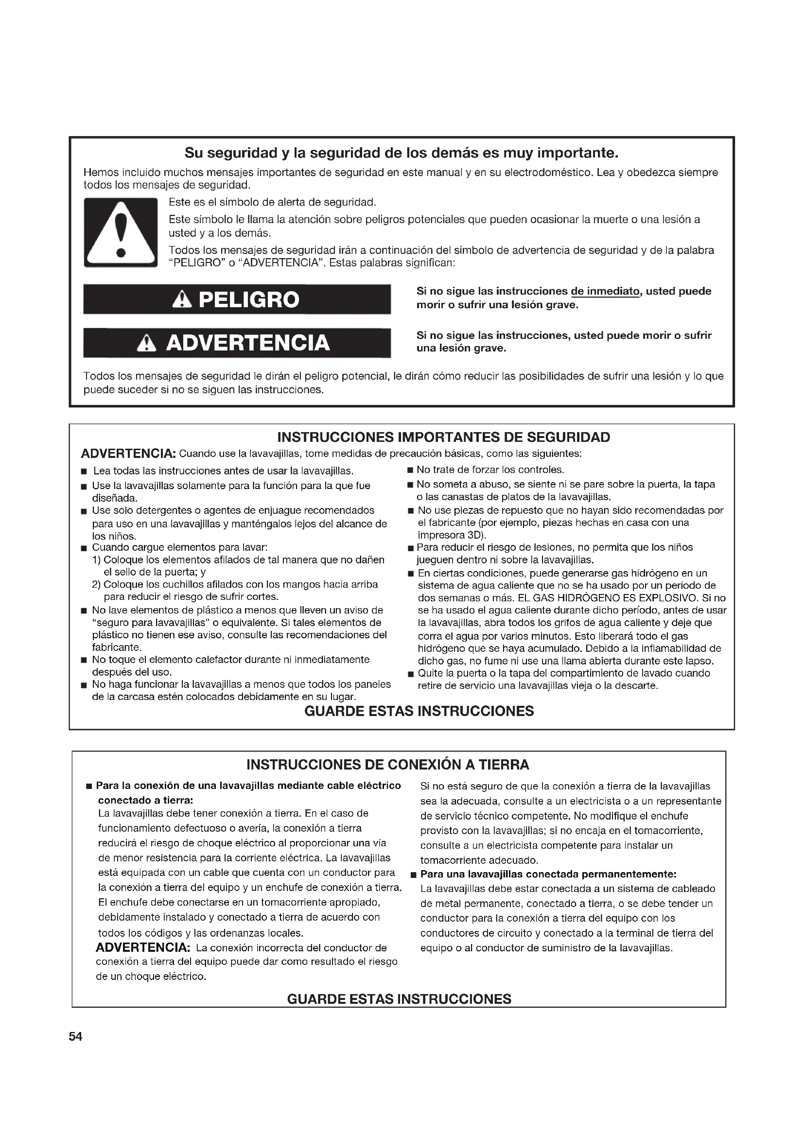 Si no sigue las instrucciones de inmediato, usted puede morir o sufrir una lesión grave.Si no sigue las instrucciones, usted puede morir o sufrir una lesión grave. Todos los mensajes de seguridad le dirán el peligro potencial, le dirán cómo reducir las posibilidades de sufrir una lesión y lo que puede suceder si no se siguen las instrucciones. Su seguridad y la seguridad de los demás es muy importante. Hemos incluido muchos mensajes importantes de seguridad en este manual y en su electrodoméstico. Lea y obedezca siempre todos los mensajes de seguridad. ADVERTENCIA PELIGRO Este es el símbolo de alerta de seguridad.Este símbolo le llama la atención sobre peligros potenciales que pueden ocasionar la muerte o una lesión a usted y a los demás.Todos los mensajes de seguridad irán a continuación del símbolo de advertencia de seguridad y de la palabra “PELIGRO” o “ADVERTENCIA”. Estas palabras significan: