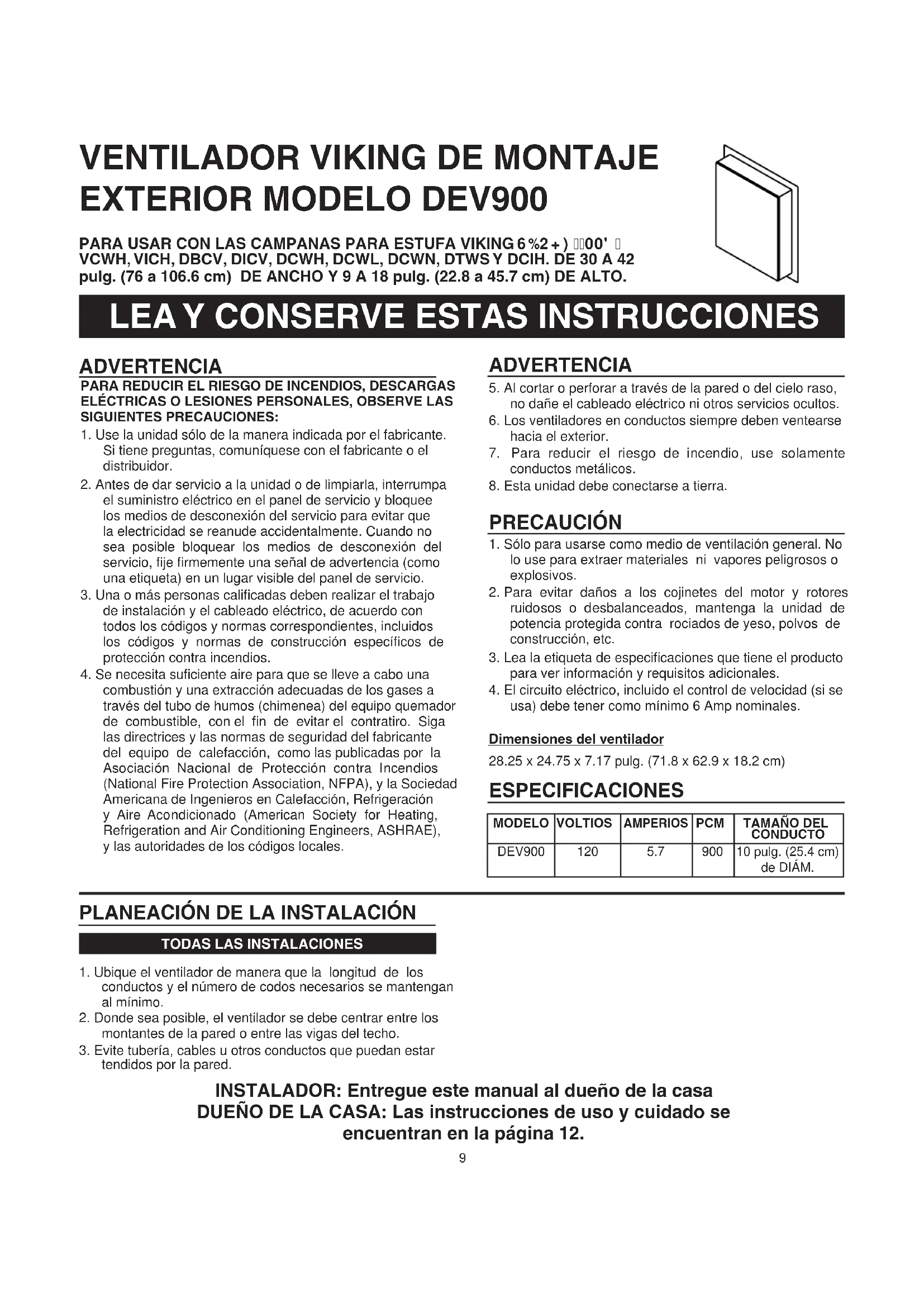 MODELO VOLTIOS AMPERIOS PCM TAMAÑO DEL CONDUCTO DEV900 120 5.7 900 10 pulg. (25.4 cm) de DIÁM. ESPECIFICACIONES INSTALADOR: Entregue este manual al dueño de la casa DUEÑO DE LA CASA: Las instrucciones de uso y cuidado se encuentran en la página 12. 5. Al cortar o perforar a través de la pared o del cielo raso,no dañe el cableado eléctrico ni otros servicios ocultos.6. Los ventiladores en conductos siempre deben ventearsehacia el exterior.