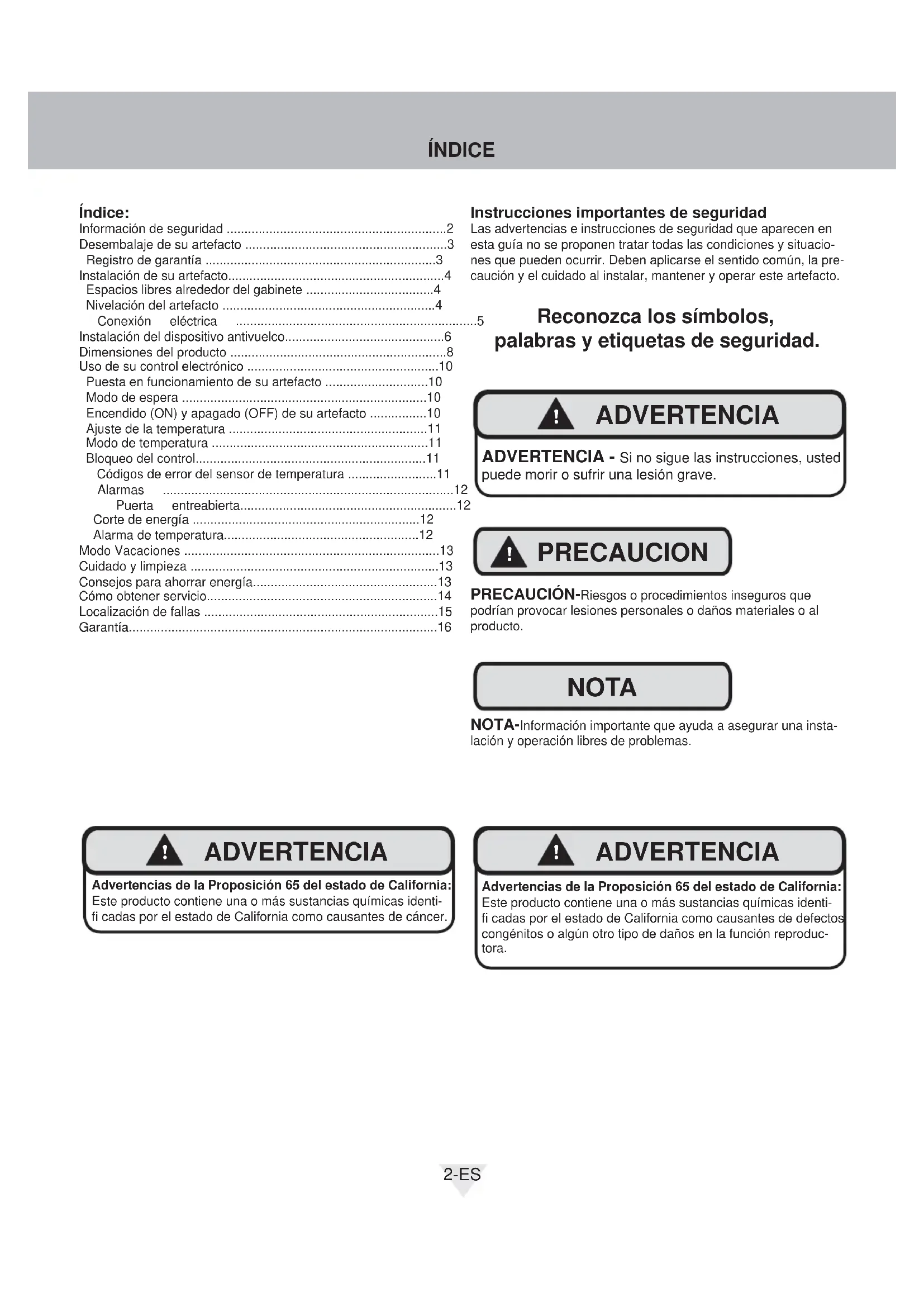 - PRECAUCION Instrucciones importantes de seguridad Las advertencias e instrucciones de seguridad que aparecen en esta guía no se proponen tratar todas las condiciones y situacio-nes que pueden ocurrir. Deben aplicarse el sentido común, la pre-caución y el cuidado al instalar, mantener y operar este artefacto. Reconozca los símbolos, palabras y etiquetas de seguridad. PRECAUCIÓN-Riesgos o procedimientos inseguros que podrían provocar lesiones personales o daños materiales o al producto. NOTA-Información importante que ayuda a asegurar una insta- lación y operación libres de problemas. Índice: Información de seguridad p. 2