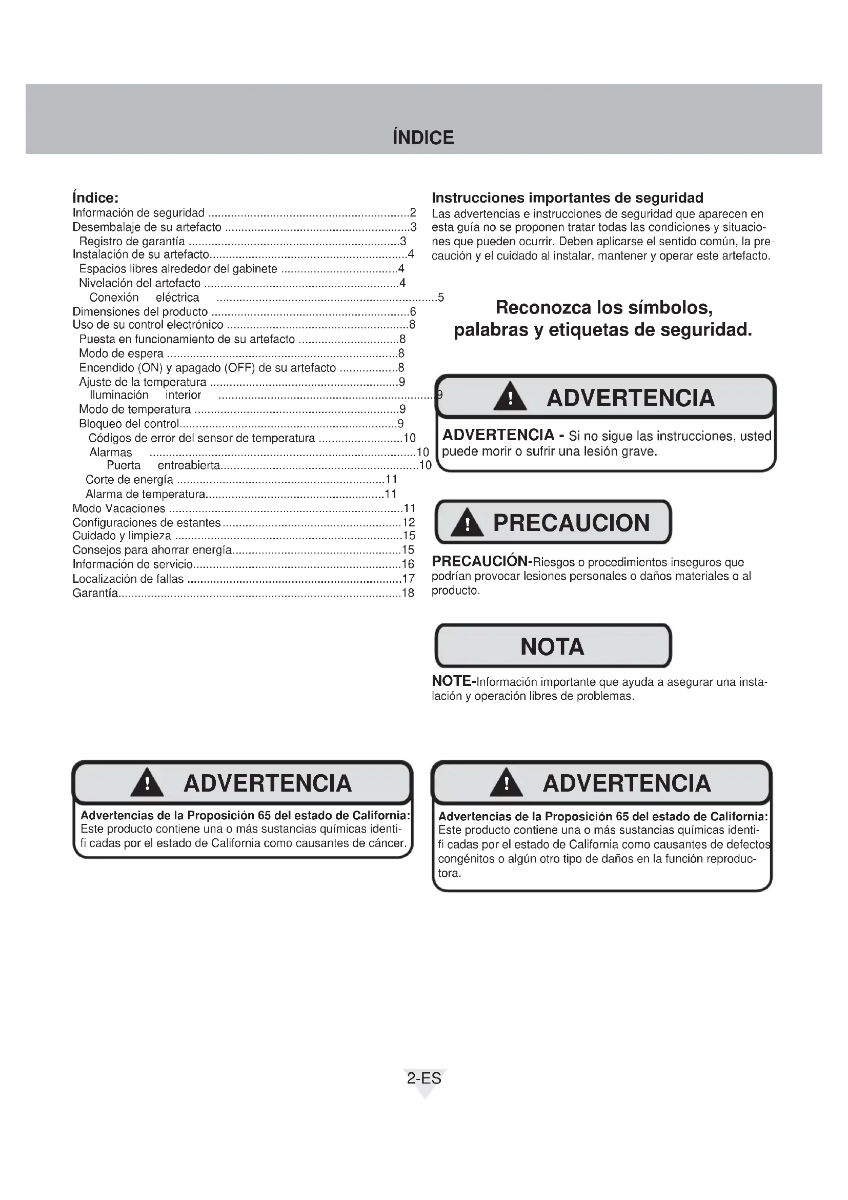 ADVERTENCIA Advertencias de la Proposición 65 del estado de California: Este producto contiene una o más sustancias químicas identi-fi cadas por el estado de California como causantes de defectos congénitos o algún otro tipo de daños en la función reproduc-tora.