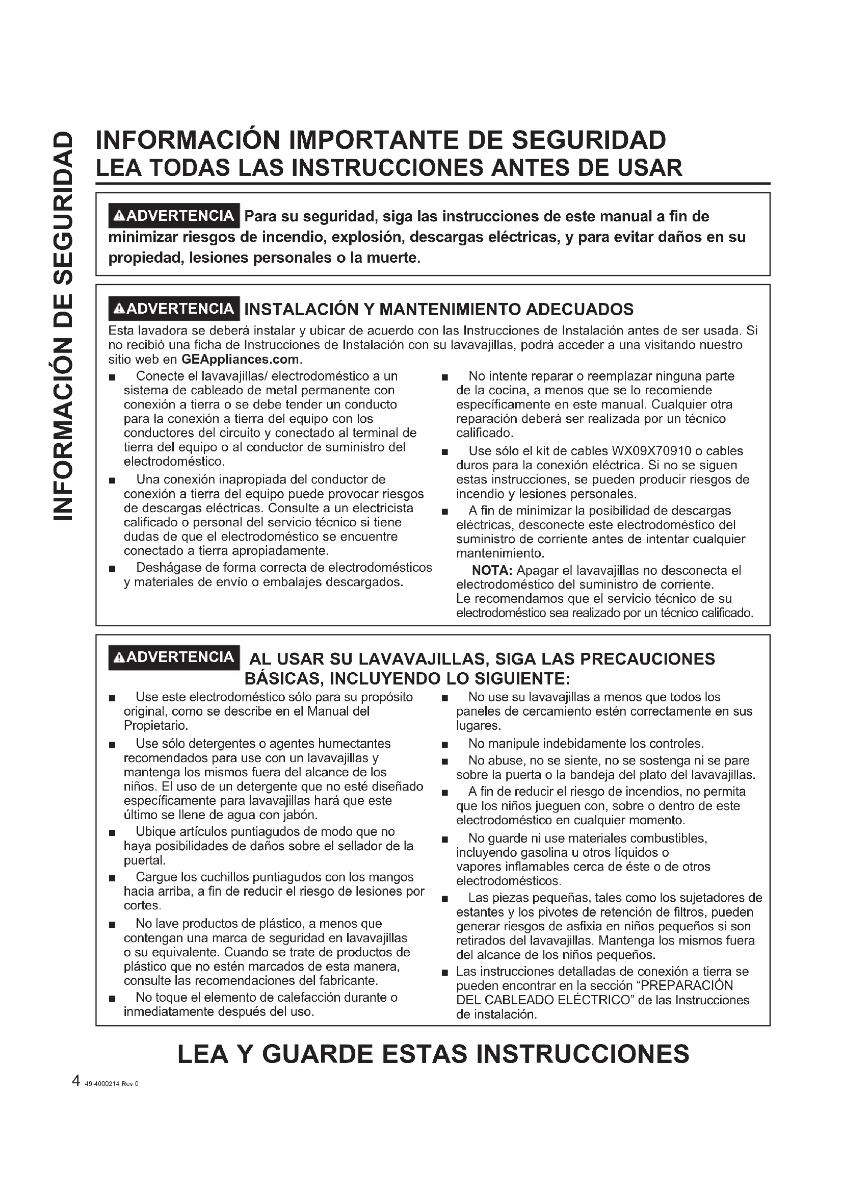 Esta lavadora se deberá instalar y ubicar de acuerdo con las Instrucciones de Instalación antes de ser usada. Si no recibió una ficha de Instrucciones de Instalación con su lavavajillas, podrá acceder a una visitando nuestro sitio web en GEAppliances.com.■ Conecteellavavajillas/electrodomésticoaunsistema de cableado de metal permanente con conexión a tierra o se debe tender un conducto para la conexión a tierra del equipo con los conductores del circuito y conectado al terminal de tierra del equipo o al conductor de suministro del electrodoméstico.■ Unaconexióninapropiadadelconductordeconexión a tierra del equipo puede provocar riesgos de descargas eléctricas. Consulte a un electricista calificado o personal del servicio técnico si tiene dudas de que el electrodoméstico se encuentre conectado a tierra apropiadamente.■ Deshágasedeformacorrectadeelectrodomésticosy materiales de envío o embalajes descargados.■ Nointenterepararoreemplazarningunapartede la cocina, a menos que se lo recomiende específicamente en este manual. Cualquier otra reparación deberá ser realizada por un técnico calificado.■ UsesóloelkitdecablesWX09X70910ocablesduros para la conexión eléctrica. Si no se siguen estas instrucciones, se pueden producir riesgos de incendio y lesiones personales.■ Afindeminimizarlaposibilidaddedescargaseléctricas, desconecte este electrodoméstico del suministro de corriente antes de intentar cualquier mantenimiento. NOTA: Apagar el lavavajillas no desconecta el electrodoméstico del suministro de corriente. Le recomendamos que el servicio técnico de su electrodoméstico sea realizado por un técnico calificado. ADVERTENCIA AL USAR SU LAVAVAJILLAS, SIGA LAS PRECAUCIONES BÁSICAS, INCLUYENDO LO SIGUIENTE: ■ Useesteelectrodomésticosóloparasupropósitooriginal, como se describe en el Manual del Propietario.■ Usesólodetergentesoagenteshumectantesrecomendados para use con un lavavajillas y mantenga los mismos fuera del alcance de los niños. El uso de un detergente que no esté diseñado específicamente para lavavajillas hará que este último se llene de agua con jabón.■ Ubiqueartículospuntiagudosdemodoquenohaya posibilidades de daños sobre el sellador de la puertal.■ Cargueloscuchillospuntiagudosconlosmangoshacia arriba, a fin de reducir el riesgo de lesiones por cortes.■ Nolaveproductosdeplástico,amenosquecontengan una marca de seguridad en lavavajillas o su equivalente. Cuando se trate de productos de plástico que no estén marcados de esta manera, consulte las recomendaciones del fabricante.■ Notoqueelelementodecalefacciónduranteoinmediatamente después del uso.■ Nousesulavavajillasamenosquetodoslospaneles de cercamiento estén correctamente en sus lugares.■ Nomanipuleindebidamenteloscontroles.■ Noabuse,nosesiente,nosesostenganiseparesobre la puerta o la bandeja del plato del lavavajillas.■ Afindereducirelriesgodeincendios,nopermitaque los niños jueguen con, sobre o dentro de este electrodoméstico en cualquier momento.■ Noguardeniusematerialescombustibles,incluyendo gasolina u otros líquidos o vapores inflamables cerca de éste o de otros electrodomésticos.■ Laspiezaspequeñas,talescomolossujetadoresdeestantes y los pivotes de retención de filtros, pueden generar riesgos de asfixia en niños pequeños si son retirados del lavavajillas. Mantenga los mismos fuera del alcance de los niños pequeños. ■ Las instrucciones detalladas de conexión a tierra se puedenencontrarenlasección“PREPARACIÓNDELCABLEADOELÉCTRICO”delasInstruccionesde instalación.49-4000214 Rev 0 5