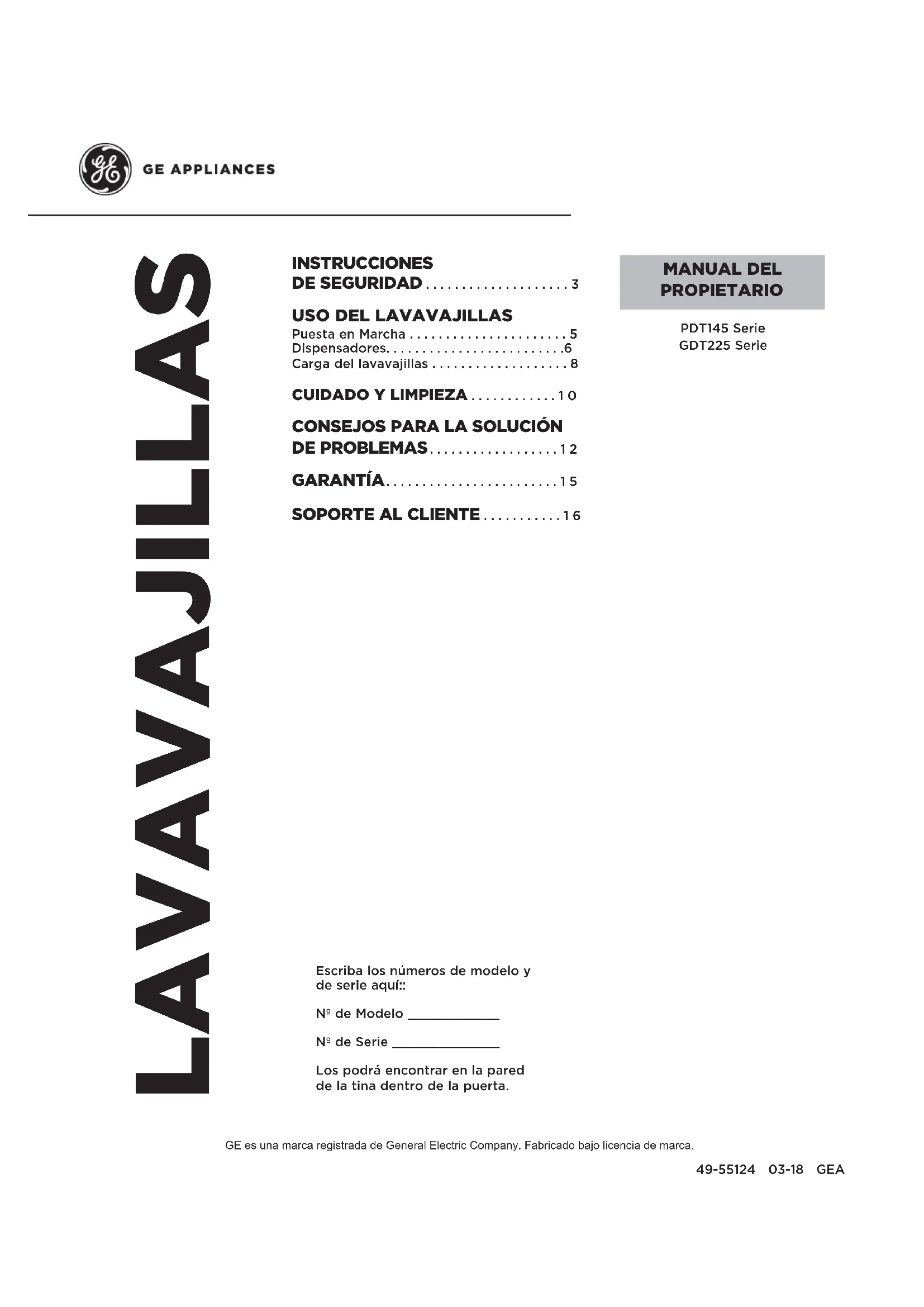 Appliances la información sobre su electrodoméstico. Si no desea que los datos de su electrodoméstico sean enviados a *($SSOLDQFHVVROLFLWDPRVTXHOHLQGLTXHDVXWpFQLFR12HQWUHJDUORVGDWRVD*($SSOLDQFHVHQHOPRPHQWRGHOVHUYLFLR Qué No Cubrirá GE Appliances: Ŷ 9LDMHVGHOWpFQLFRGHOVHUYLFLRDVXKRJDUSDUD enseñarle sobre cómo usar el producto. Ŷ ,QVWDODFLyQHQWUHJDRPDQWHQLPLHQWR inadecuados. Ŷ )DOODVGHOSURGXFWRHQFDVRGHDEXVRPDOXVR o uso para propósitos diferentes al original o uso comercial. Ŷ 5HHPSOD]RGHIXVLEOHVGHODFDVDRUHLQLFLRGH disyuntores. Ŷ 3URGXFWRQRDFFHVLEOHSDUDEULQGDUHOVHUYLFLR requerido. Ŷ 'DxRVRFDVLRQDGRVVREUHHOSURGXFWRSRU accidente, incendio, inundaciones o catástrofes naturales. Ŷ 'DxRVLQFLGHQWDOHVRFRQVHFXHQWHVFDXVDGRV por posibles defectos sobre este producto. Ŷ /LPSLH]DRVHUYLFLRWpFQLFRGHOGLVSRVLWLYRGH espacio de aire en la línea de drenaje. Ŷ 'DxRRFDVLRQDGROXHJRGHODHQWUHJD incluyendo daños sobre productos que sufrieron caídas al suelo. GARANTÍA Garantía del Lavavajillas de GE Appliances Por el Período de: GE Appliances reemplazará: Un Año 'HVGHODIHFKDGH compra original Cualquier parte del lavavajillas que falle debido a un defecto en los materiales o la IDEULFDFLyQ'XUDQWHHVWDgarantía limitada de un año, GE Appliances también proveerá, sin costo, todo el trabajo y el servicio en el shogar relacionado con el reemplazo de la pieza que presente defectos. Esta garantía se extiende al comprador original y a cualquier dueño subsiguiente de productos comprados para uso KRJDUHxRGHQWURGH((886LHOSURGXFWRHVWiHQXQiUHDGRQGHQRVHHQFXHQWUDGLVSRQLEOHXQ3URYHHGRU$XWRUL]DGR del Servicio Técnico de GE Appliances, usted será responsable por el costo de un viaje o se podrá requerir que traiga el producto a una ubicación del Servicio Técnico de GE Appliances Autorizado para recibir el servicio. Para acceder al VHUYLFLRWpFQLFRFRUUHVSRQGLHQWHDODJDUDQWtDVHGHEHUiFRQWDUFRQODSUXHEDGHODIHFKDRULJLQDOGHFRPSUD(Q$ODVND la garantía excluye el costo de envío o llamadas del servicio a su hogar. Algunos estados no permiten la exclusión o limitación de daños fortuitos o consecuentes. Esta garantía le da derechos legales específicos y es posible que tenga otros derechos legales que varían entre un estado y otro. Para conocer cuáles son sus derechos legales, consulte a la oficina de asuntos del consumidor local o estatal o al Fiscal de su estado. Garante: GE Appliances, a Haier Company EXCLUSIÓN DE GARANTÍAS IMPLÍCITAS Su única y exclusiva alternativa es la reparación del producto, como se indica en la Garantía Limitada. Las garantías implícitas, incluyendo garantías implícitas de comerciabilidad o conveniencia sobre un propósito particular, se limitan a un año o al período más corto permitido por la ley. Abroche su recibo aquí. Para acceder al servicio técnico de acuerdo con la garantía deberá contar con la prueba de la fecha original de compra. Garantías Extendidas: Adquiera una garantía extendida de GE Appliances y conozca los descuentos especiales que están disponibles mientras su garantía aún está vigente. Puede acceder a la misma a través de Internet en cualquier momento en www.geappliances.com/service_and_support/shop-for-extended-service-plans.htm ROODPDQGRDOGXUDQWHHOKRUDULRFRPHUFLDO/RV6HUYLFLRVSDUDORV*($SSOLDQFHVD~QHVWDUiQ disponibles cuando su garantía caduque. 49-55124 Soporte para el Consumidor