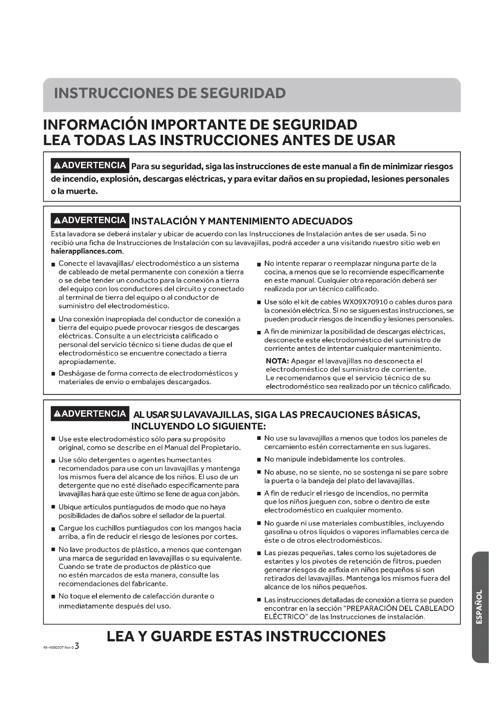ACERO INOXIDABLE El acero inoxidable usado para fabricar la tina del lavavajillas y la puerta interna brinda la mayor confiabilidad disponible en un lavavajillas de Haier Appliances. Si la tina del lavavajillas o la puerta interna fueran rayados o abollados durante el uso normal, los mismos no se oxidarán ni corroerán. Estas imperfecciones sobre la superficie no afectarán su funcionamiento o durabilidad.49-4000207 Rev 0 19 ESPAÑOL