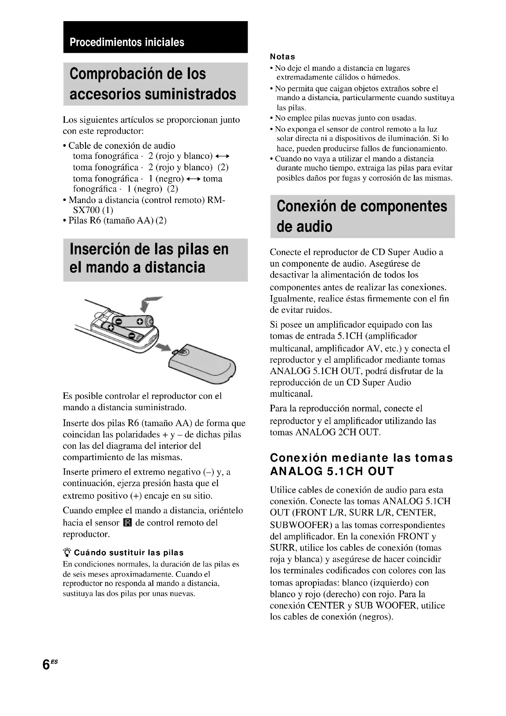 - Cuando no vaya a utilizar el mando a distancia durante mucho tiempo, extraiga las pilas para evitar posibles daños por fugas y corrosión de las mismas. Conexión de componentes de audio Conecte el reproductor de CD Super Audio a un componente de audio. Asegúrese de desactivar la alimentación de todos los componentes antes de realizar las conexiones. Igualmente, realice éstas firmemente con el fin de evitar ruidos. Si posee un amplificador equipado con las tomas de entrada 5.1CH (amplificador multicanal, amplificador AV, etc.) y conecta el reproductor y el amplificador mediante tomas ANALOG 5.1CH OUT, podrá disfrutar de la reproducción de un CD Super Audio multicanal. Para la reproducción normal, conecte el reproductor y el amplificador utilizando las tomas ANALOG 2CH OUT. Conexión mediante las tomas