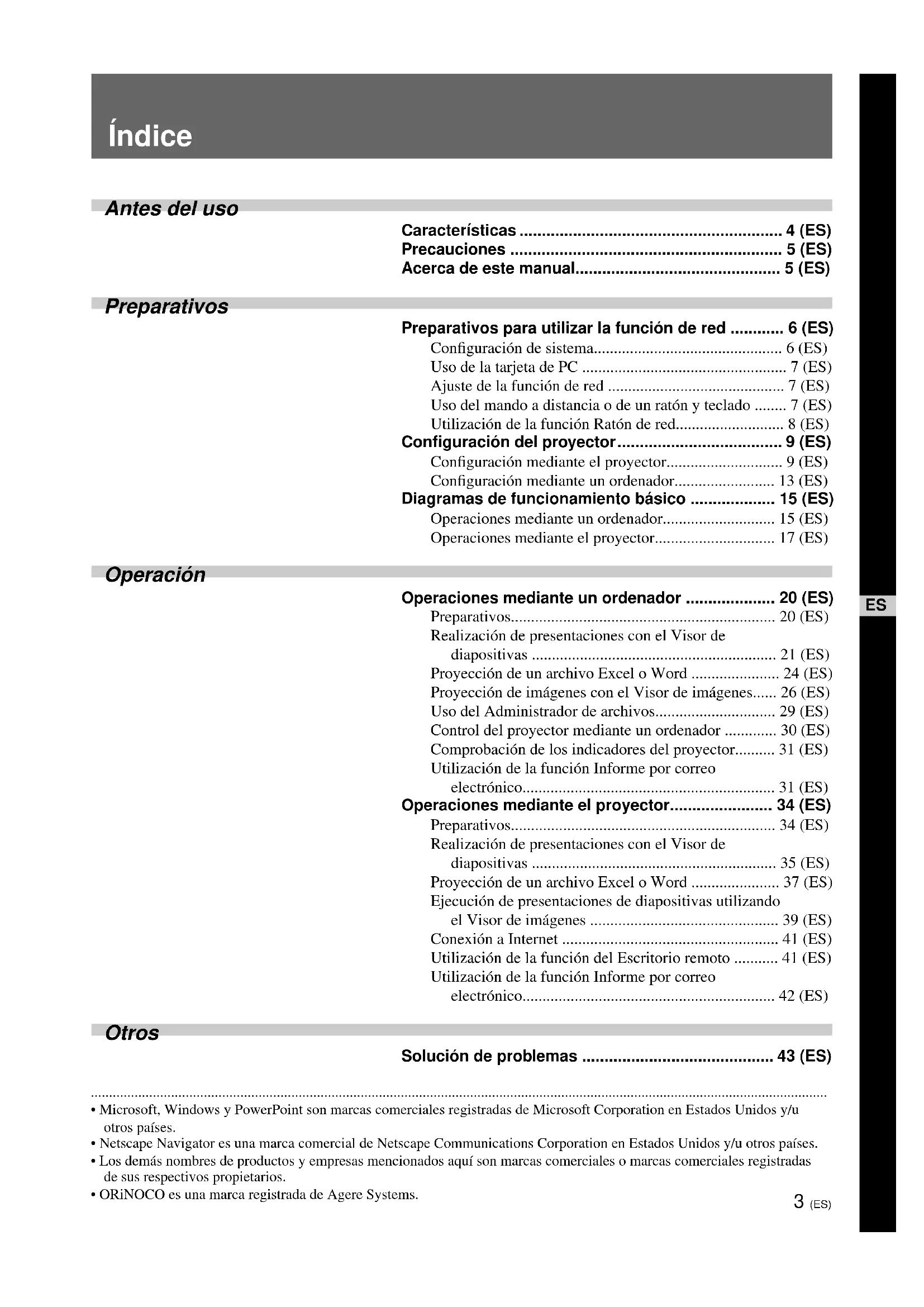 - ORiNOCO es una marca registrada de Agere Systems. ES4 (ES) Características Explorador web incorporado Internet Explorer 4.0 y su equivalente están incorporados en el proyector, lo que permite conectarse a Internet. Función Búsqueda automática del proyector Si el ordenador tiene instalado Windows Me o Windows XP, podrá obtener fácil acceso al explorador web del proyector haciendo doble clic sobre el correspondiente icono del proyector en la ventana Mi red del ordenador. Puede iniciar una presentación inmediatamente. Función Ratón de red Esta función permite utilizar el proyector para configurarlo, realizar una presentación, etc. mediante el ratón y el teclado de un ordenador, visualizando en él la ventana del proyector. Información sobre el proyector a través del explorador web En la ventana del ordenador puede consultar el estado actual del proyector, así como información sobre su versión. Informe por correo electrónico El proyector permite enviar un mensaje de correo electrónico indicando el tiempo de sustitución de la lámpara del proyector, la aparición de errores, etc., a las direcciones de correo que se especifiquen. SNMP disponible Cuando se utiliza un SNMP (Simple Network Management Protocol (Protocolo simple de administración de redes)) para la administración de redes, también es posible administrar el proyector mediante SNMP. Función de memoria El proyector puede almacenar archivos importados desde un ordenador o una tarjeta de memoria. Cuando almacene el archivo, puede crear una contraseña para impedir que lo abra personal no autorizado. Ranura de tarjeta de PC incorporada El proyector está equipado con una ranura de tarjeta de PC. Si en esta ranura inserta la tarjeta de memoria de PC, donde están almacenados los datos, podrá ejecutar una presentación fácilmente y sin necesidad de utilizar un ordenador. El proyector incorporado es compatible con redes. La conexión a una red de área local (LAN) permite ejecutar presentaciones utilizando archivos almacenados en un ordenador conectado mediante la misma LAN. Es posible abrir el archivo mediante un ordenador que se encuentre alejado del proyector, así como mediante uno que se encuentre en la misma sala de conferencias. También es posible conectarse a Internet sólo con el proyector. Si tiene acceso al proyector mediante el uso del explorador web de un ordenador, podrá controlar el proyector mediante dicho ordenador. Conexión a una LAN El proyector está equipado con un conector ETHER (sólo VPL-PX15 y VPL-FX50) y una ranura de tarjeta de PC, que permiten conectar el proyector a una LAN mediante los cables LAN o la tarjeta de PC de LAN recomendada o especificada. La instalación de una tarjeta de PC de LAN inalámbrica en la ranura de tarjeta de PC permite realizar la conexión de LAN inalámbrica. Visor de presentación El proyector dispone de sencillas funciones incorporadas de visualización Microsoft PowerPoint, Microsoft Excel y Microsoft Word, denominadas Visor de diapositivas, Visor de hojas de trabajo y Visor de documentos, respectivamente. Las funciones permiten realizar presentaciones de diapositivas utilizando un archivo PowerPoint o proyectar un archivo Excel y Word sin realizar ninguna conversión. Visor de imágenes El proyector dispone de la función visor de imágenes incorporada, que permite ver imágenes creadas en formato JPEG, BMP, GIF o PNG, configurar presentaciones de diapositivas y ejecutar dichas presentaciones utilizando las imágenes. Administrador de archivos El uso del explorador web de un ordenador permite añadir archivos almacenados en éste al proyector o eliminar archivos almacenados en el proyector mediante el ordenador. Escritorio remoto Este proyector es compatible con la función Escritorio remoto incluida en Windows XP Professional. El proyector puede acceder un ordenador de la misma LAN y permitir la proyección de los archivos guardados en dicho ordenador como si estuviera delante de usted.5 (ES) Precauciones Precaución Antes de apagar el proyector o de reajustarlo mediante el mando a distancia suministrado, asegúrese de salir de todas las aplicaciones que estén abiertas. De lo contrario, el sistema podría dañarse y es posible que no pueda reiniciar la función de red.