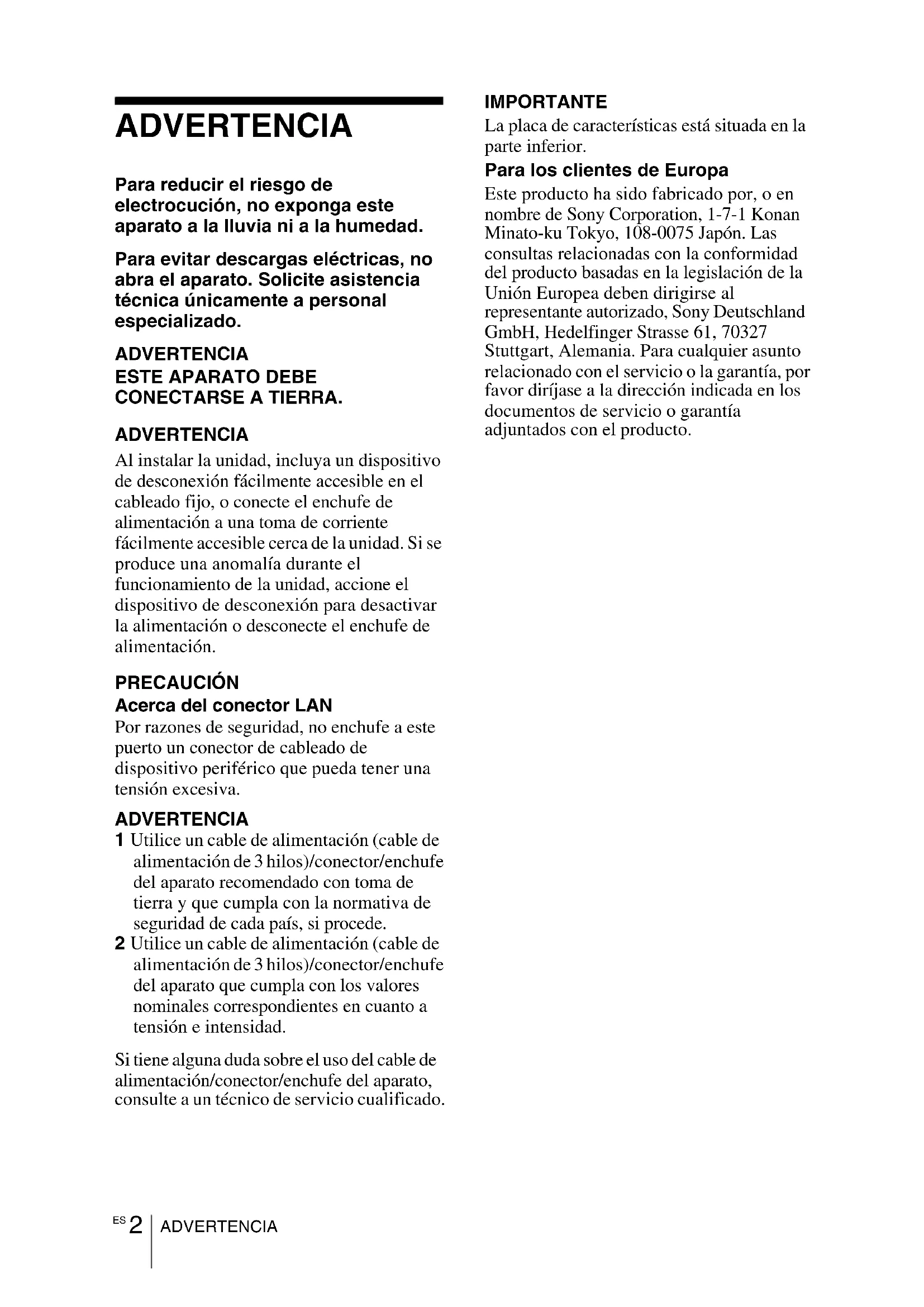 CONECTARSE A TIERRA. ADVERTENCIA Al instalar la unidad, incluya un dispositivo de desconexión fácilmente accesible en el cableado fijo, o conecte el enchufe de alimentación a una toma de corriente fácilmente accesible cerca de la unidad. Si se produce una anomalía durante el funcionamiento de la unidad, accione el dispositivo de desconexión para desactivar la alimentación o desconecte el enchufe de alimentación. PRECAUCIÓN Acerca del conector LAN Por razones de seguridad, no enchufe a este puerto un conector de cableado de dispositivo periférico que pueda tener una tensión excesiva. ADVERTENCIA 1 Utilice un cable de alimentación (cable de alimentación de 3 hilos)/conector/enchufe del aparato recomendado con toma de tierra y que cumpla con la normativa de seguridad de cada país, si procede. 2 Utilice un cable de alimentación (cable de alimentación de 3 hilos)/conector/enchufe del aparato que cumpla con los valores nominales correspondientes en cuanto a tensión e intensidad. Si tiene alguna duda sobre el uso del cable de alimentación/conector/enchufe del aparato, consulte a un técnico de servicio cualificado. IMPORTANTE La placa de características está situada en la parte inferior. Para los clientes de Europa Este producto ha sido fabricado por, o en nombre de Sony Corporation, 1-7-1 Konan Minato-ku Tokyo, 108-0075 Japón. Las consultas relacionadas con la conformidad del producto basadas en la legislación de la Unión Europea deben dirigirse al representante autorizado, Sony Deutschland GmbH, Hedelfinger Strasse 61, 70327 Stuttgart, Alemania. Para cualquier asunto relacionado con el servicio o la garantía, por favor diríjase a la dirección indicada en los documentos de servicio o garantía adjuntados con el producto.3
