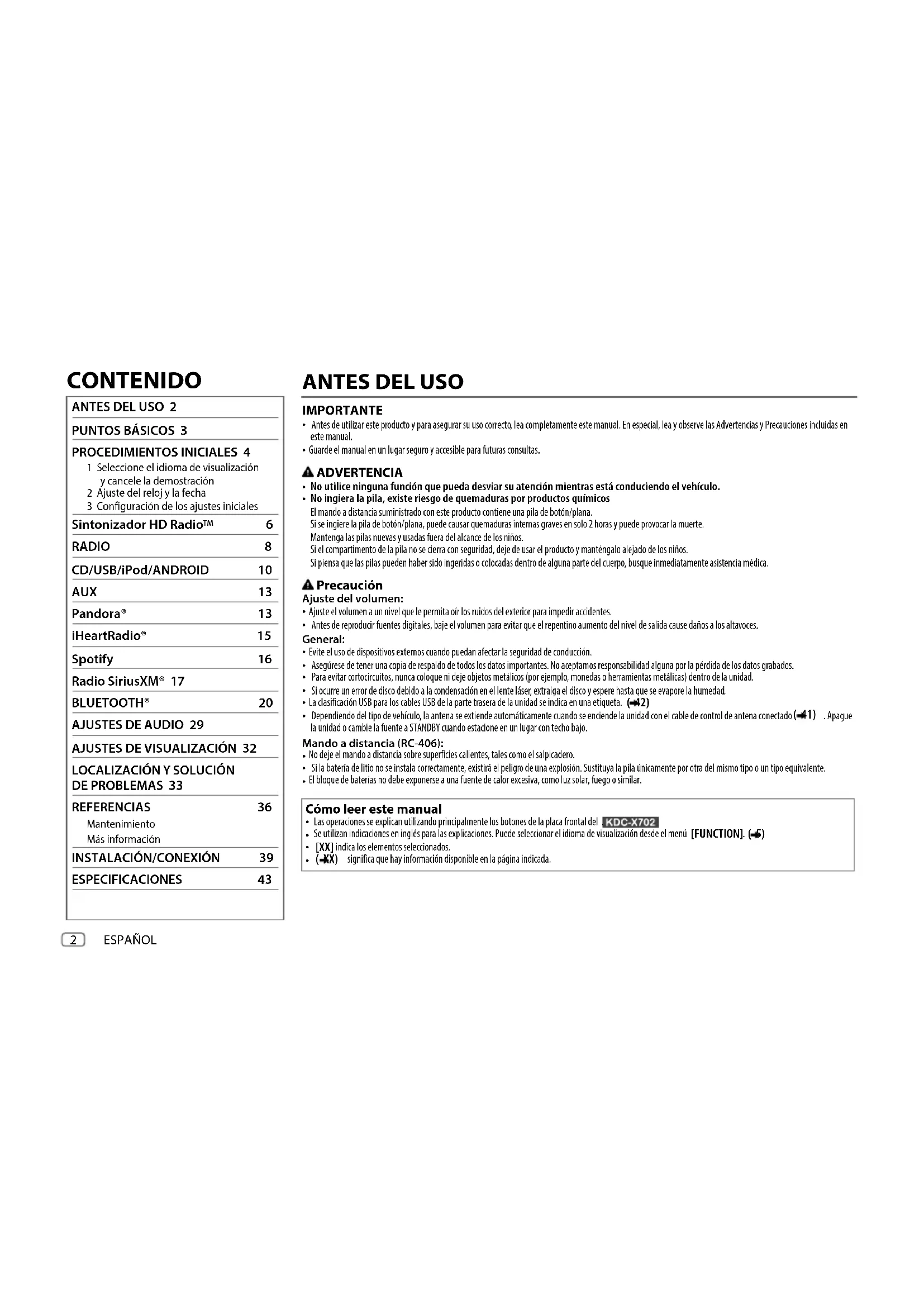 For your records Record the serial number, found on the back of the unit, in the spaces designated on the warranty card, and in the space provided below. Refer to the model and serial numbers whenever you call upon your Kenwood dealer for information or service on the product. Model KDC-X702/KDC-BT772HD/KMR-D772BT/KDC-X502/KDC-BT572U Serial number US Residents Only Register Online Register your Kenwood product at http://www.kenwood.com/usa/ B5A-2116-00 (KN)© 2017 JVC KENWOOD Corporation KDC-X502 KDC-BT572U JS_KWD_KDC_X702_KN_C_9.indd 1JS_KWD_KDC_X702_KN_C_9.indd 1 7/14/2017 2:19:52 PM7/14/2017 2:19:52 PMi Data Size: B6L (182 mm x 128 mm) Book Size: B6L (182 mm x 128 mm) Información acerca de la eliminación de equipos eléctricos y electrónicos al final de la vida útil (aplicable a los países que hayan adoptado sistemas independientes de recogida de residuos) Los productos con el símbolo de un contenedor con ruedas tachado no podrán ser desechados como residuos domésticos. Los equipos eléctricos y electrónicos al final de la vida útil, deberán ser reciclados en instalaciones que puedan dar el tratamiento adecuado a estos productos y a sus subproductos residuales correspondientes. Póngase en contacto con su administración local para obtener información sobre el punto de recogida más cercano. Un tratamiento correcto del reciclaje y la eliminación de residuos ayuda a conservar los recursos y evita al mismo tiempo efectos perjudiciales en la salud y el medio ambiente.