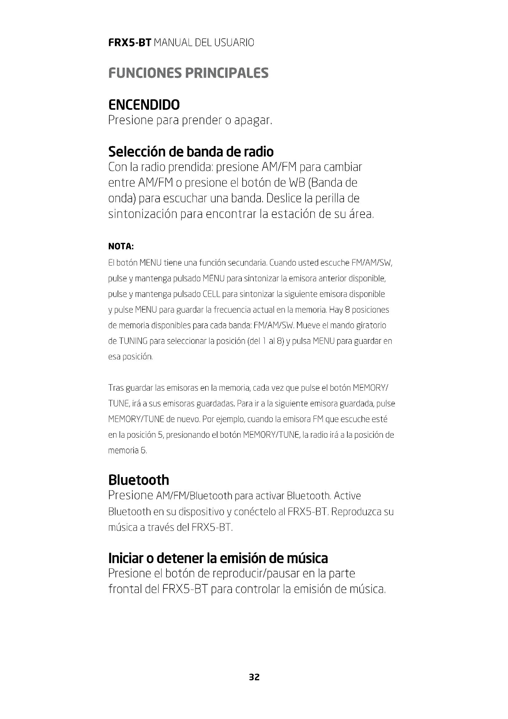 FUNCIONES PRINCIPALES ENCENDIDO Presione para prender o apagar. Selección de banda de radio Con la radio prendida: presione AM/FM para cambiar entre AM/FM o presione el botón de WB (Banda de onda) para escuchar una banda. Deslice la perilla de sintonización para encontrar la estación de su área. NOTA: El botón MENU tiene una función secundaria. Cuando usted escuche FM/AM/SW, pulse y mantenga pulsado MENU para sintonizar la emisora anterior disponible, pulse y mantenga pulsado CELL para sintonizar la siguiente emisora disponible y pulse MENU para guardar la frecuencia actual en la memoria. Hay 8 posiciones de memoria disponibles para cada banda: FM/AM/SW. Mueve el mando giratorio de TUNING para seleccionar la posición (del 1 al 8) y pulsa MENU para guardar en esa posición. Tras guardar las emisoras en la memoria, cada vez que pulse el botón MEMORY/ TUNE, irá a sus emisoras guardadas. Para ir a la siguiente emisora guardada, pulse MEMORY/TUNE de nuevo. Por ejemplo, cuando la emisora FM que escuche esté en la posición 5, presionando el botón MEMORY/TUNE, la radio irá a la posición de memoria 6. Bluetooth Presione AM/FM/Bluetooth para activar Bluetooth. Active Bluetooth en su dispositivo y conéctelo al FRX5-BT. Reproduzca su música a través del FRX5-BT. Iniciar o detener la emisión de música Presione el botón de reproducir/pausar en la parte frontal del FRX5-BT para controlar la emisión de música.FRX5-BT MANUAL DEL USUARIO