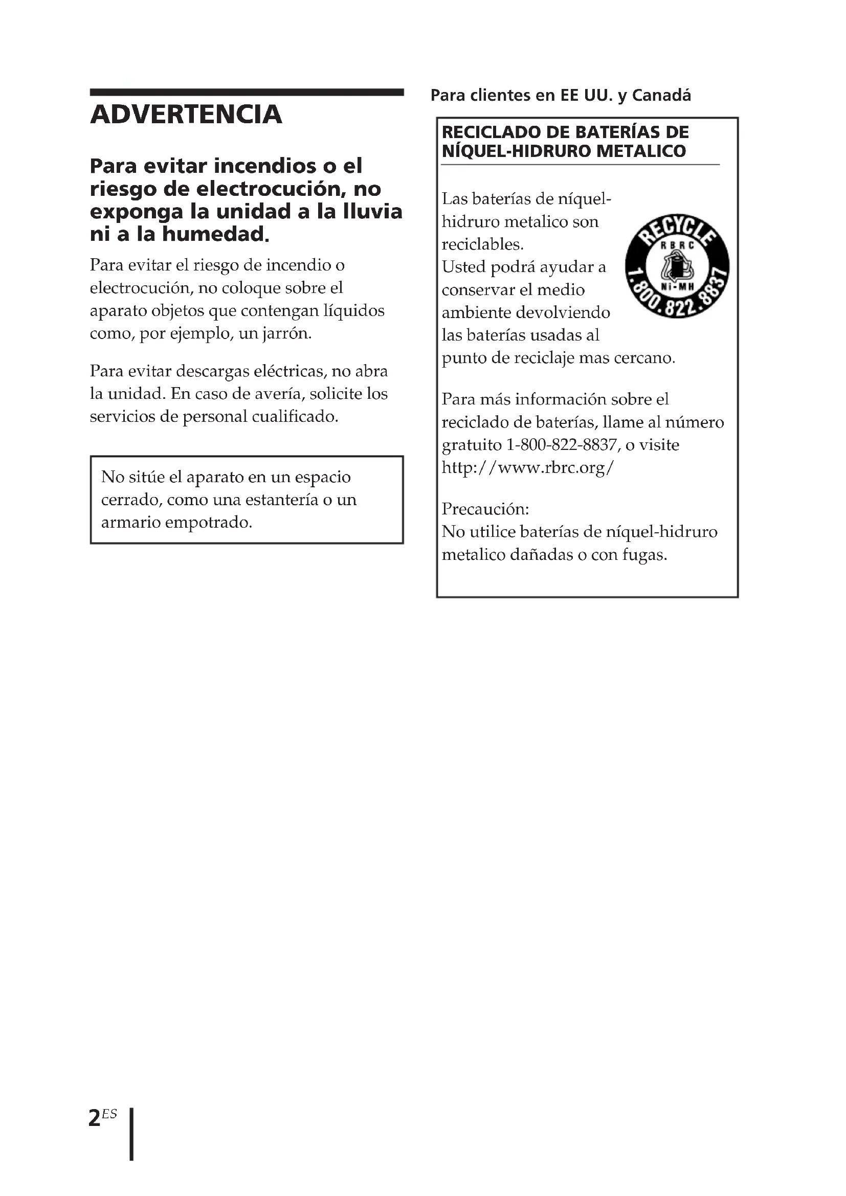 Las baterías de níquel- hidruro metalico son reciclables. Usted podrá ayudar a conservar el medio ambiente devolviendo las baterías usadas al punto de reciclaje mas cercano. Para más información sobre el reciclado de baterías, llame al número gratuito 1-800-822-8837, o visite http://www.rbrc.org/ Precaución: No utilice baterías de níquel-hidruro metalico dañadas o con fugas. ADVERTENCIA Para evitar incendios o el riesgo de electrocución, no exponga la unidad a la lluvia ni a la humedad
