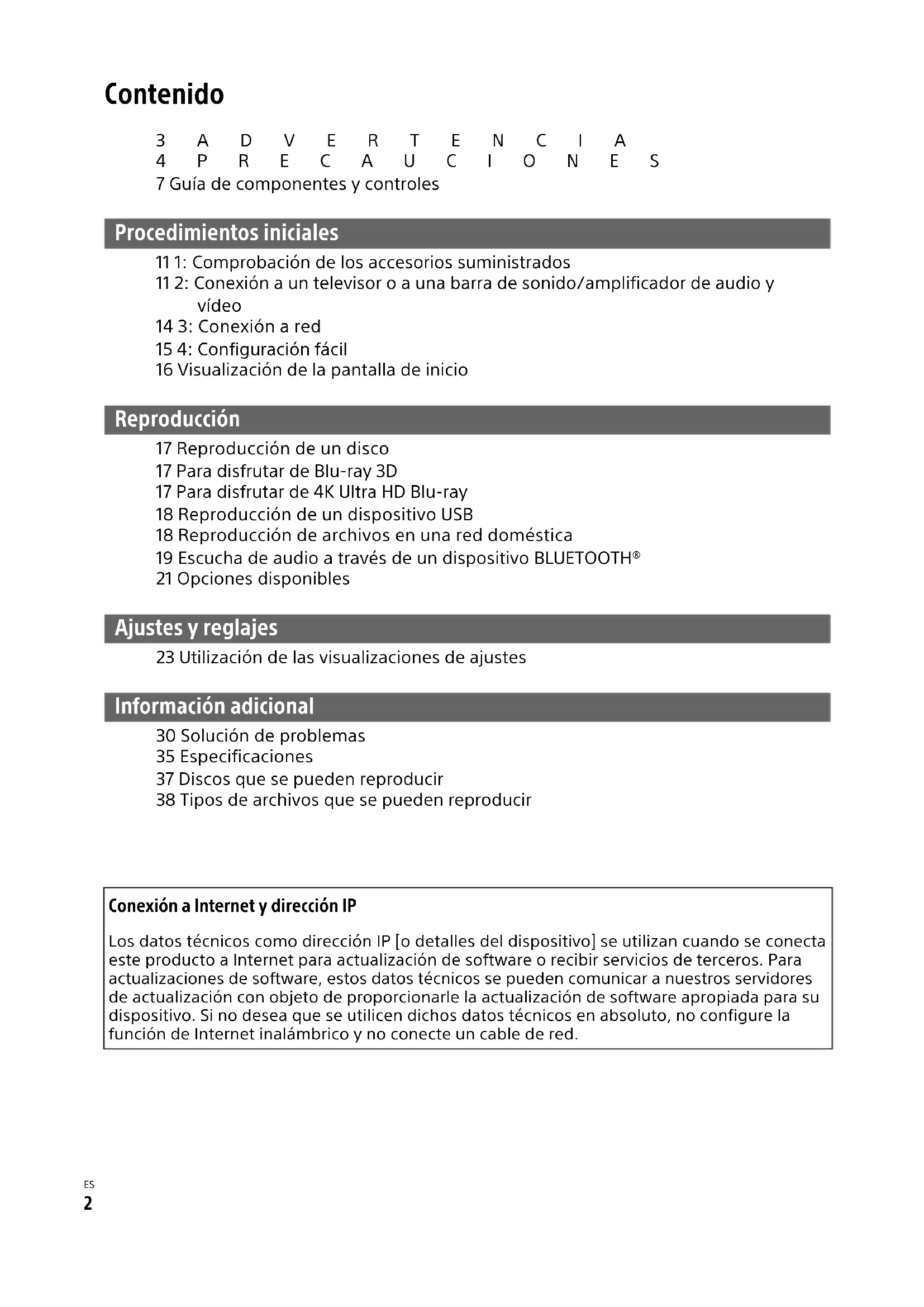 Contenido 3ADVERTENCIA 4PRECAUCIONES 7 Guía de componentes y controles Procedimientos iniciales 11 1: Comprobación de los accesorios suministrados 11 2: Conexión a un televisor o a una barra de sonido/amplificador de audio y vídeo 14 3: Conexión a red 15 4: Configuración fácil 16 Visualización de la pantalla de inicio Reproducción 17 Reproducción de un disco 17 Para disfrutar de Blu-ray 3D 17 Para disfrutar de 4K Ultra HD Blu-ray 18 Reproducción de un dispositivo USB 18 Reproducción de archivos en una red doméstica 19 Escucha de audio a través de un dispositivo BLUETOOTH® 21 Opciones disponibles Ajustes y reglajes 23 Utilización de las visualizaciones de ajustes Información adicional 30 Solución de problemas 35 Especificaciones 37 Discos que se pueden reproducir 38 Tipos de archivos que se pueden reproducir Conexión a Internet y dirección IP Los datos técnicos como dirección IP [o detalles del dispositivo] se utilizan cuando se conecta este producto a Internet para actualización de software o recibir servicios de terceros. Para actualizaciones de software, estos datos técnicos se pueden comunicar a nuestros servidores de actualización con objeto de proporcionarle la actualización de software apropiada para su dispositivo. Si no desea que se utilicen dichos datos técnicos en absoluto, no configure la función de Internet inalámbrico y no conecte un cable de red.3