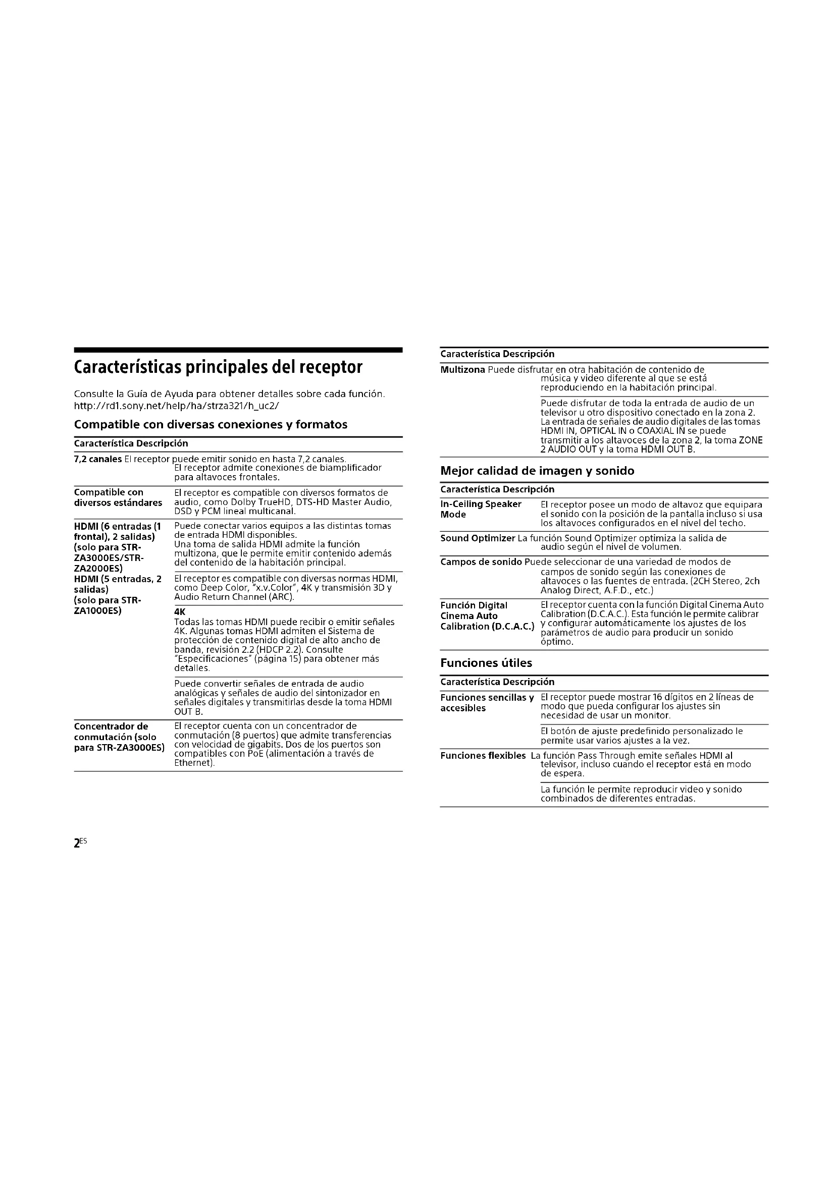 Todas las tomas HDMI puede recibir o emitir señales 4K. Algunas tomas HDMI admiten el Sistema de protección de contenido digital de alto ancho de banda, revisión 2.2 (HDCP 2.2). Consulte “Especificaciones” (página 15) para obtener más detalles. Puede convertir señales de entrada de audio analógicas y señales de audio del sintonizador en señales digitales y transmitirlas desde la toma HDMI OUT B. Concentrador de conmutación (solo para STR-ZA3000ES) El receptor cuenta con un concentrador de conmutación (8 puertos) que admite transferencias con velocidad de gigabits. Dos de los puertos son compatibles con PoE (alimentación a través de Ethernet). Multizona Puede disfrutar en otra habitación de contenido de música y video diferente al que se está reproduciendo en la habitación principal. Puede disfrutar de toda la entrada de audio de un televisor u otro dispositivo conectado en la zona 2. La entrada de señales de audio digitales de las tomas HDMI IN, OPTICAL IN o COAXIAL IN se puede transmitir a los altavoces de la zona 2, la toma ZONE 2 AUDIO OUT y la toma HDMI OUT B. Característica Descripción In-Ceiling Speaker Mode El receptor posee un modo de altavoz que equipara el sonido con la posición de la pantalla incluso si usa los altavoces configurados en el nivel del techo. Sound Optimizer La función Sound Optimizer optimiza la salida de audio según el nivel de volumen. Campos de sonido Puede seleccionar de una variedad de modos de campos de sonido según las conexiones de altavoces o las fuentes de entrada. (2CH Stereo, 2ch Analog Direct, A.F.D., etc.) Función Digital Cinema Auto Calibration (D.C.A.C.) El receptor cuenta con la función Digital Cinema Auto Calibration (D.C.A.C.). Esta función le permite calibrar y configurar automáticamente los ajustes de los parámetros de audio para producir un sonido óptimo. Característica Descripción Funciones sencillas y accesibles El receptor puede mostrar 16 dígitos en 2 líneas de modo que pueda configurar los ajustes sin necesidad de usar un monitor. El botón de ajuste predefinido personalizado le permite usar varios ajustes a la vez. Funciones flexibles La función Pass Through emite señales HDMI al televisor, incluso cuando el receptor está en modo de espera. La función le permite reproducir video y sonido combinados de diferentes entradas. Característica Descripción3